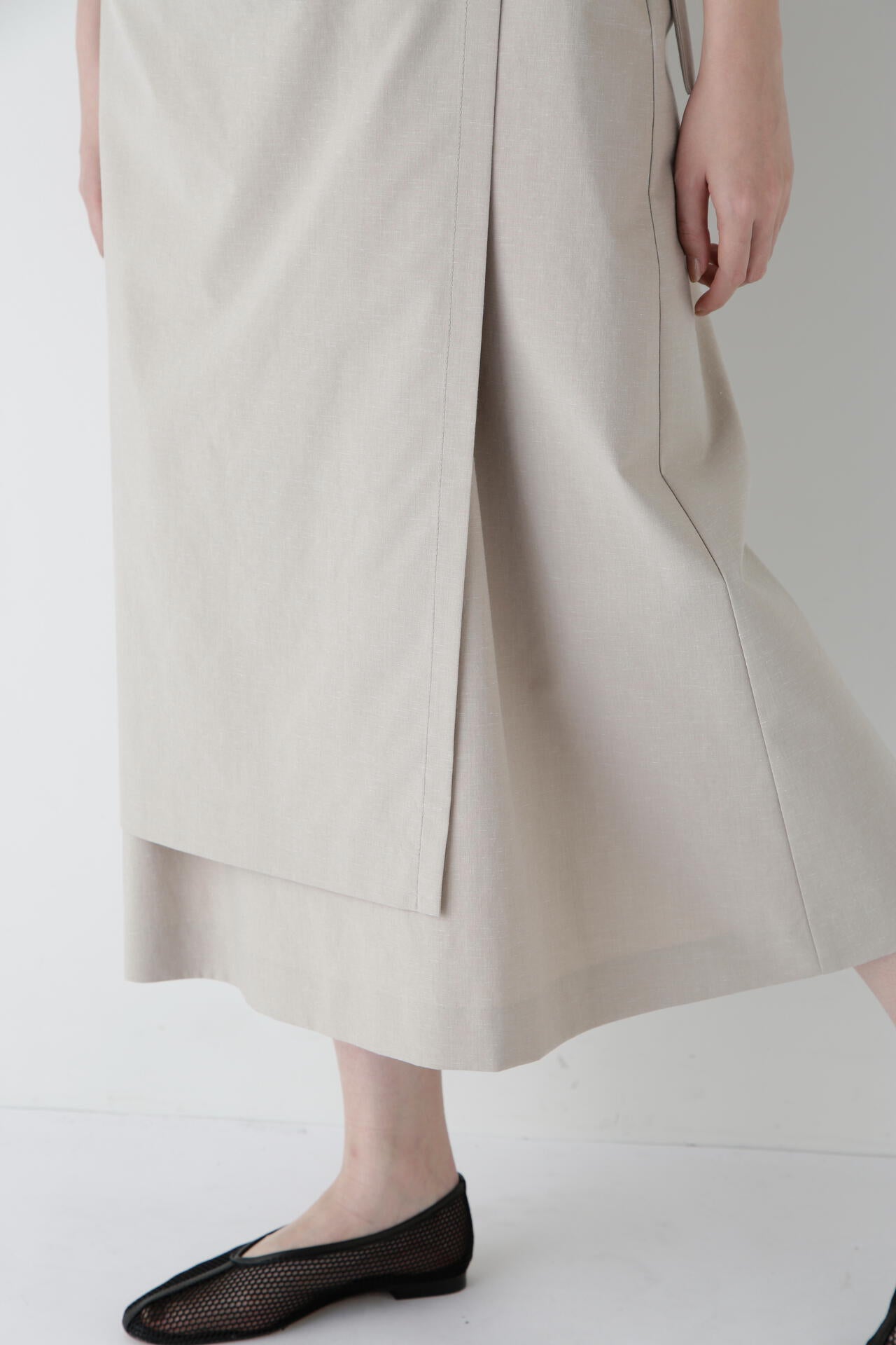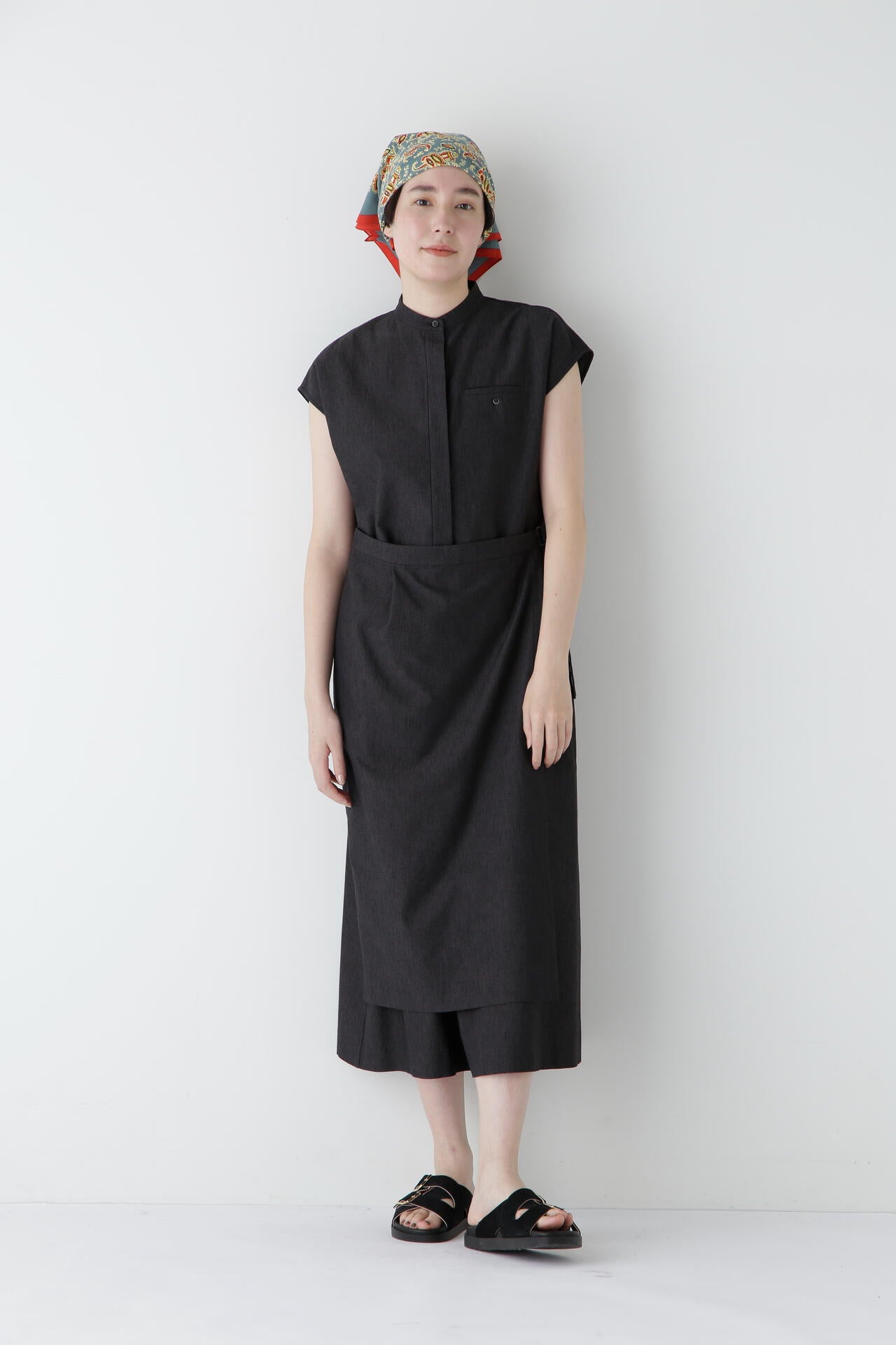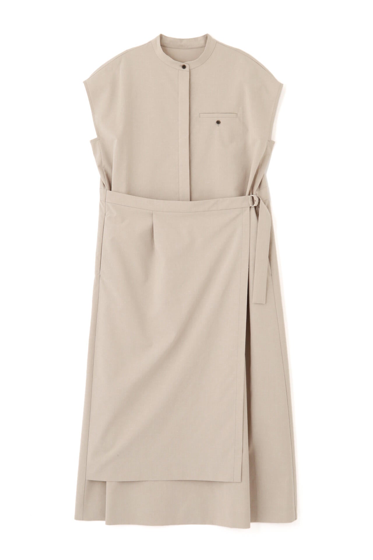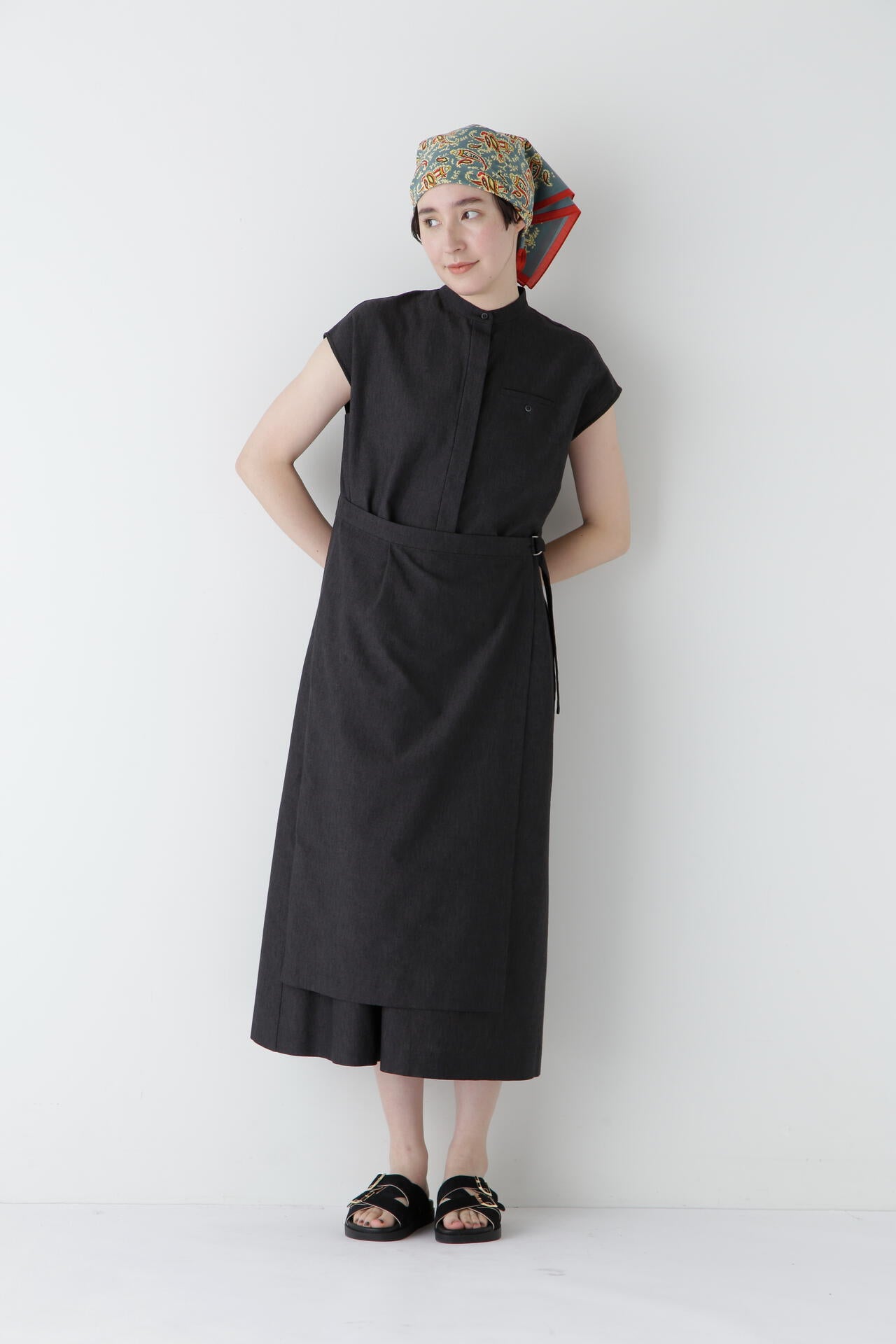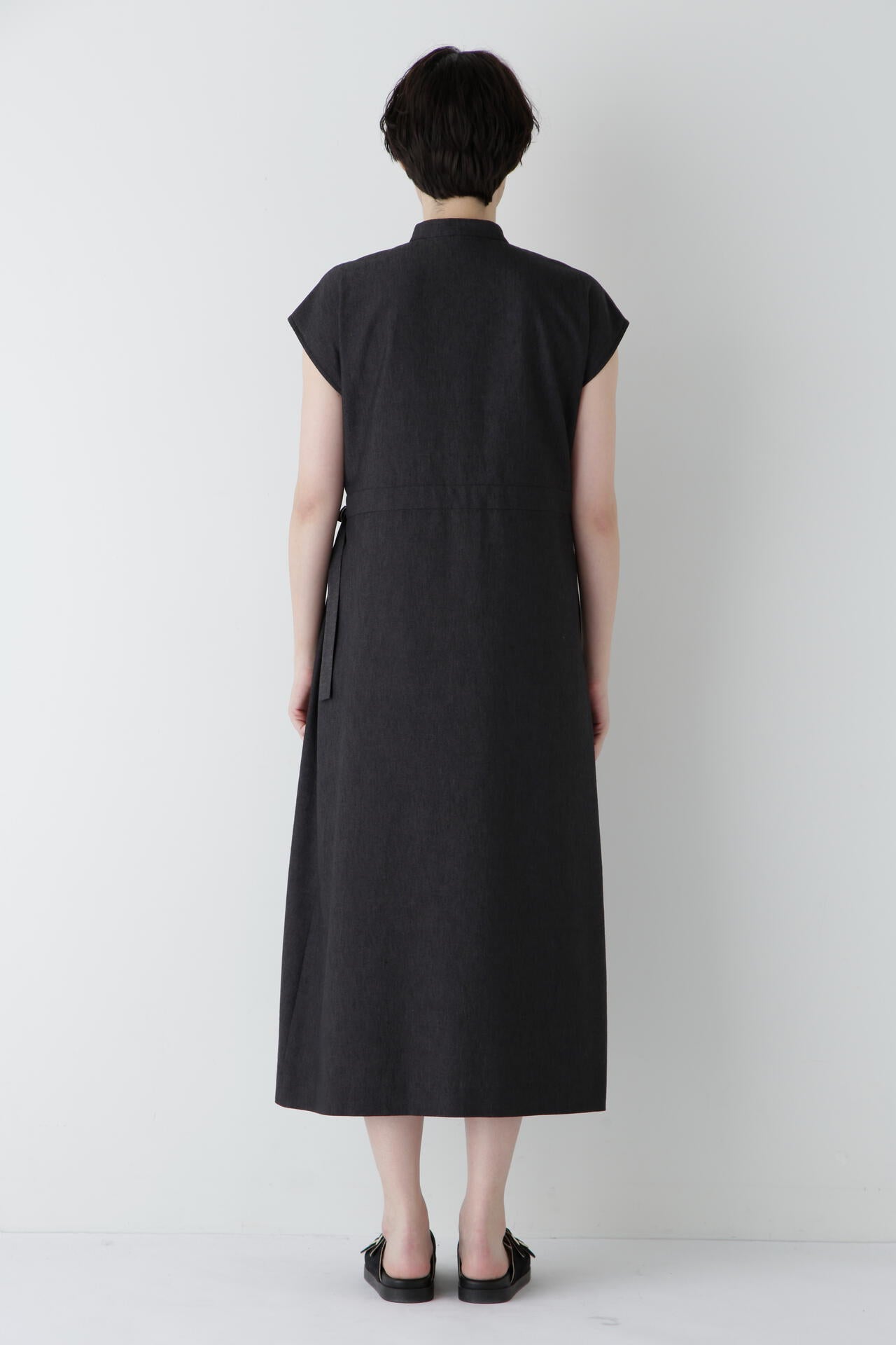 スカート部分の巻き風のデザインがまるでセットアップを着ているように見えるワンピースです。前が途中あきの前立てデザインにトラッド感のあるディテールを盛り込んでポイントにしています。
