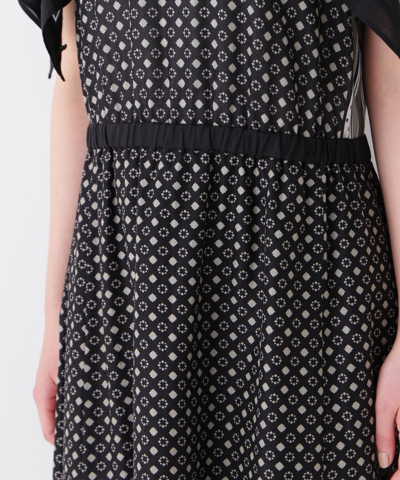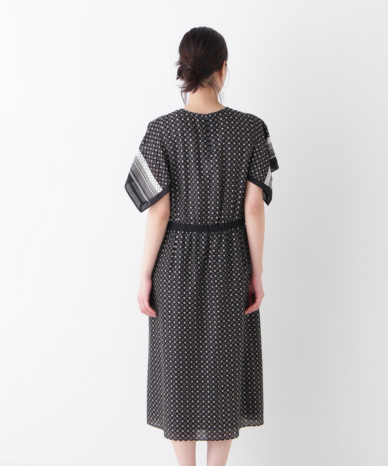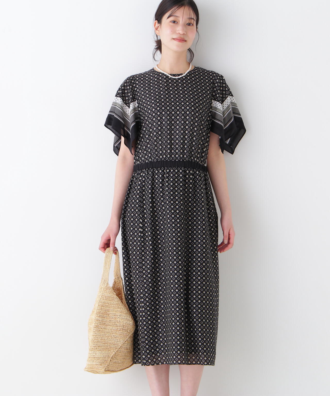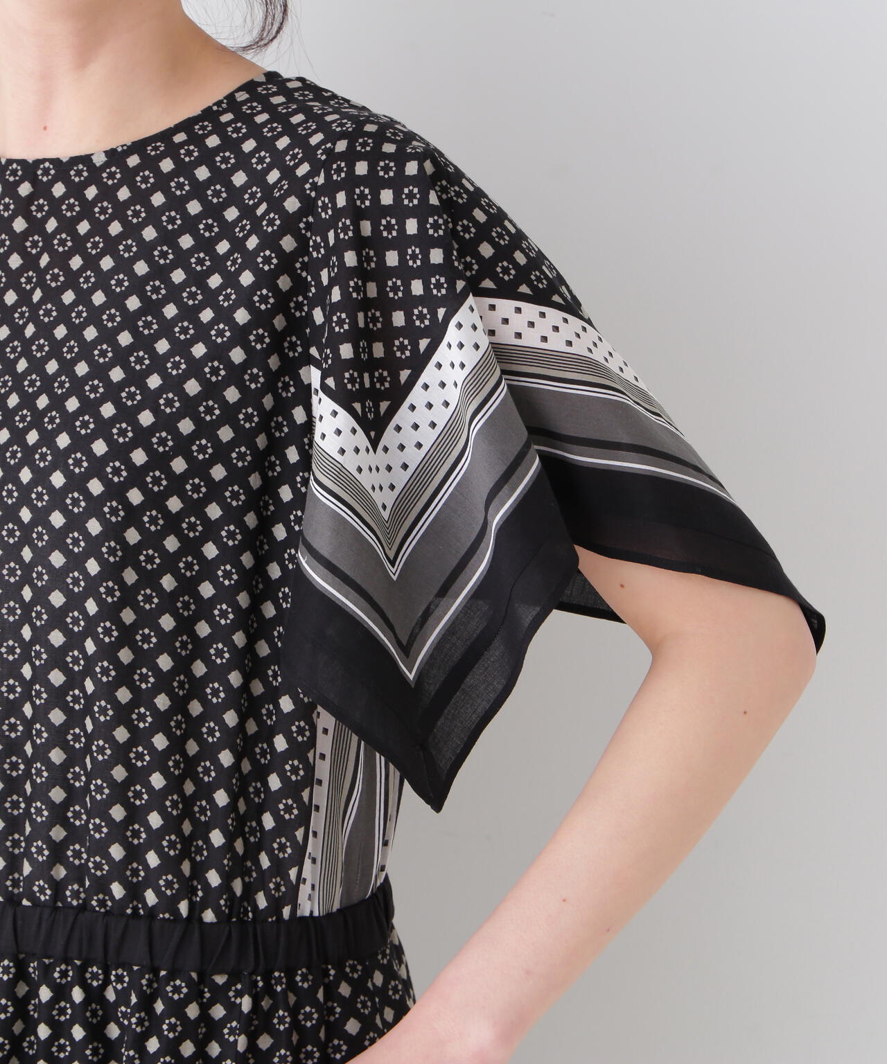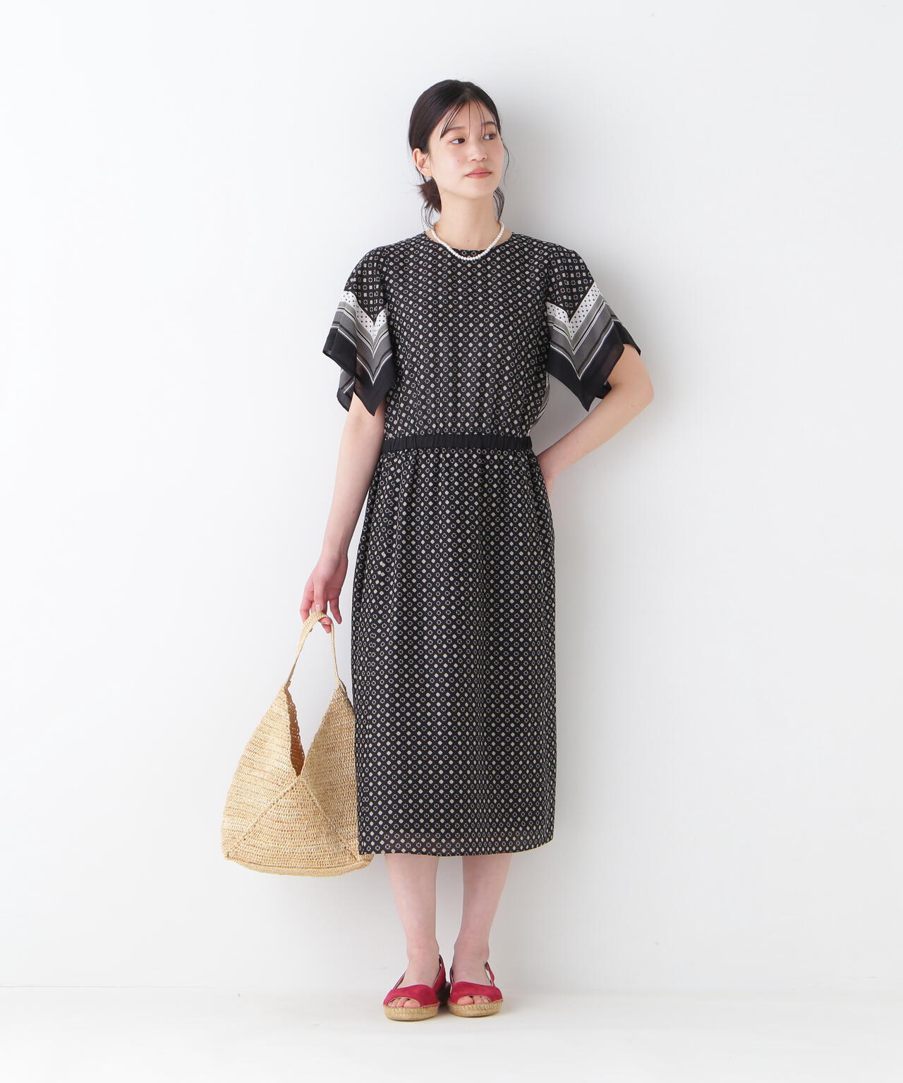 パネル幾何柄を効かせた涼し気なフレアースリーブがポイントのクルーネックワンピースです。