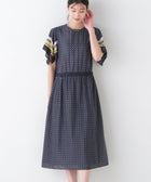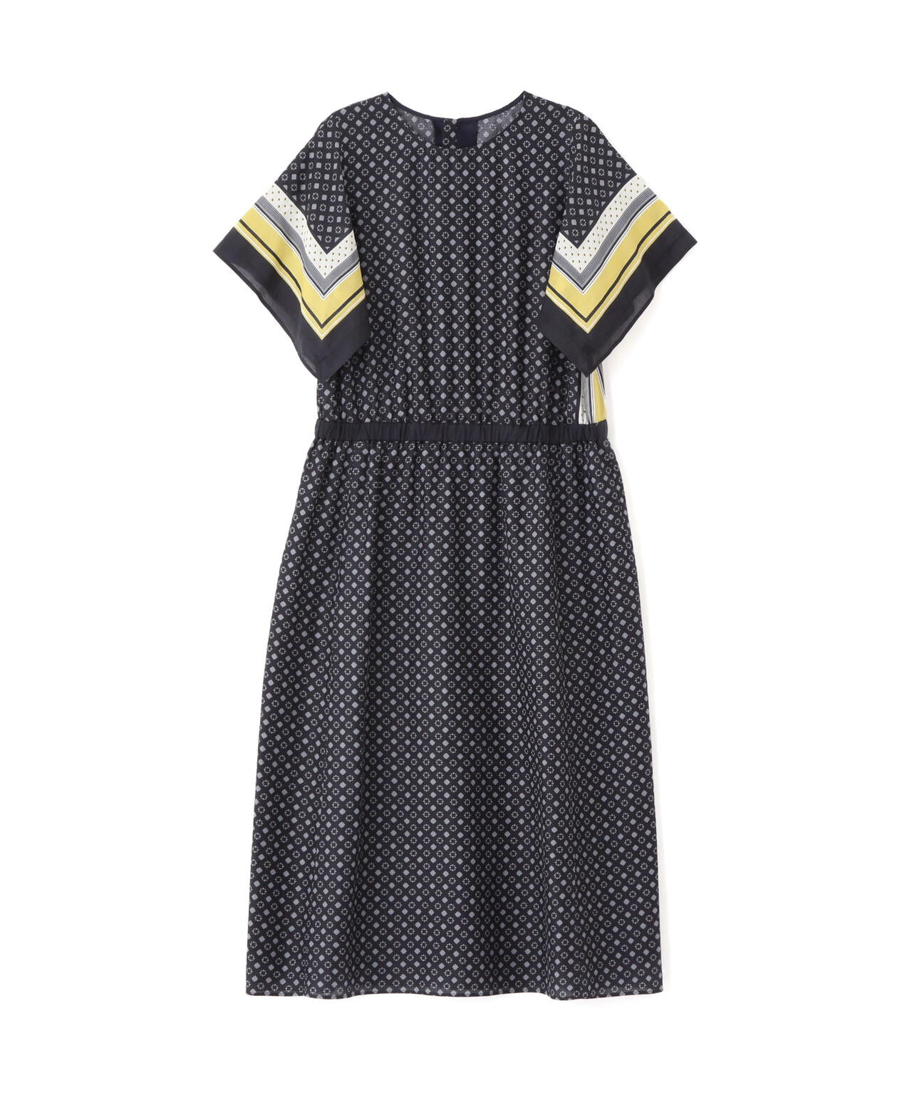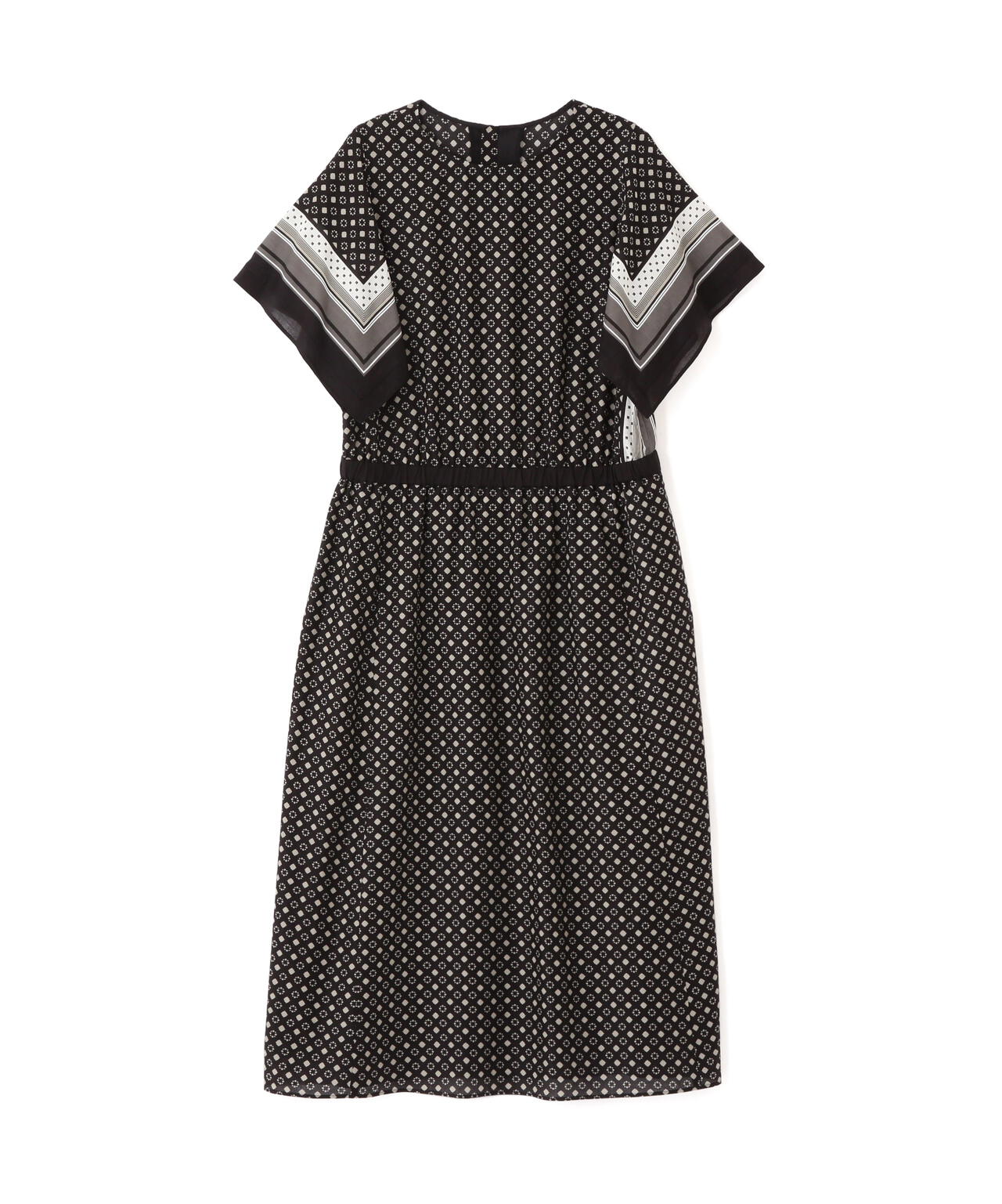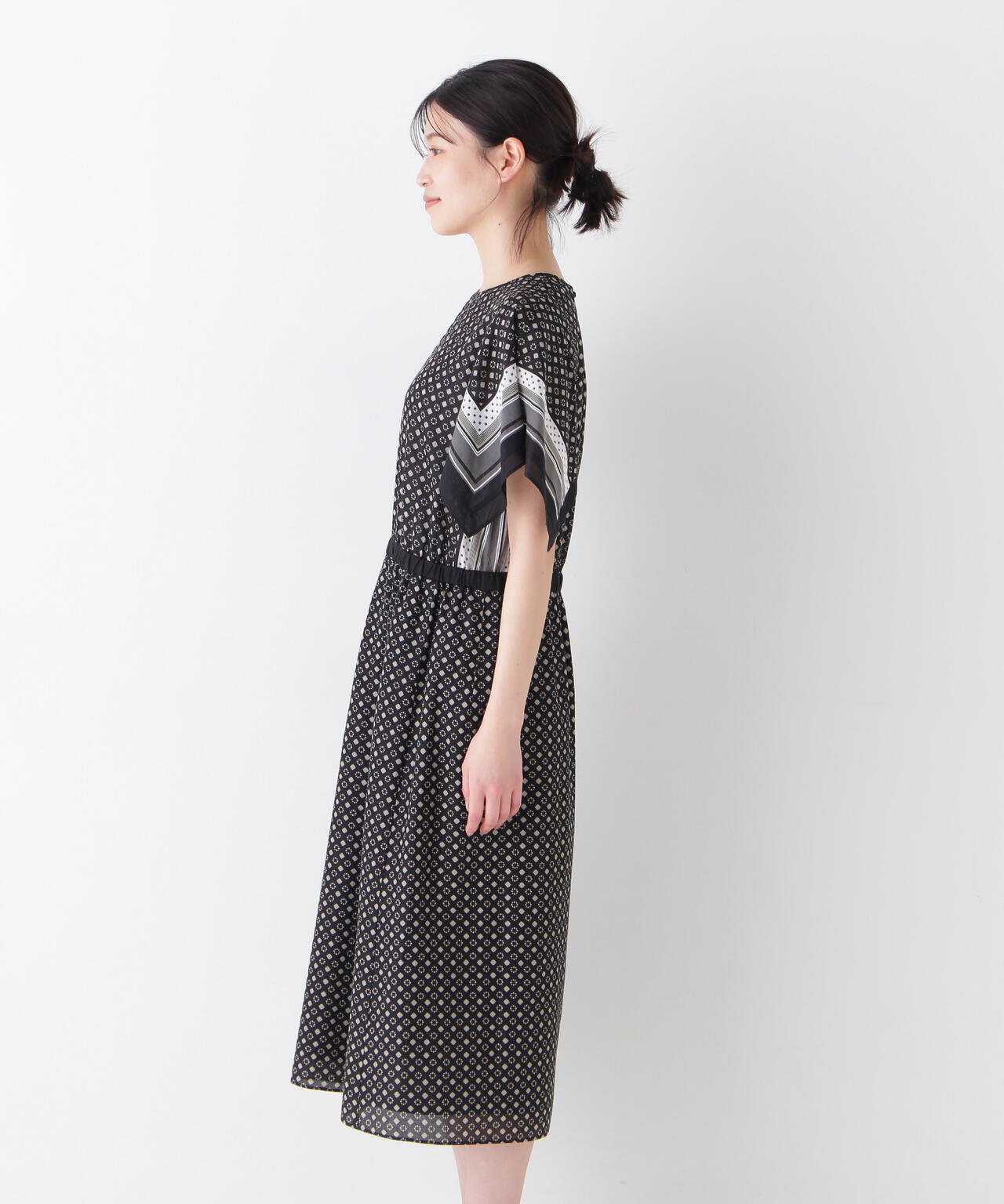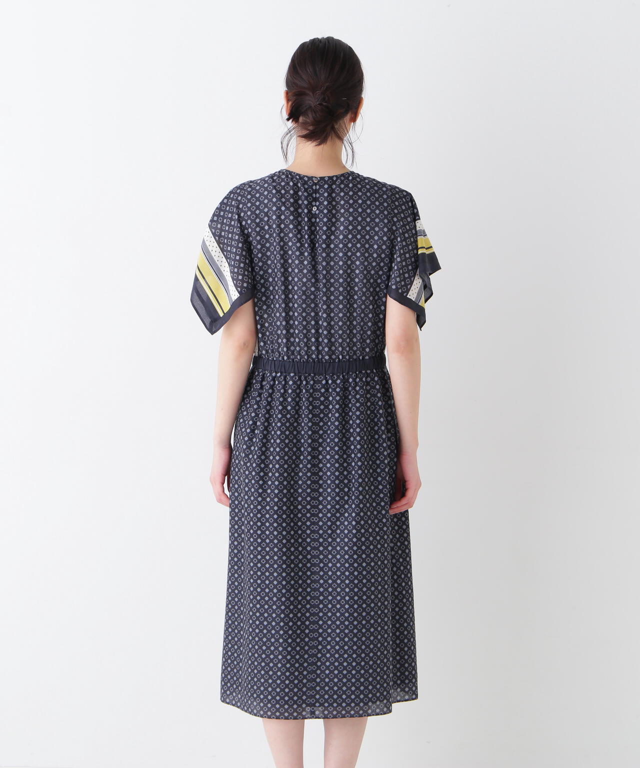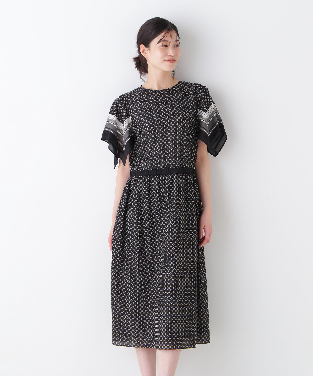 パネル幾何柄を効かせた涼し気なフレアースリーブがポイントのクルーネックワンピースです。
