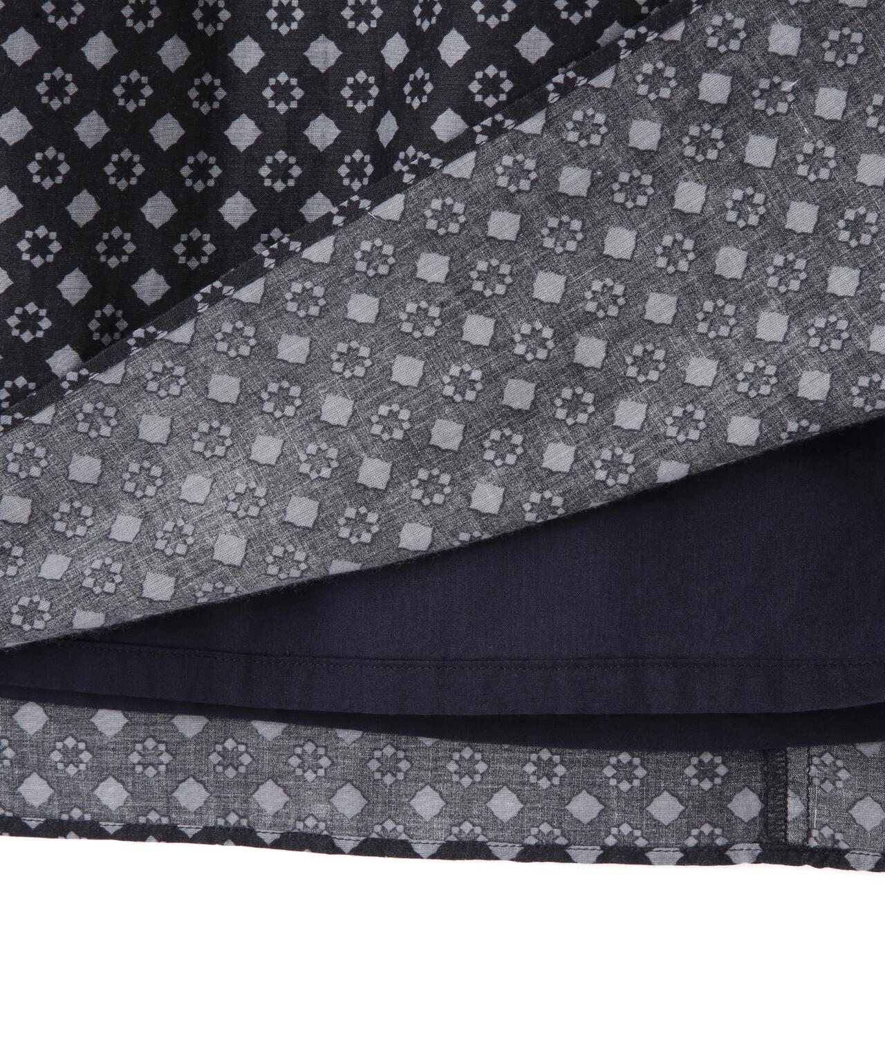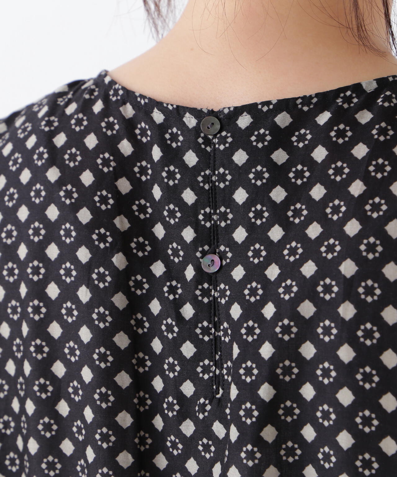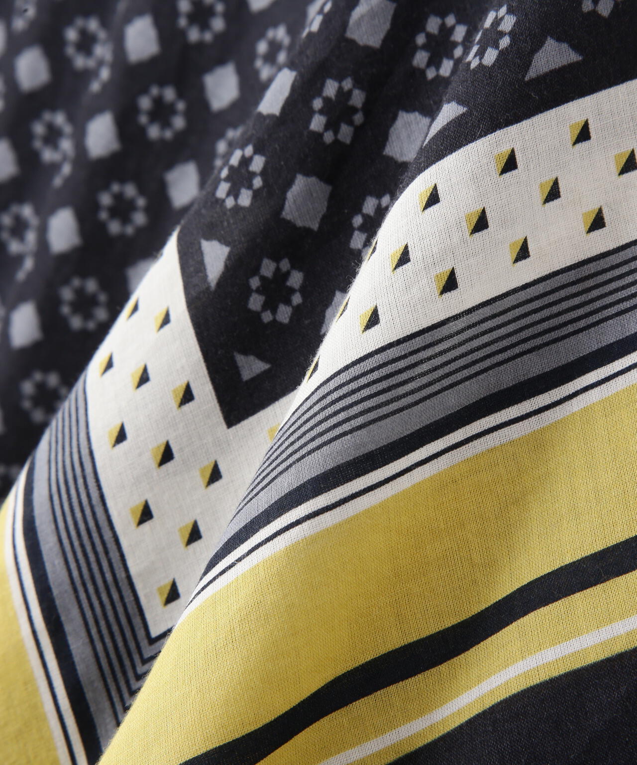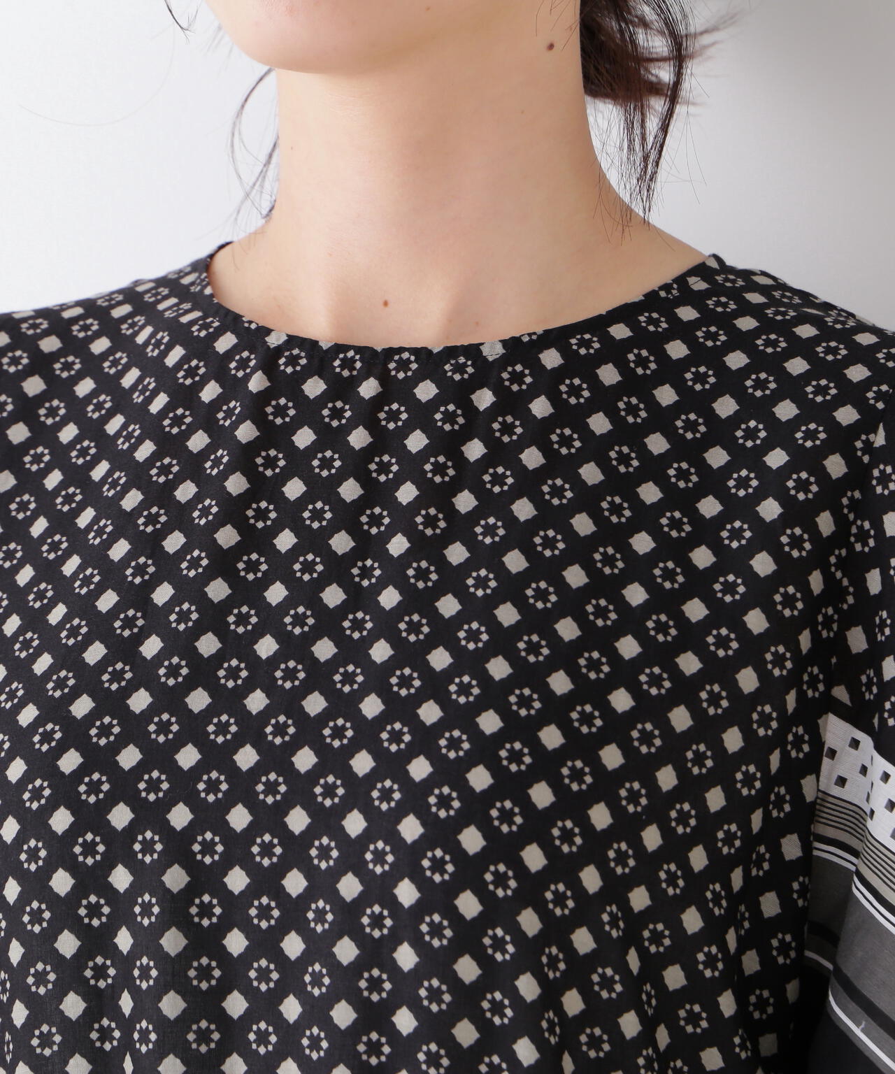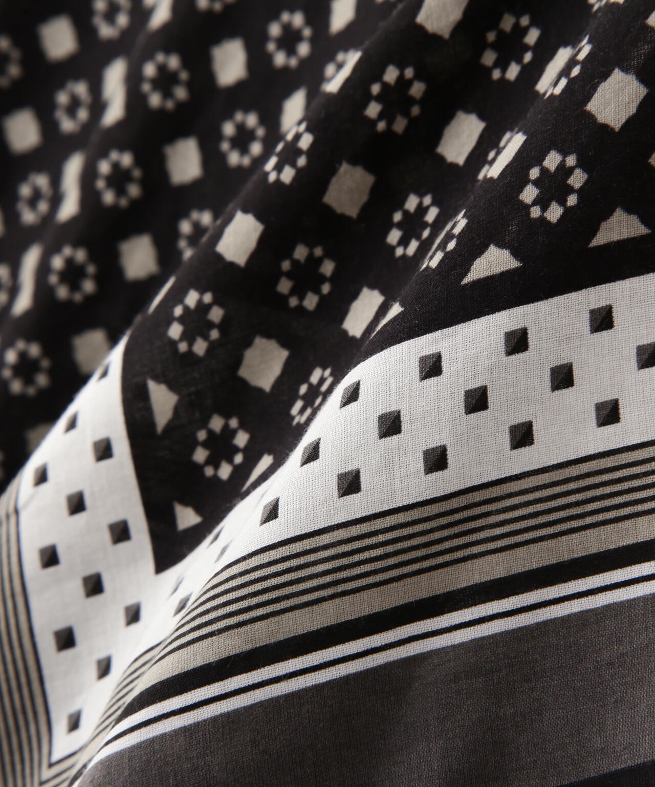 オリジナルプリント企画です。今年らしいパネル幾何柄を程よい落ち感のあるコットンセルロース素材にプリントしています。