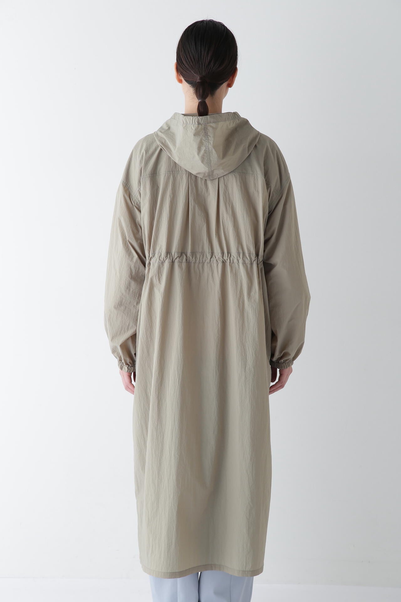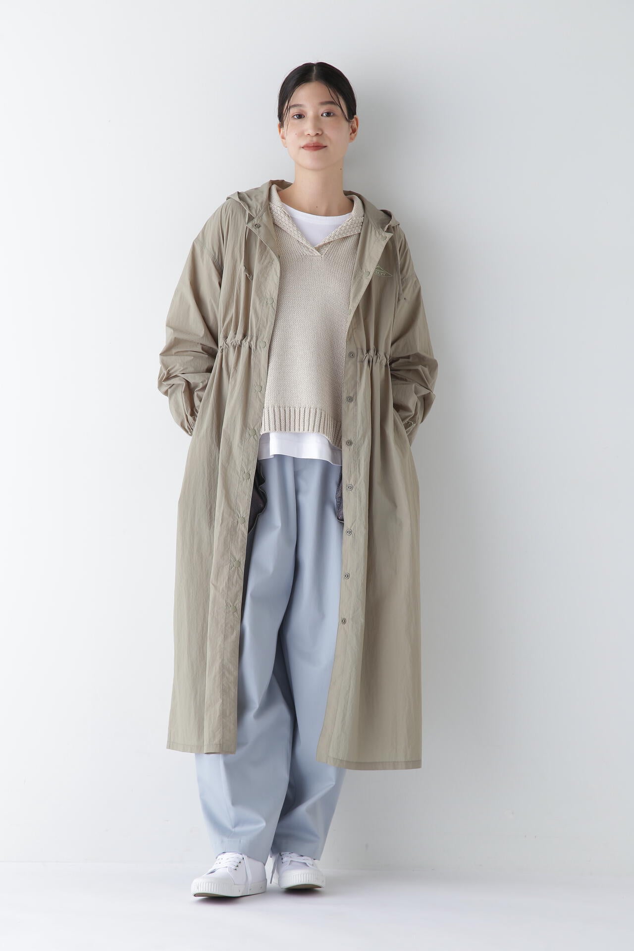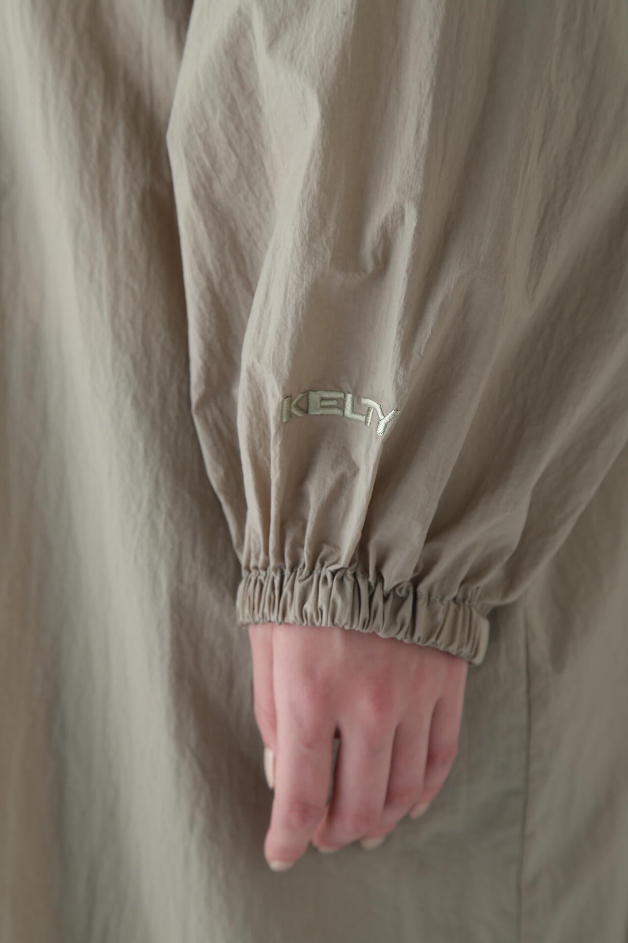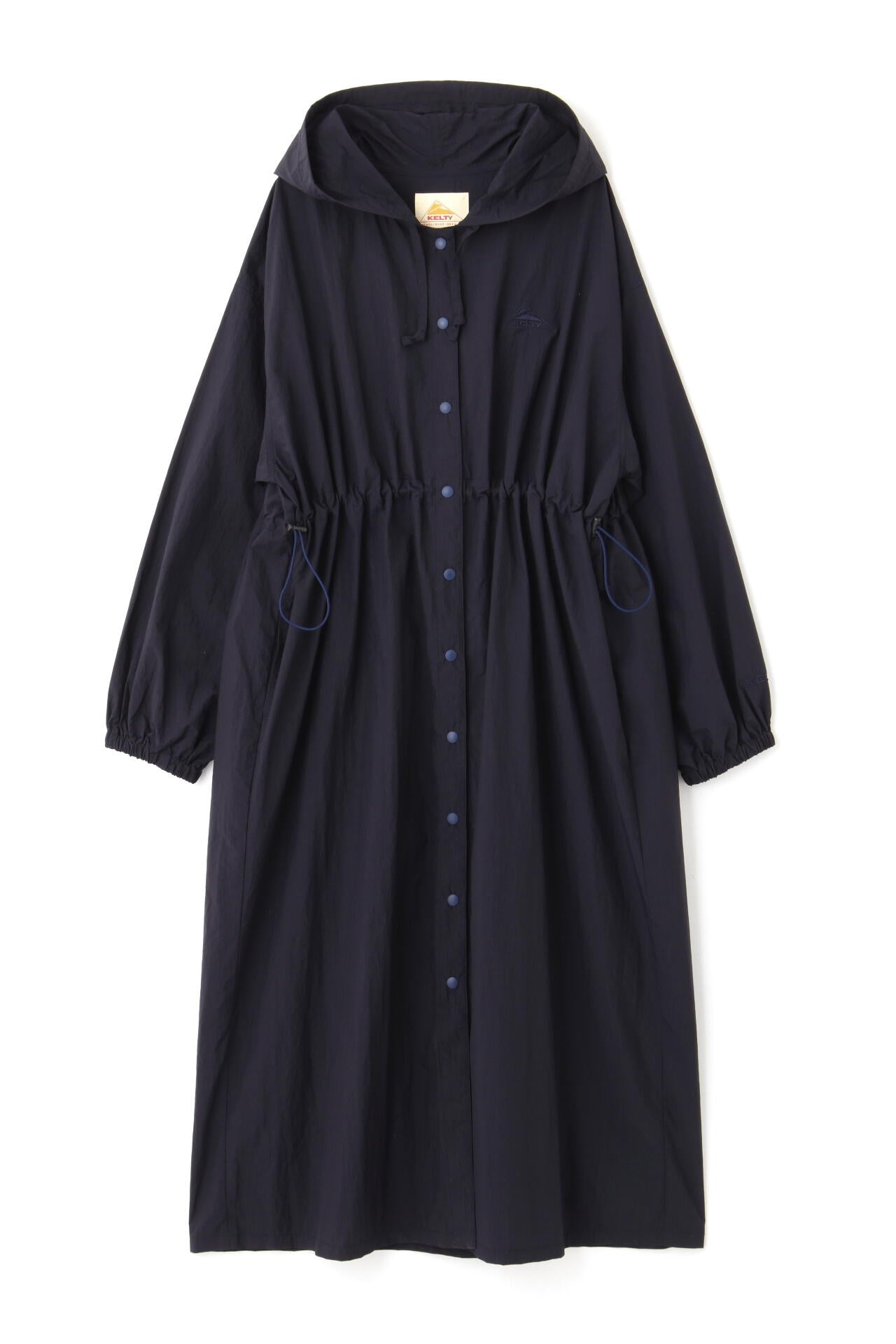 「KELTY」とのコラボフーディーワンピースコートです。元は短丈のブラウス風フーディー羽織だったデザインをロング丈に別注しました。ややゆったりしたシルエットとウェストのブラウジングでシルエット変化も楽しめます。カラーと刺繍色は別注です。