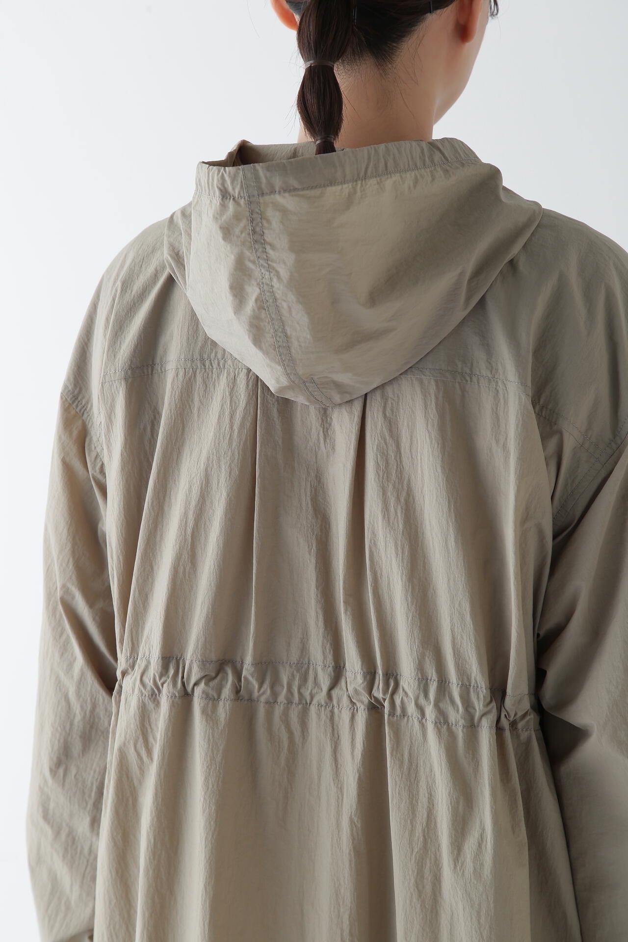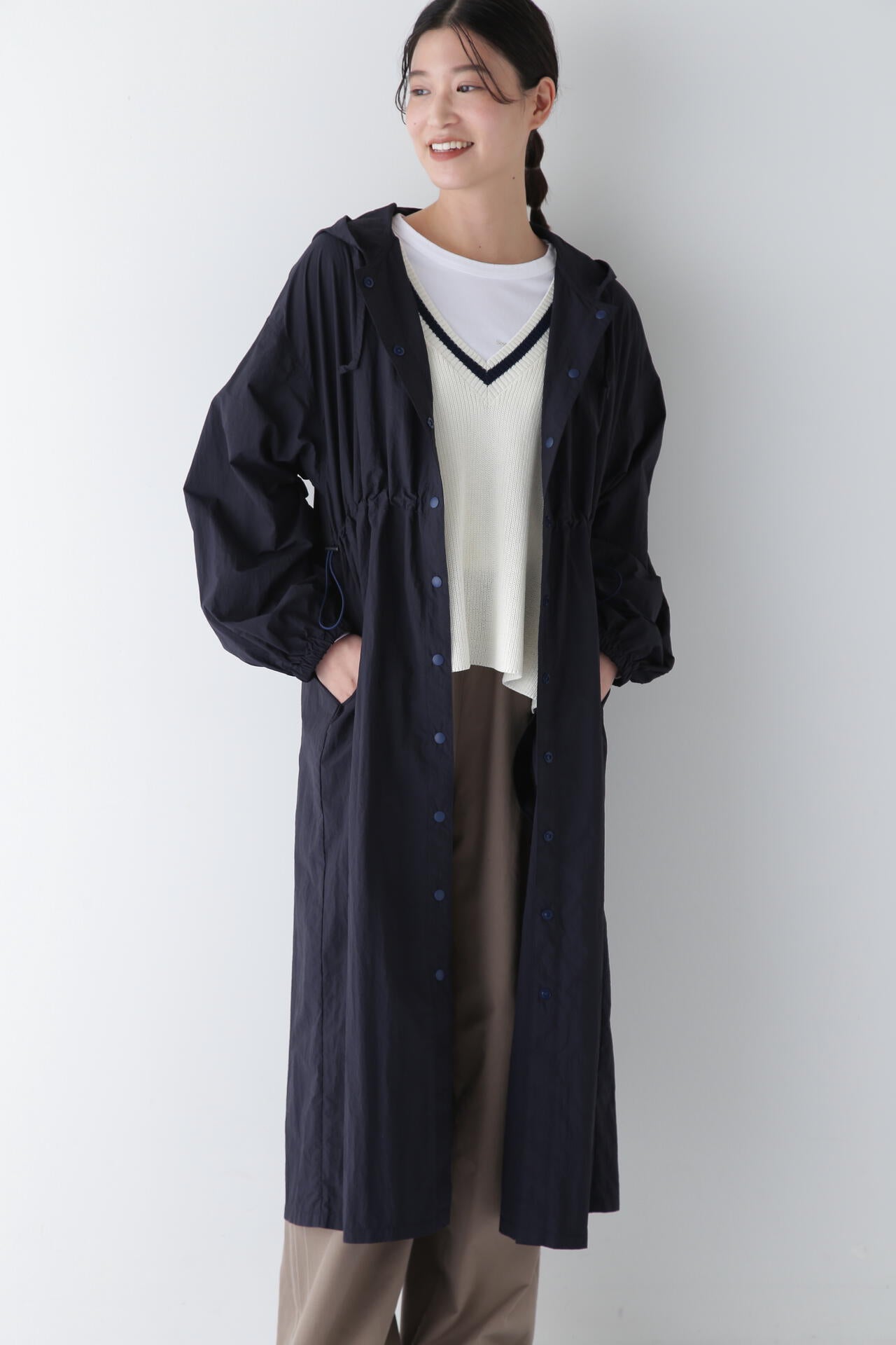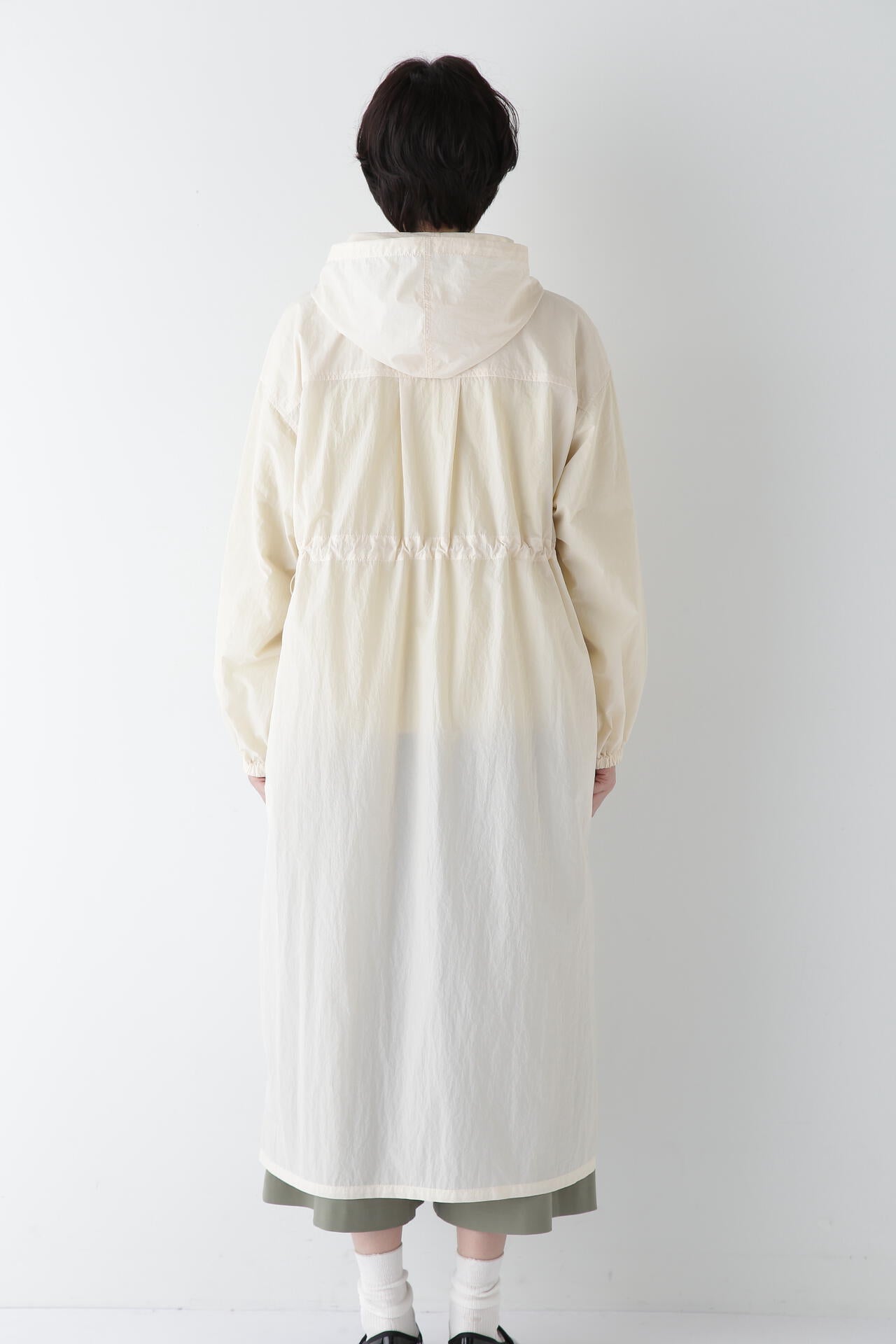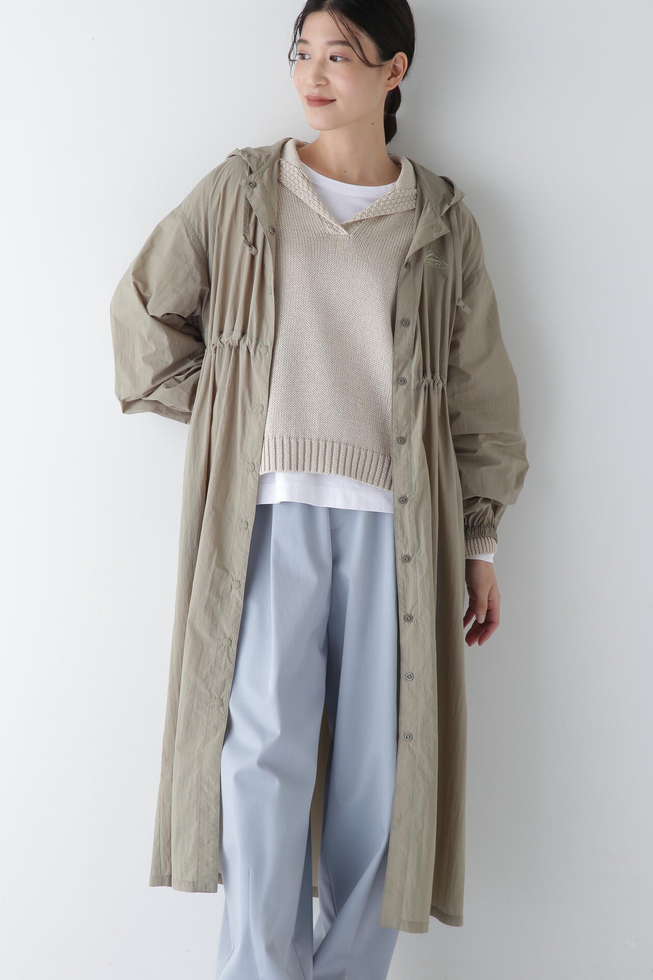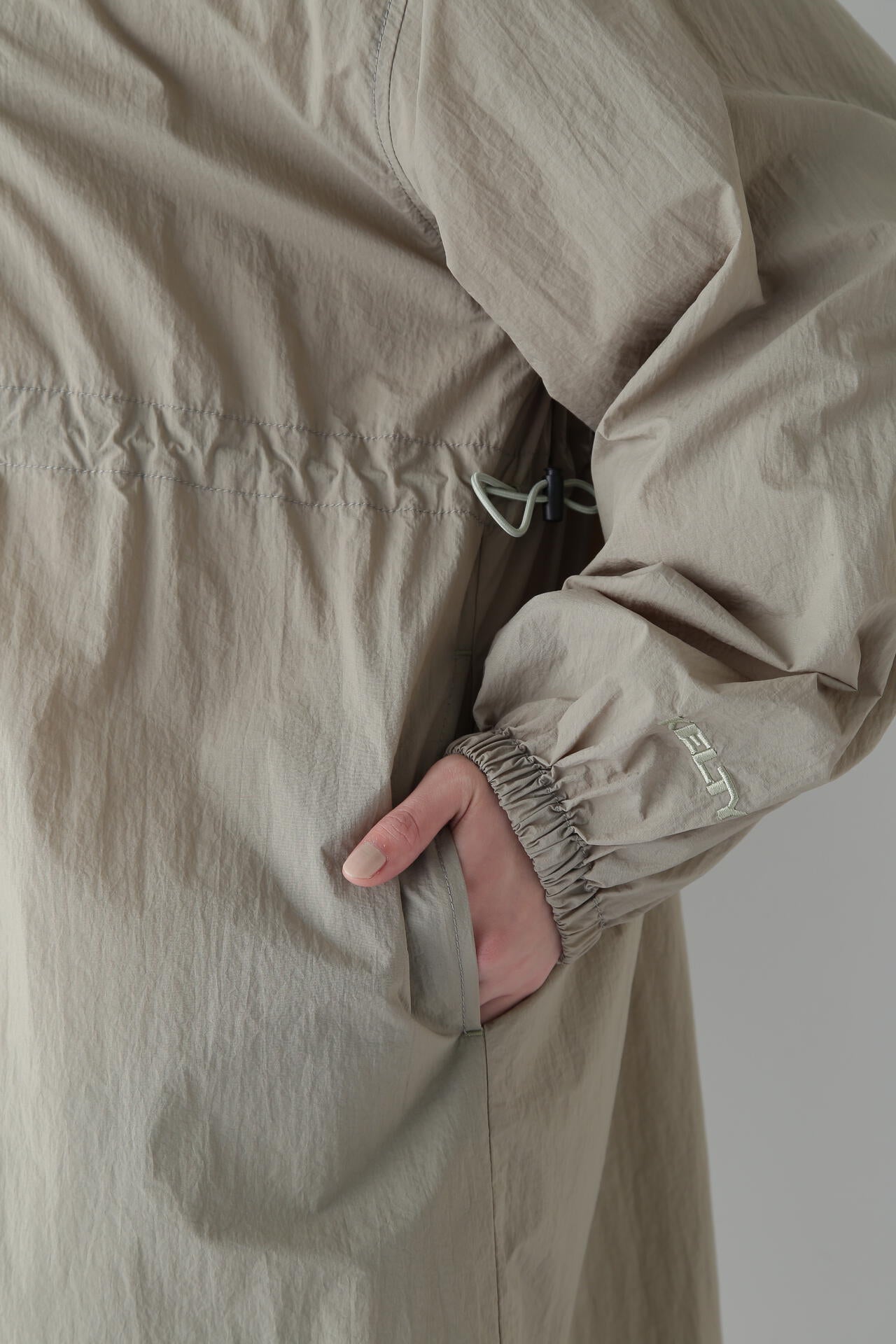 「KELTY」とのコラボフーディーワンピースコートです。元は短丈のブラウス風フーディー羽織だったデザインをロング丈に別注しました。ややゆったりしたシルエットとウェストのブラウジングでシルエット変化も楽しめます。カラーと刺繍色は別注です。