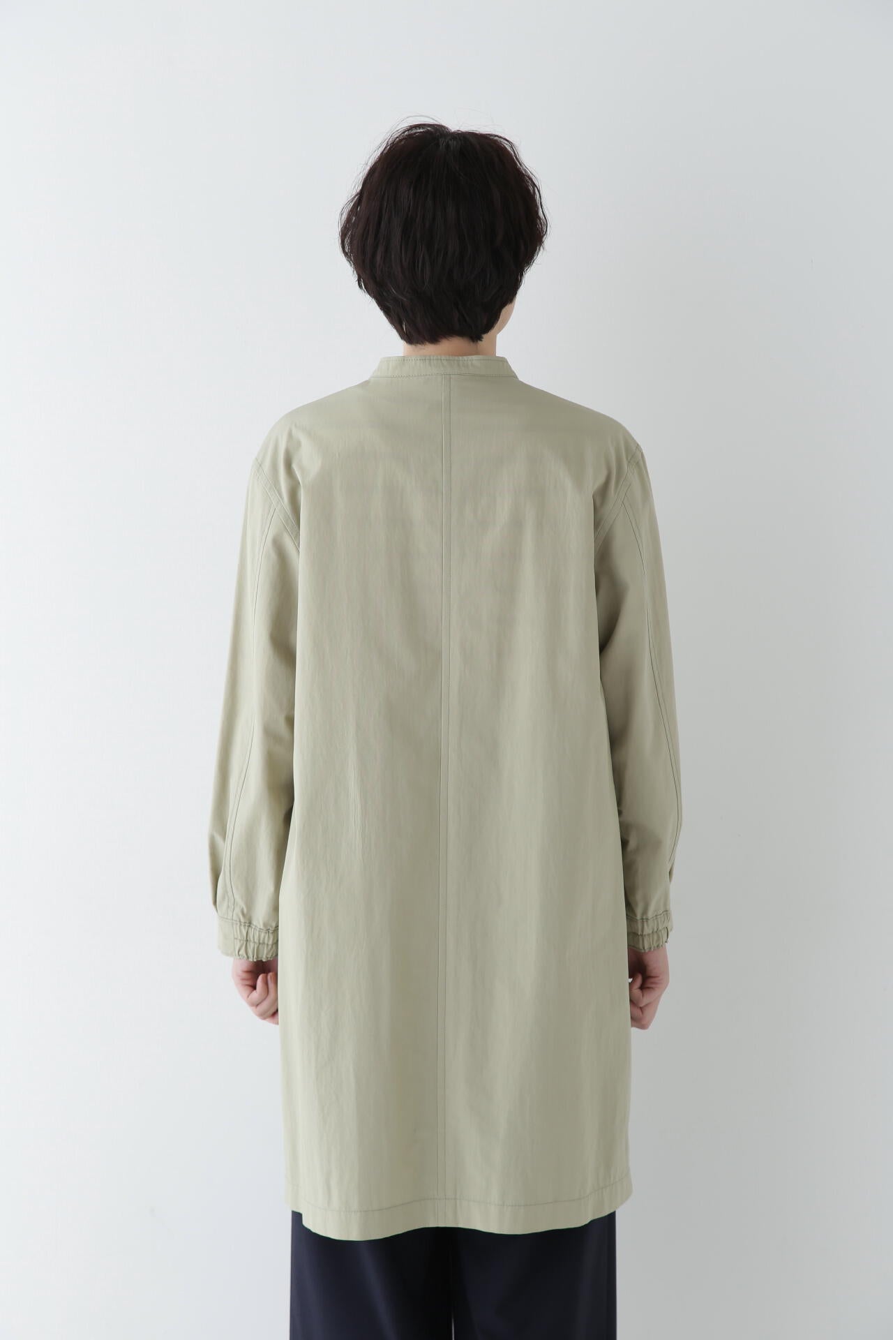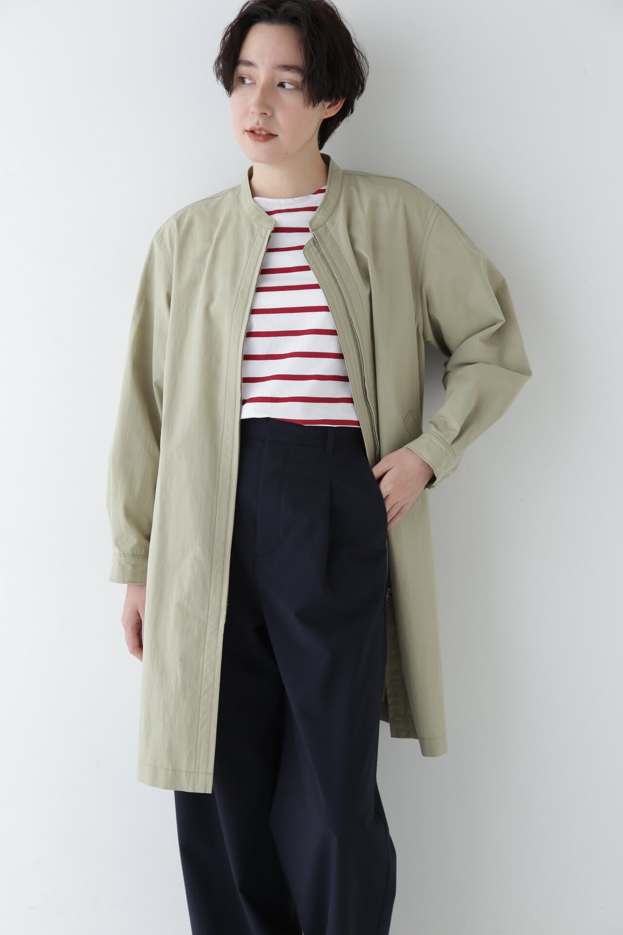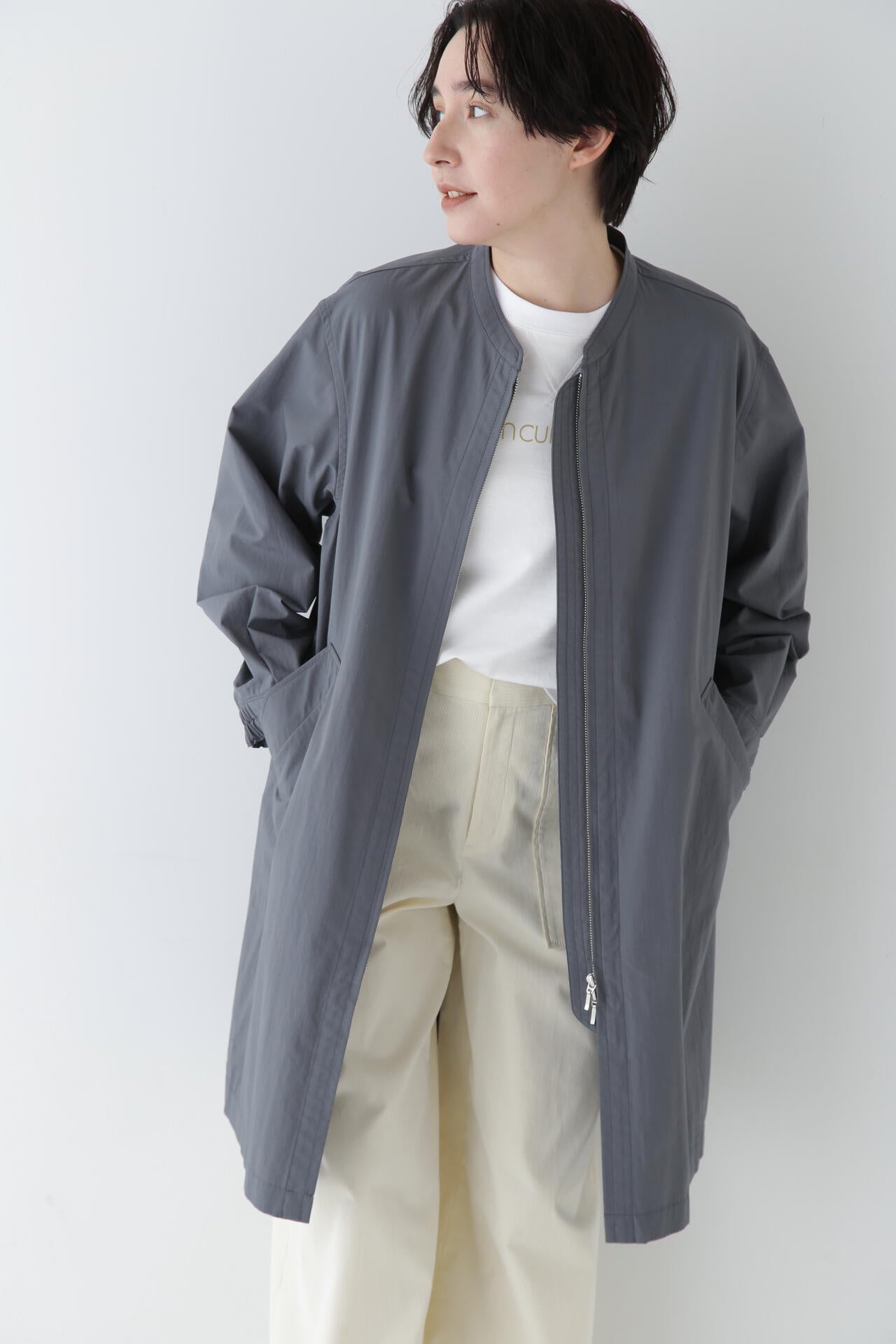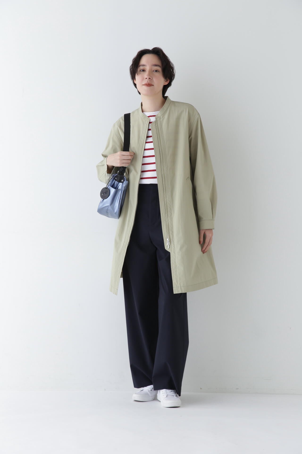 シンプルなスタンドカラーのロングコートです。袖口は開きはありませんがゴム仕様になっているので袖をたくし上げることで抜け感を演出できます。