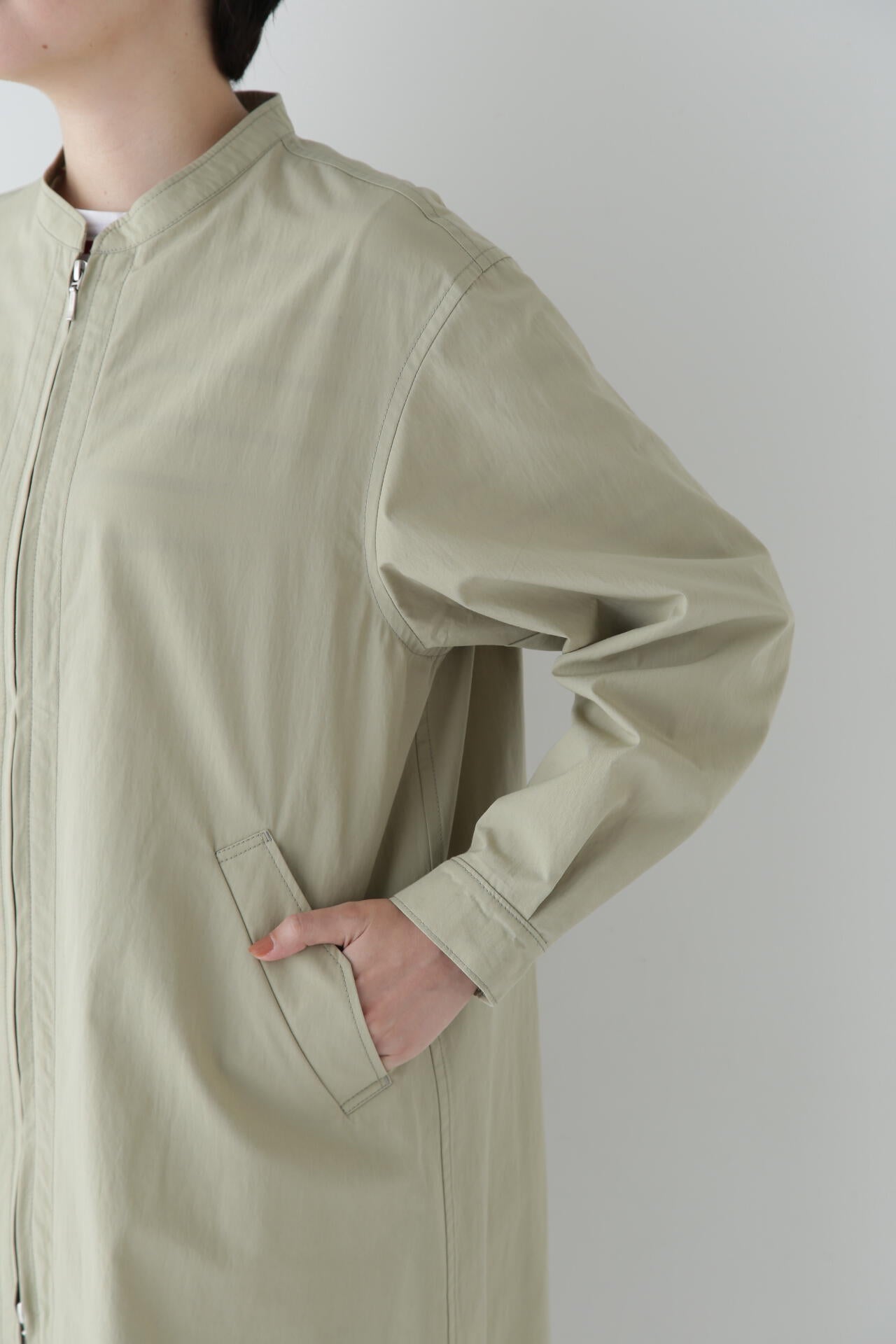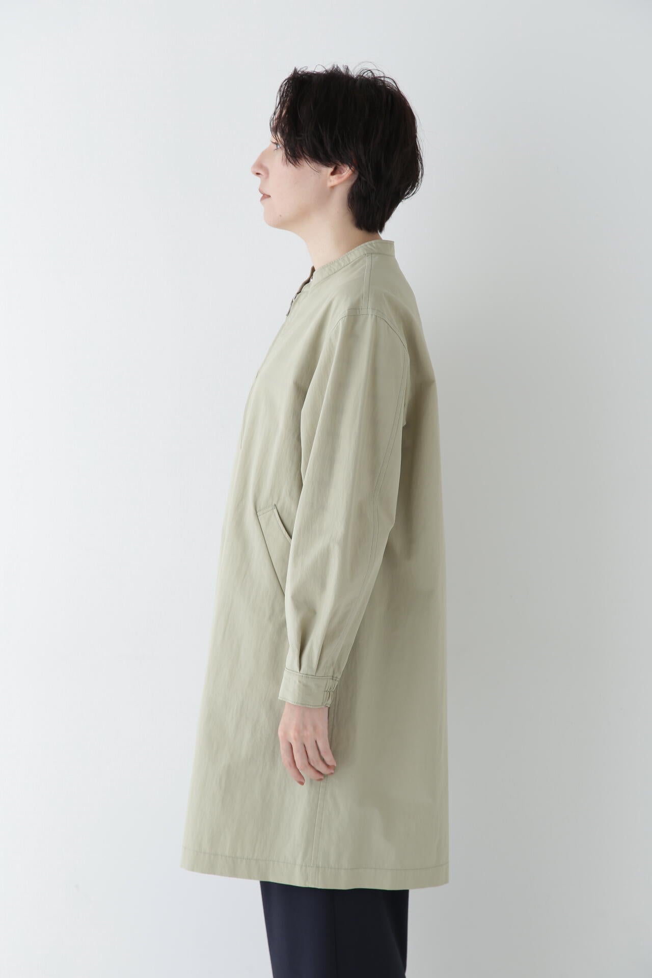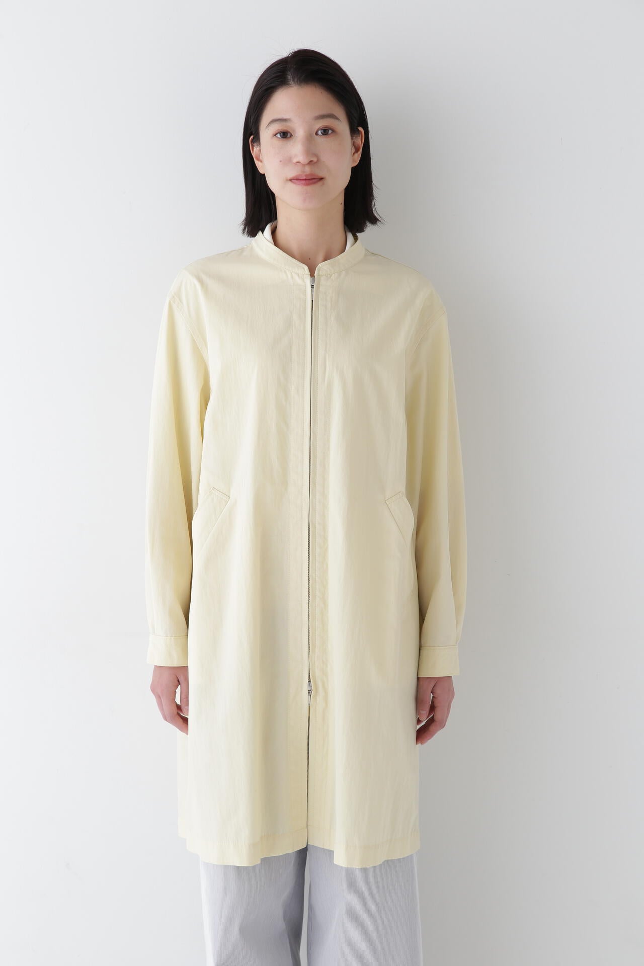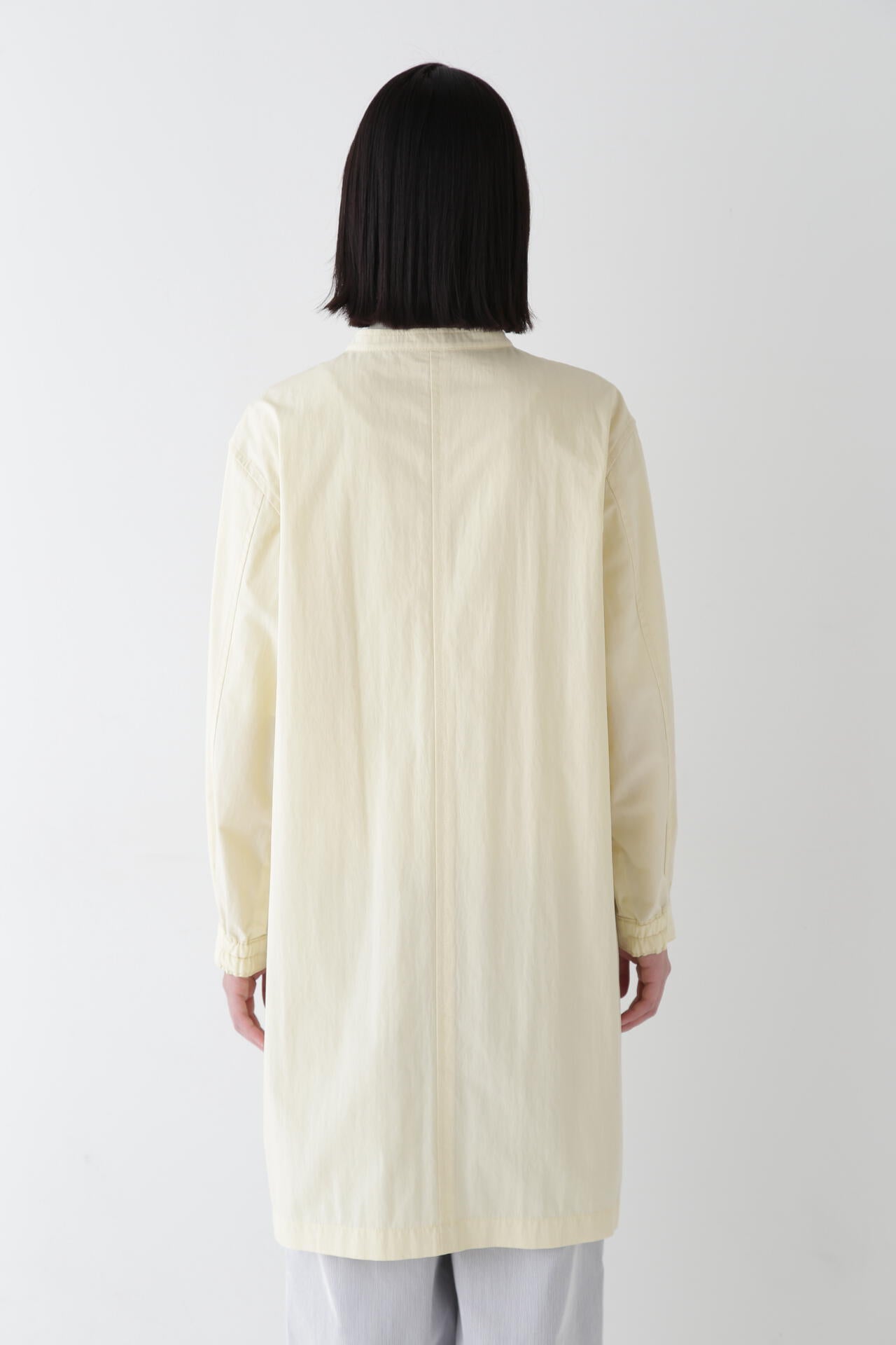 シンプルなスタンドカラーのロングコートです。袖口は開きはありませんがゴム仕様になっているので袖をたくし上げることで抜け感を演出できます。