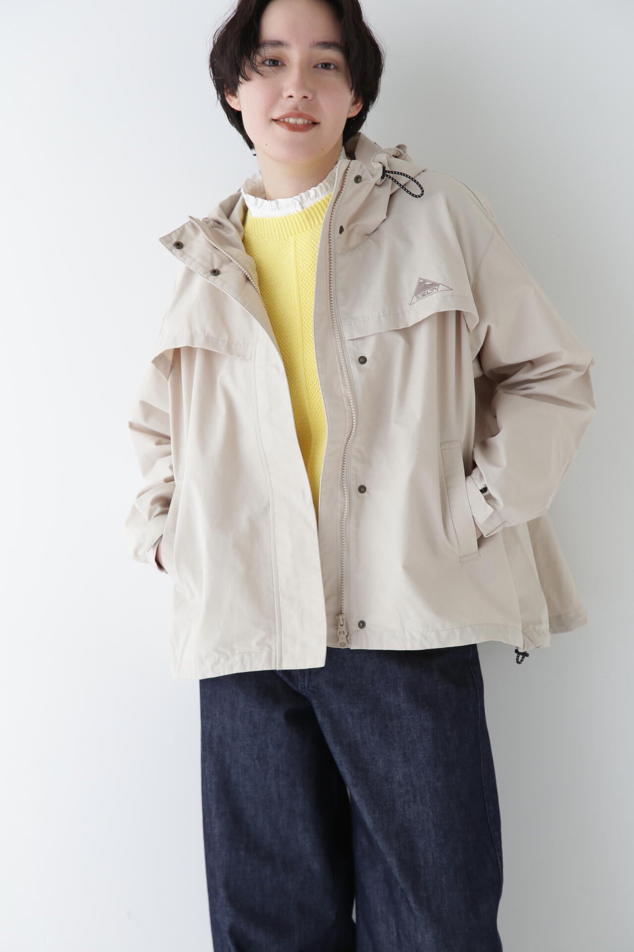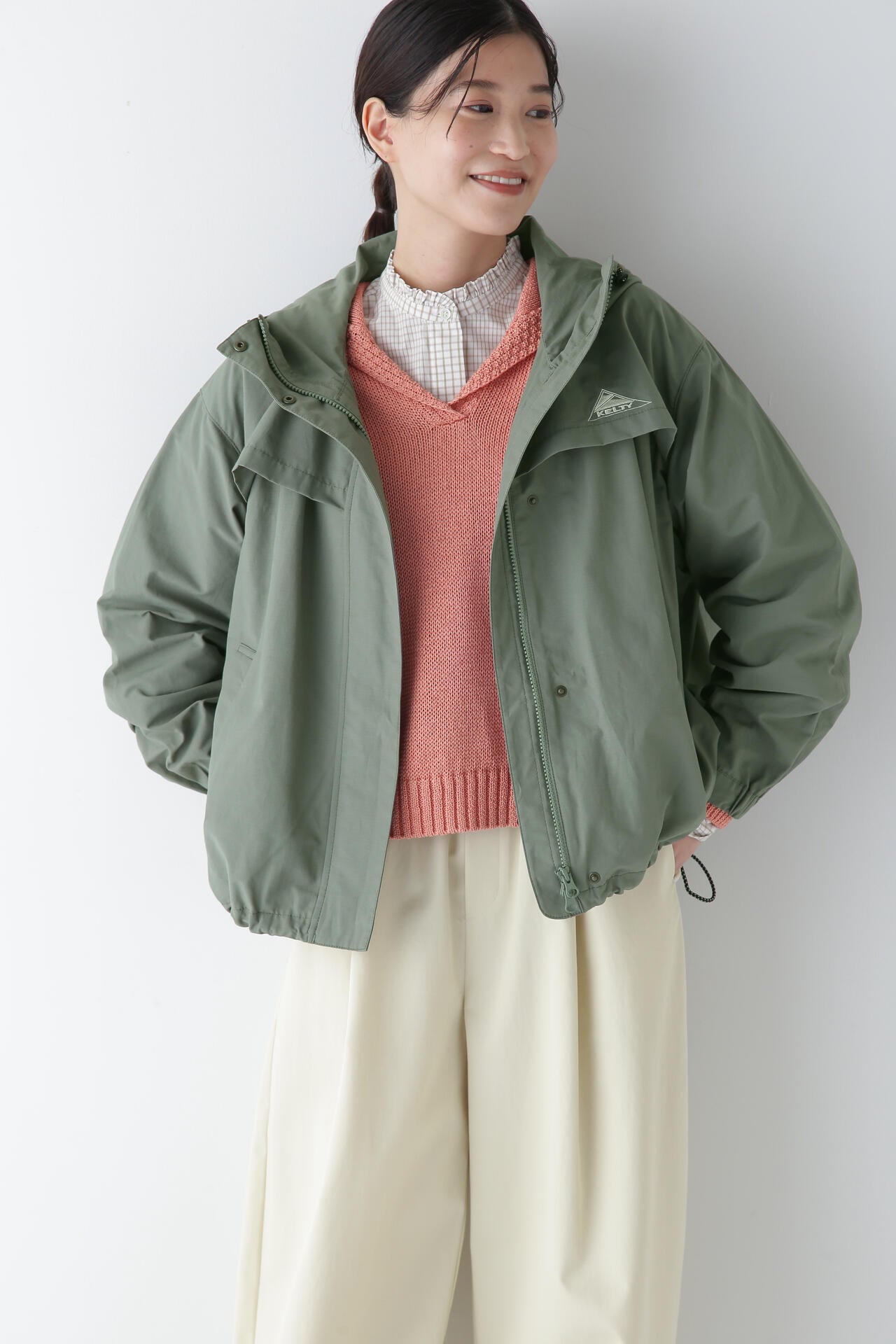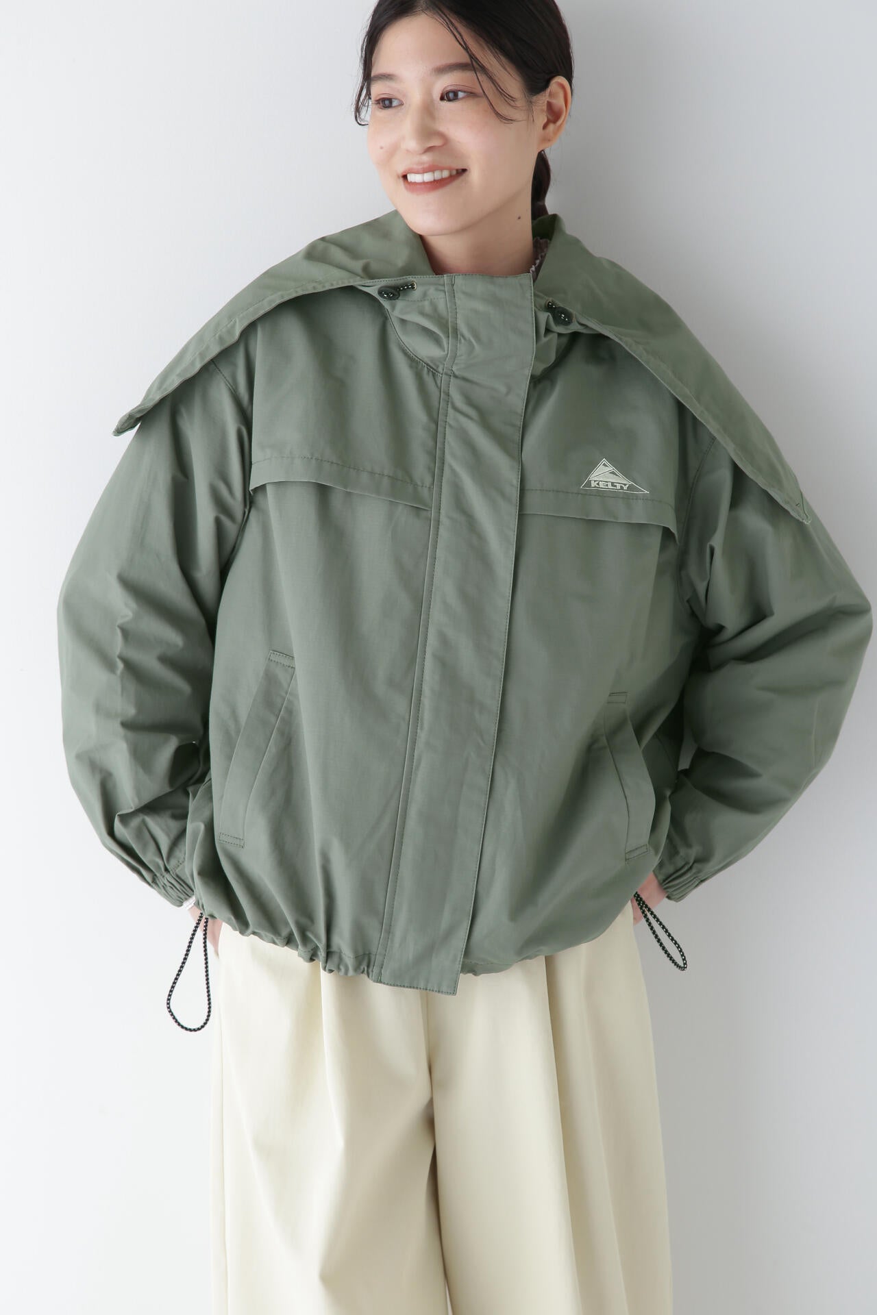 「KELTY」とのコラボのフーディーブルゾンです。KELTYで人気のザパタジャケットのフードの真ん中をジップで割れるデザインに変更しています。後ヨークのバランスや袖口を隠しドット仕様にするなどブランドに合った変更もしています。後身にボリュームがあるのでブラウジングした時のボリューム感がかわいいです。