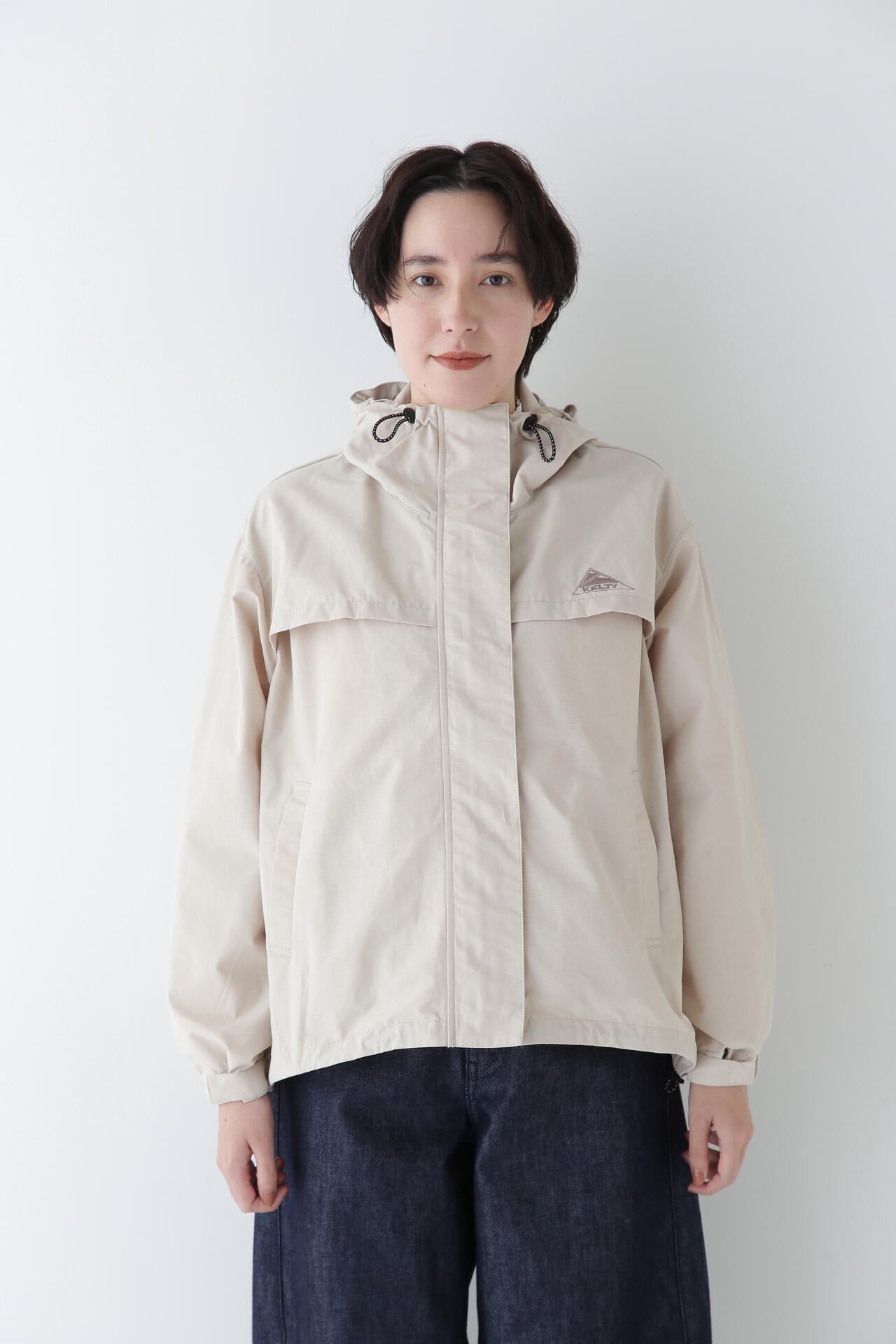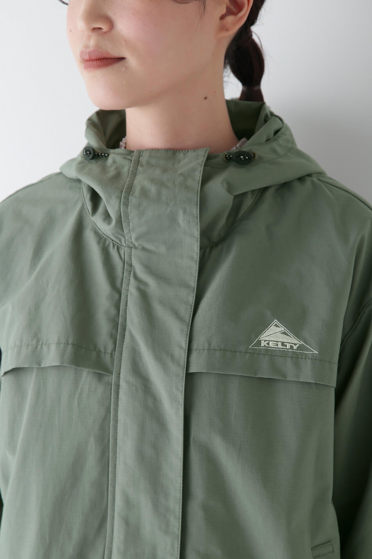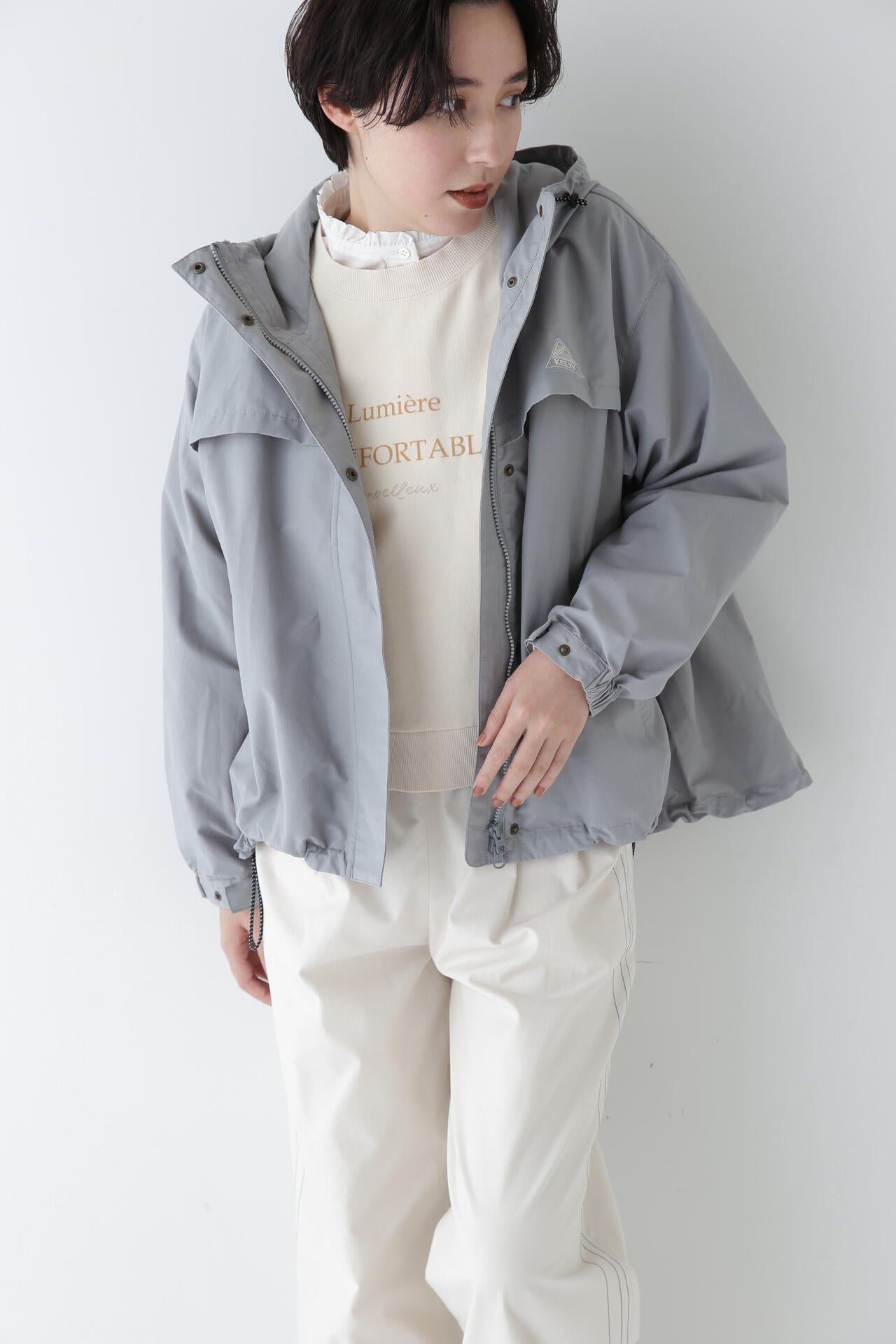 「KELTY」とのコラボのフーディーブルゾンです。KELTYで人気のザパタジャケットのフードの真ん中をジップで割れるデザインに変更しています。後ヨークのバランスや袖口を隠しドット仕様にするなどブランドに合った変更もしています。後身にボリュームがあるのでブラウジングした時のボリューム感がかわいいです。