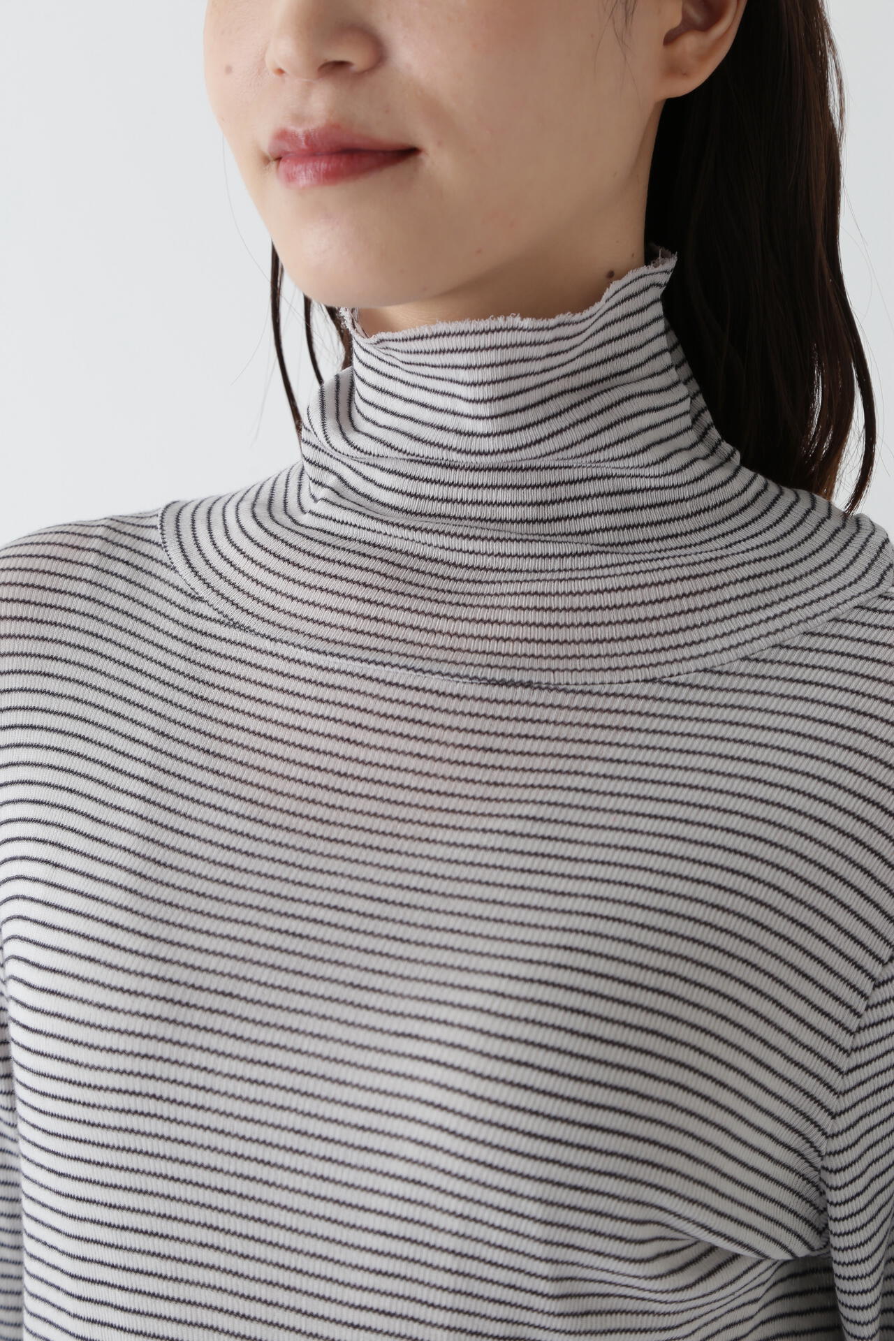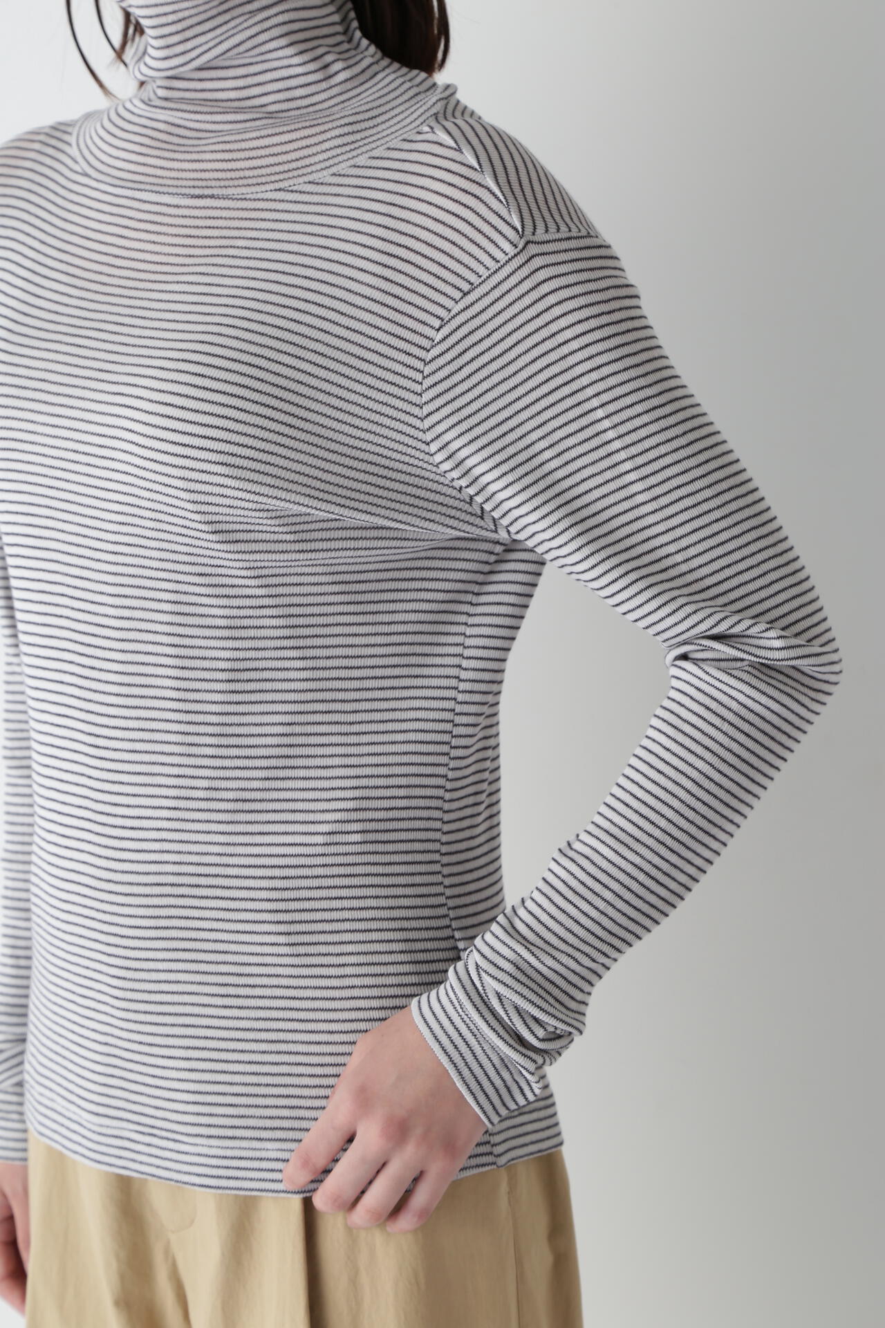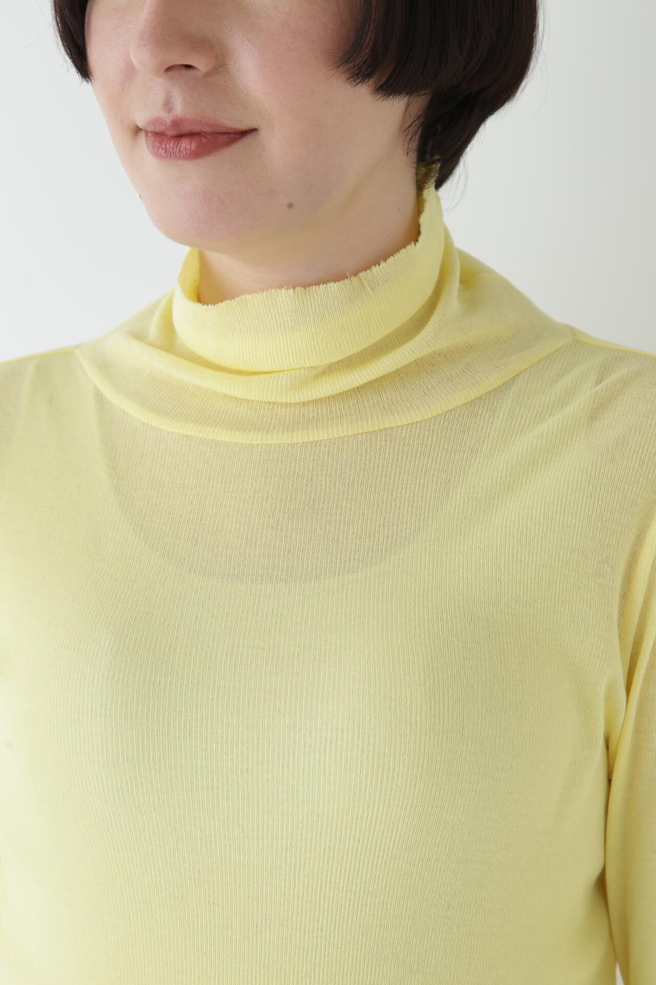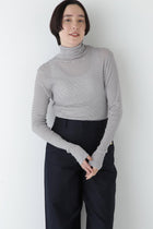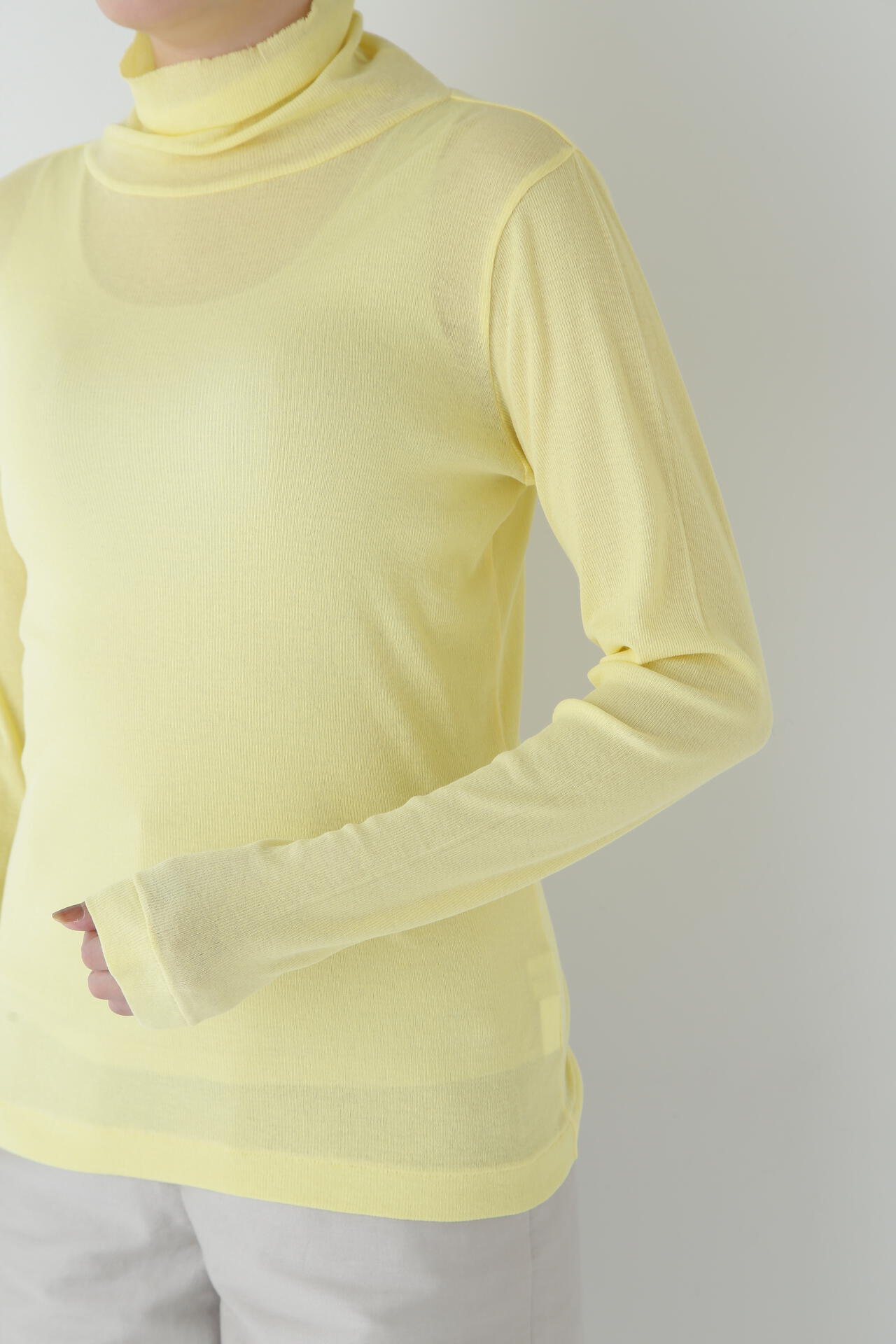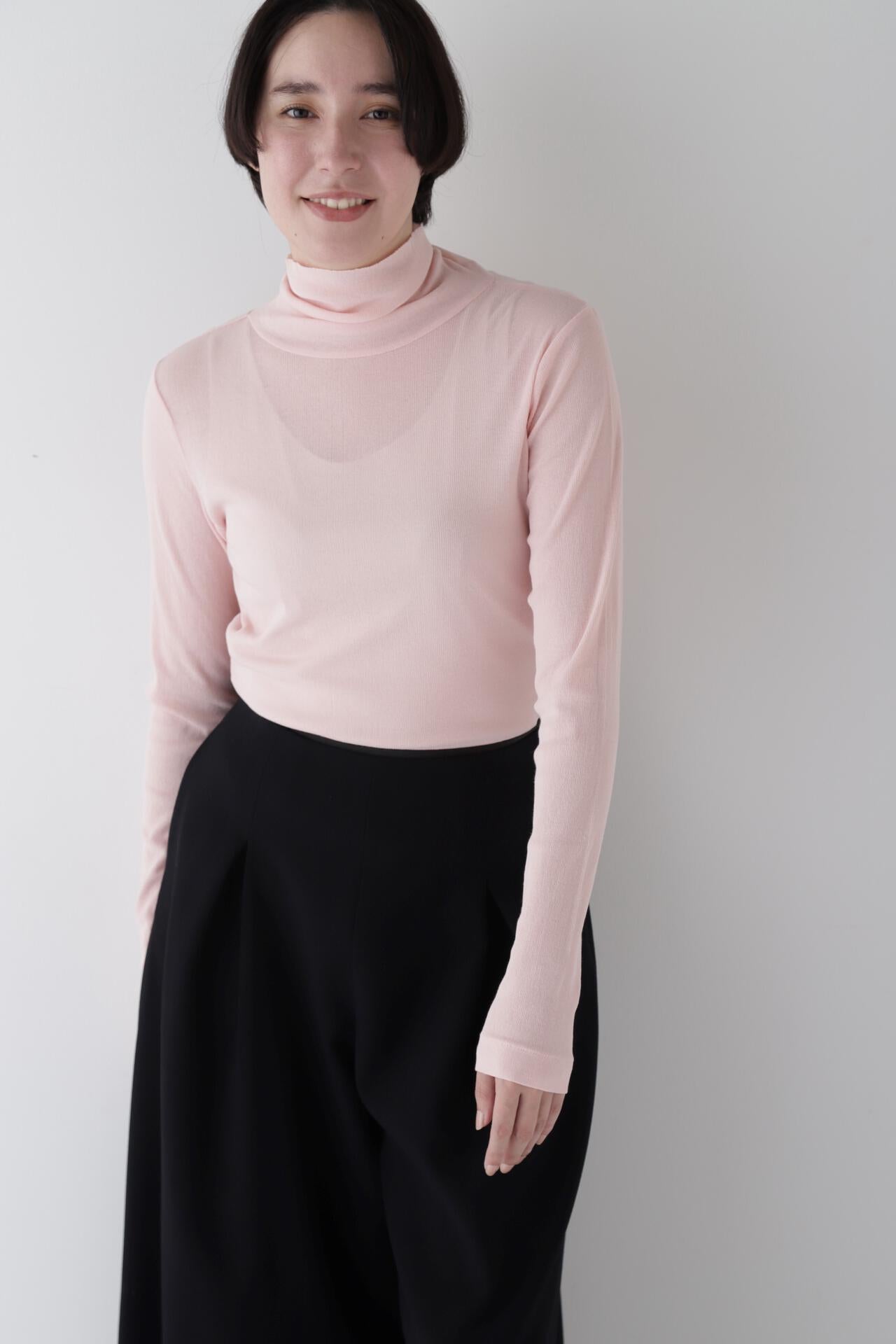 身体に程よくフィットするサイズ感のシアーテレコのタートルネックです。衿はややゆったりとした作りで衿端は断ち切りにしているので肌あたりもとても柔らかいです。