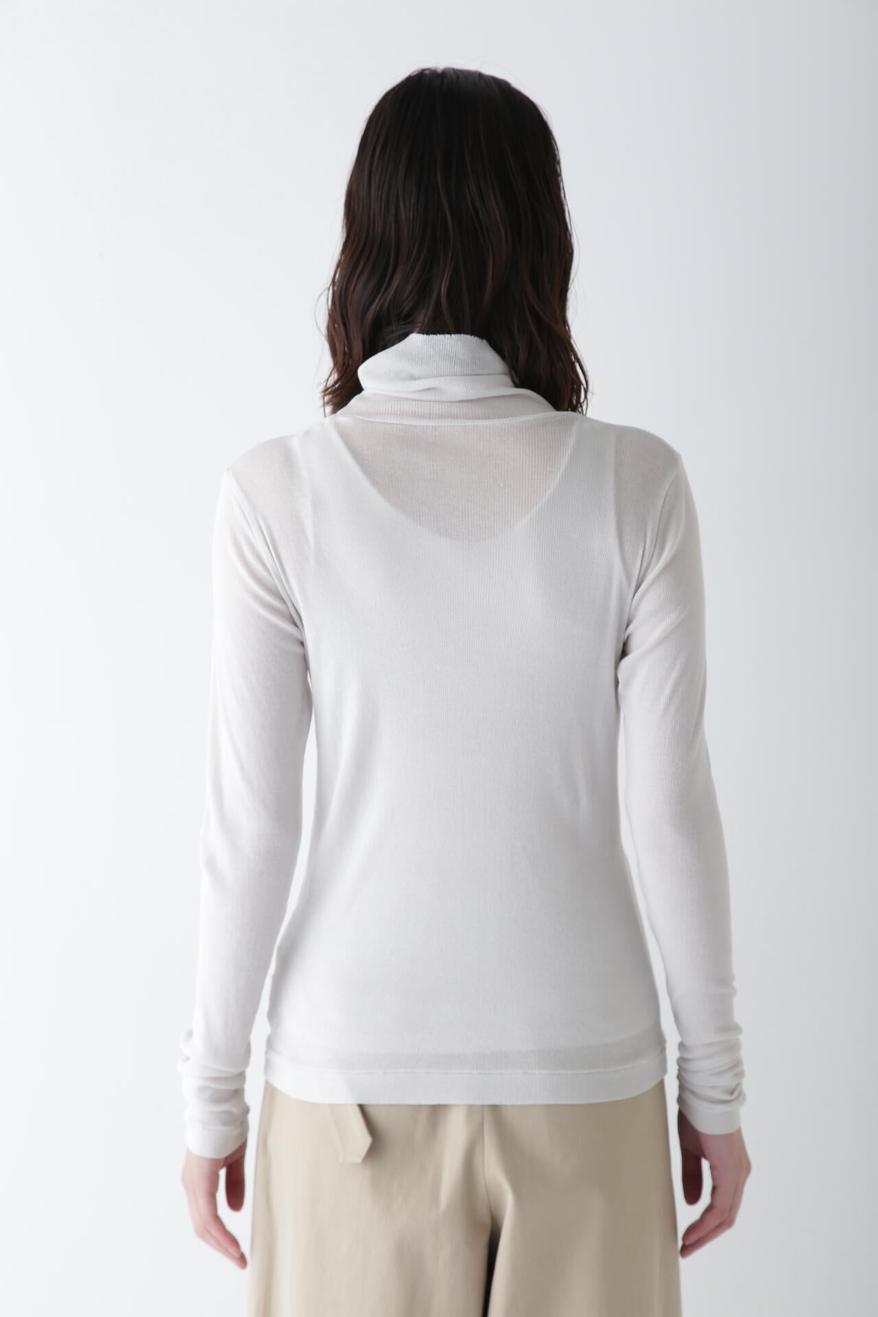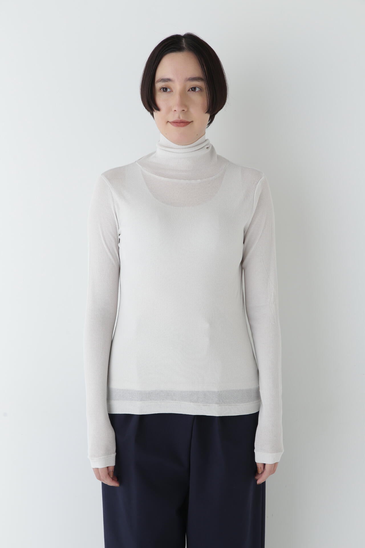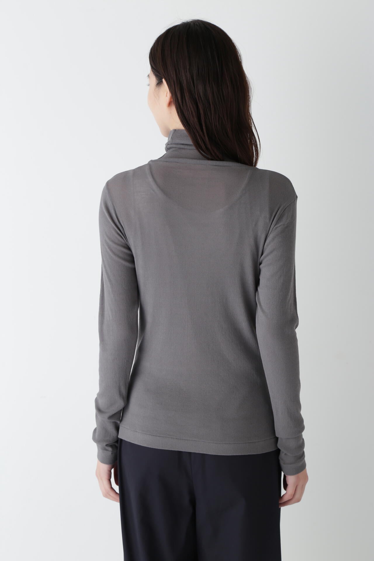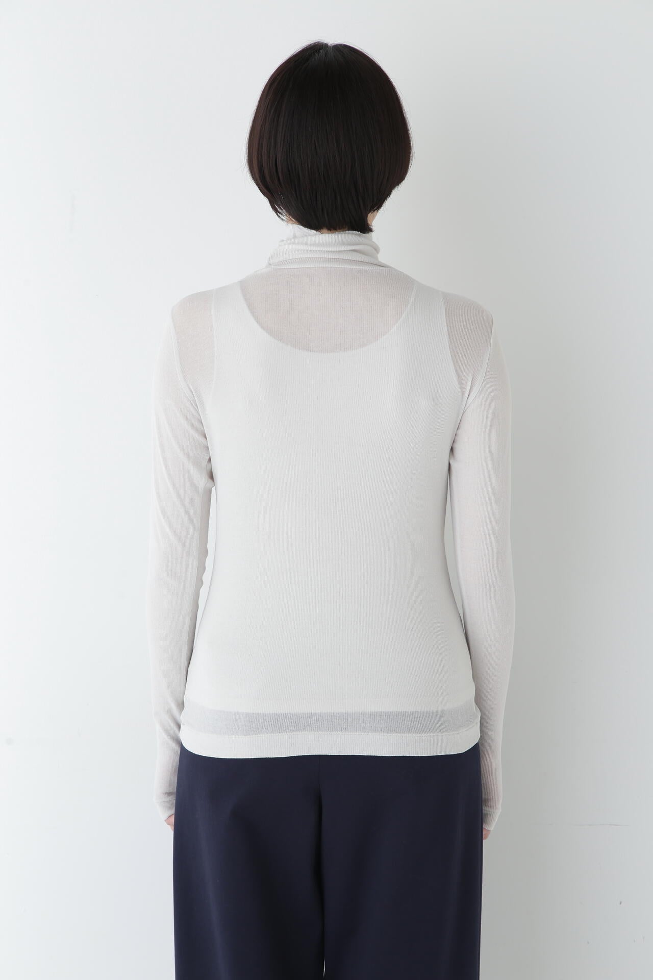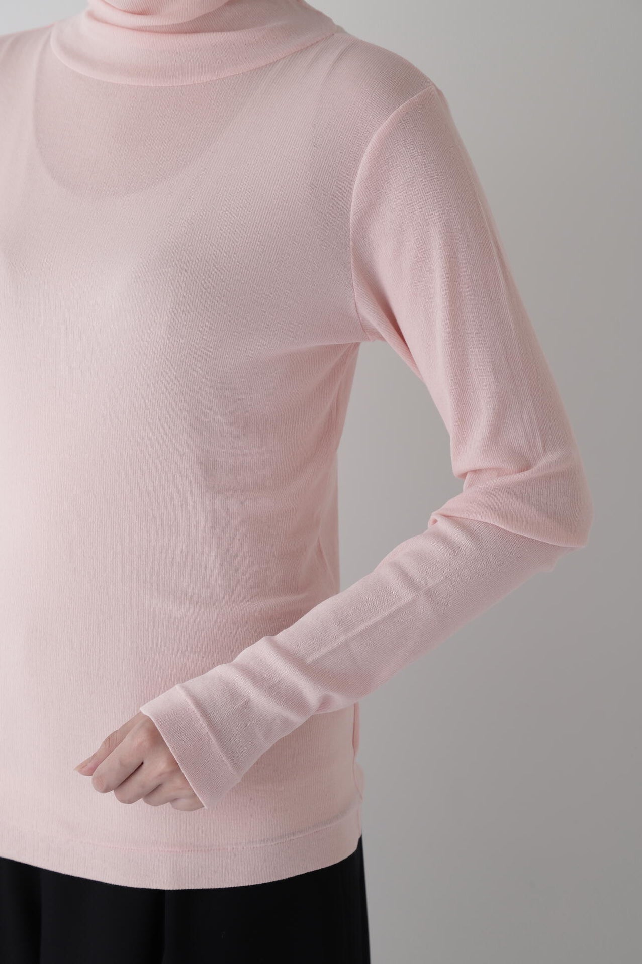 身体に程よくフィットするサイズ感のシアーテレコのタートルネックです。衿はややゆったりとした作りで衿端は断ち切りにしているので肌あたりもとても柔らかいです。