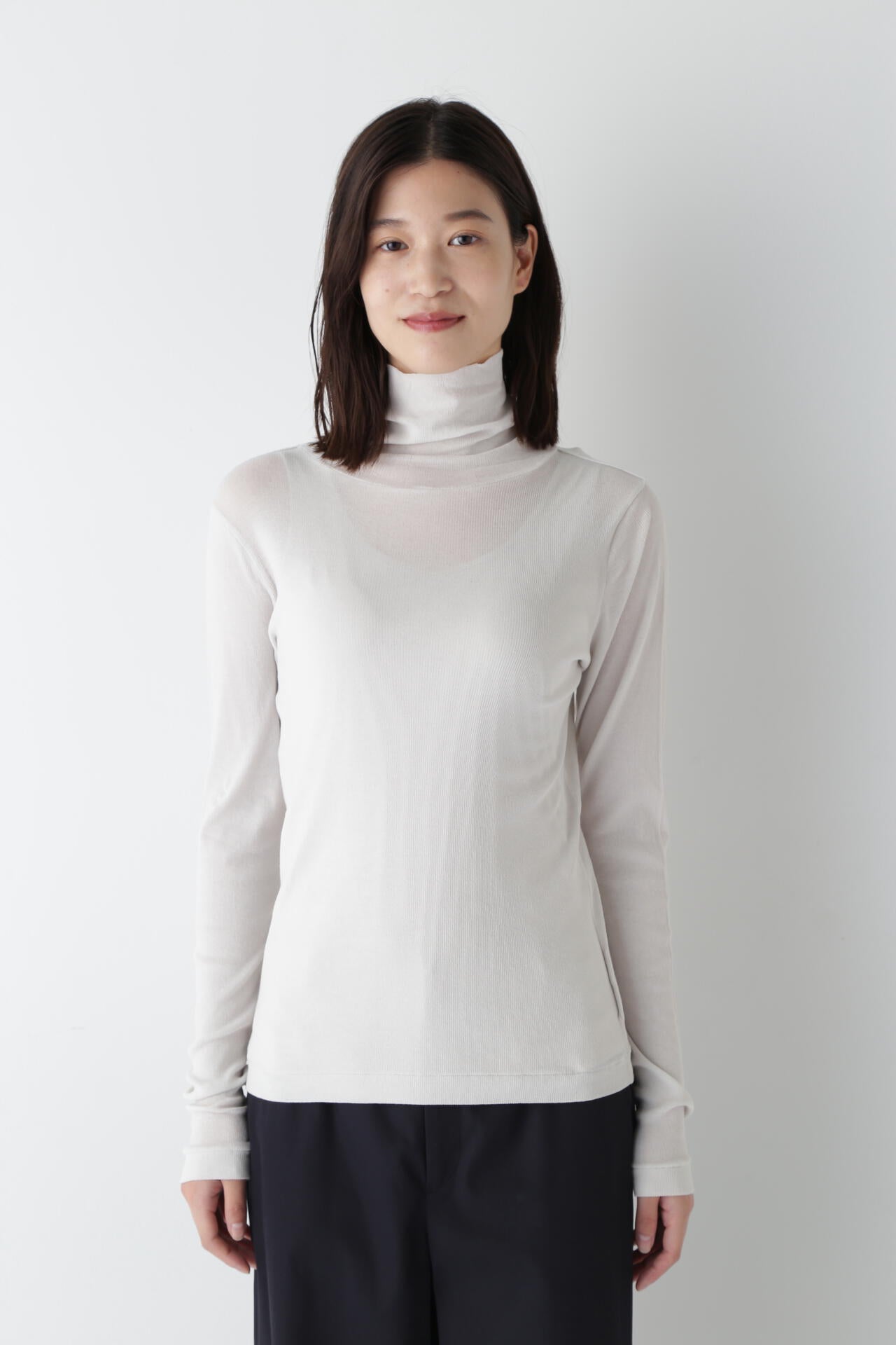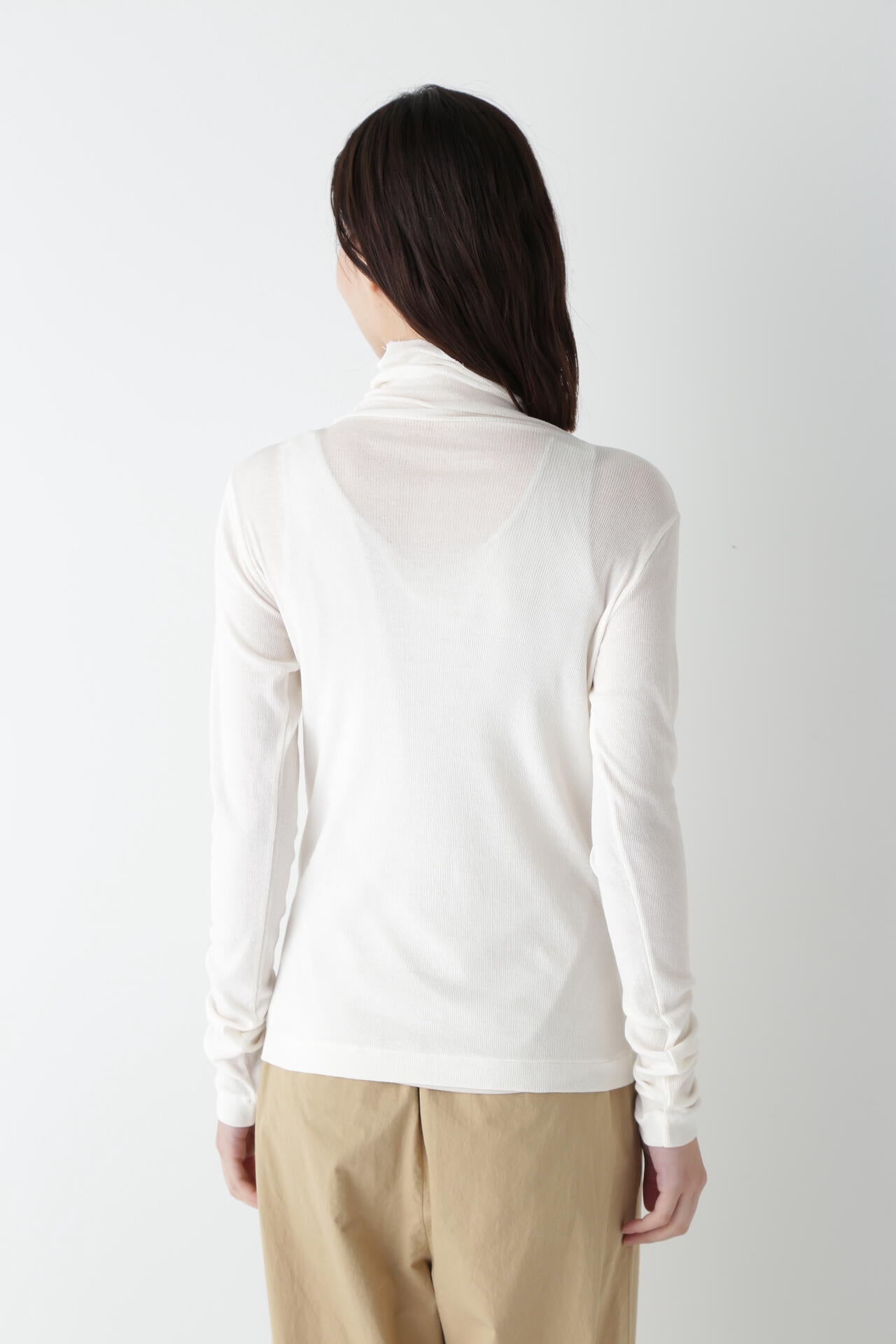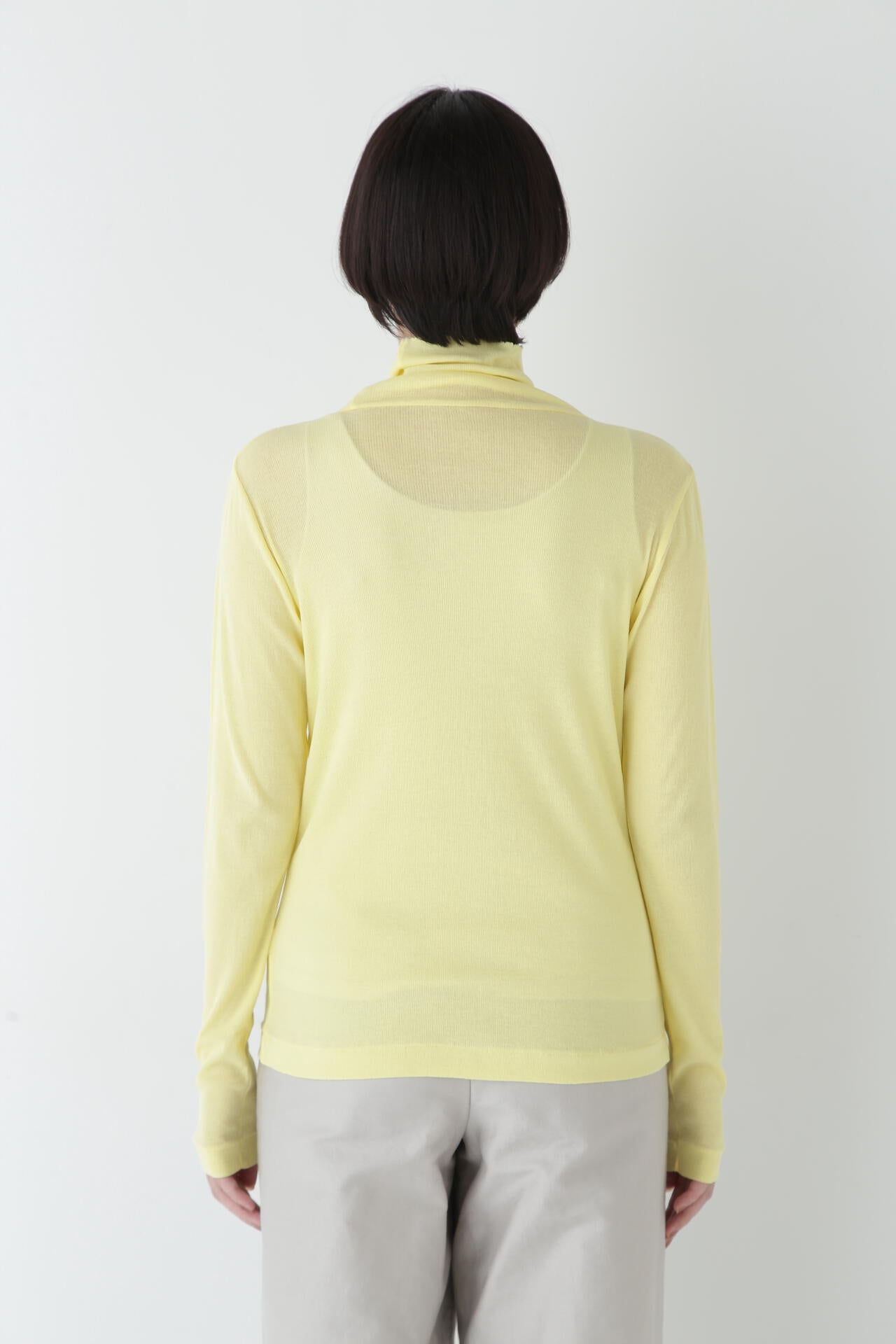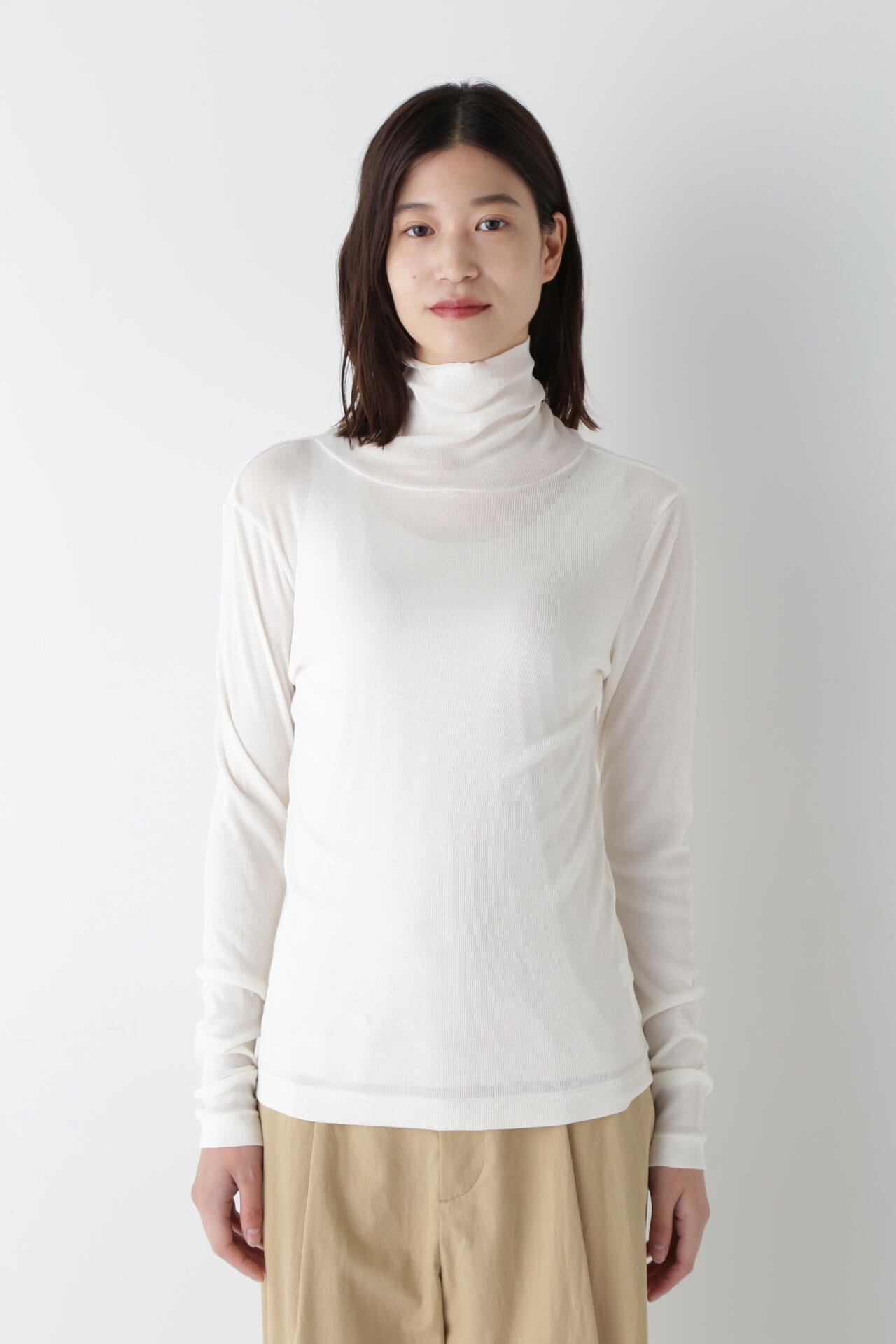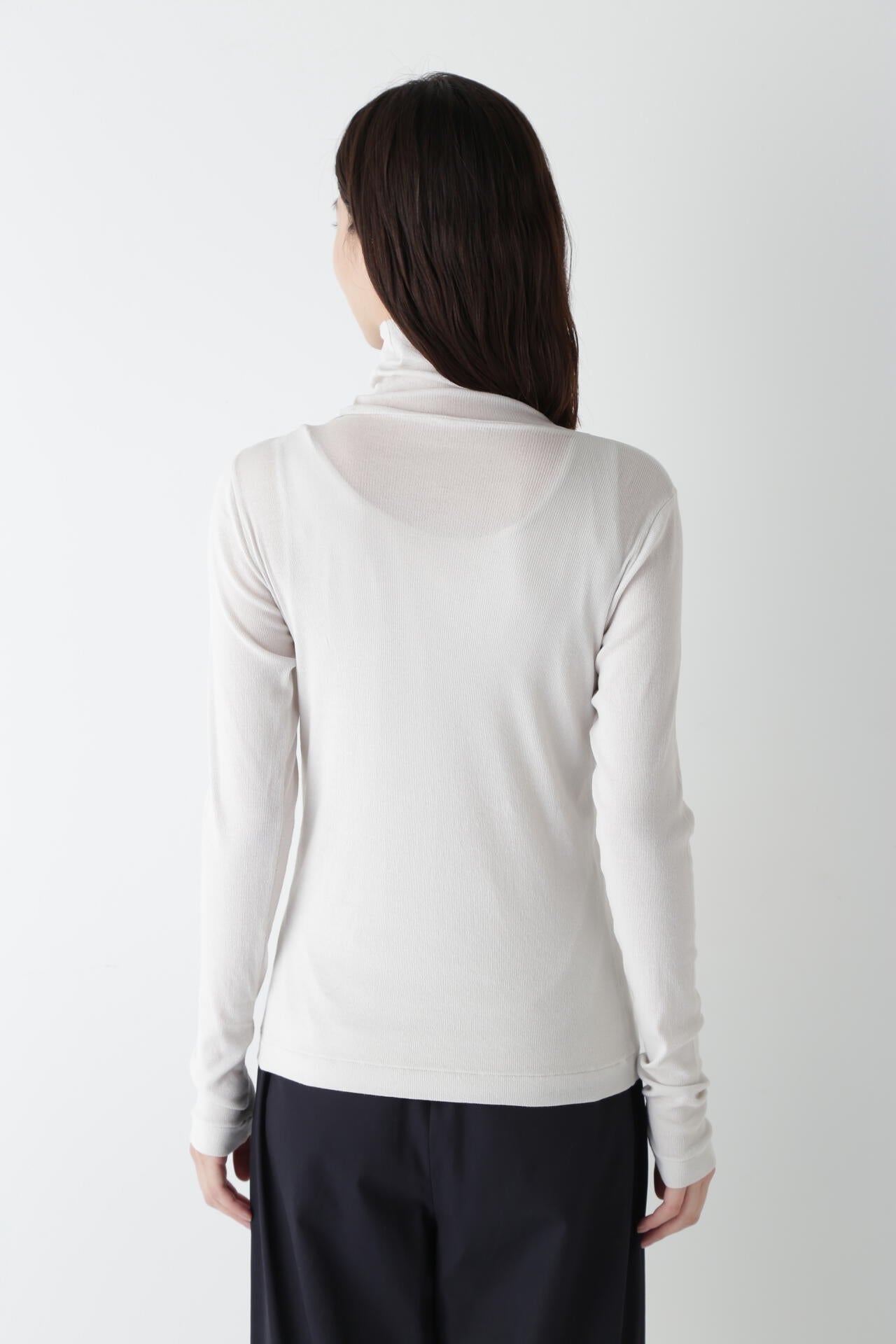 身体に程よくフィットするサイズ感のシアーテレコのタートルネックです。衿はややゆったりとした作りで衿端は断ち切りにしているので肌あたりもとても柔らかいです。