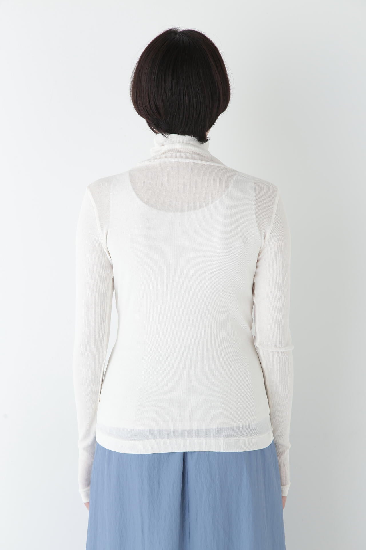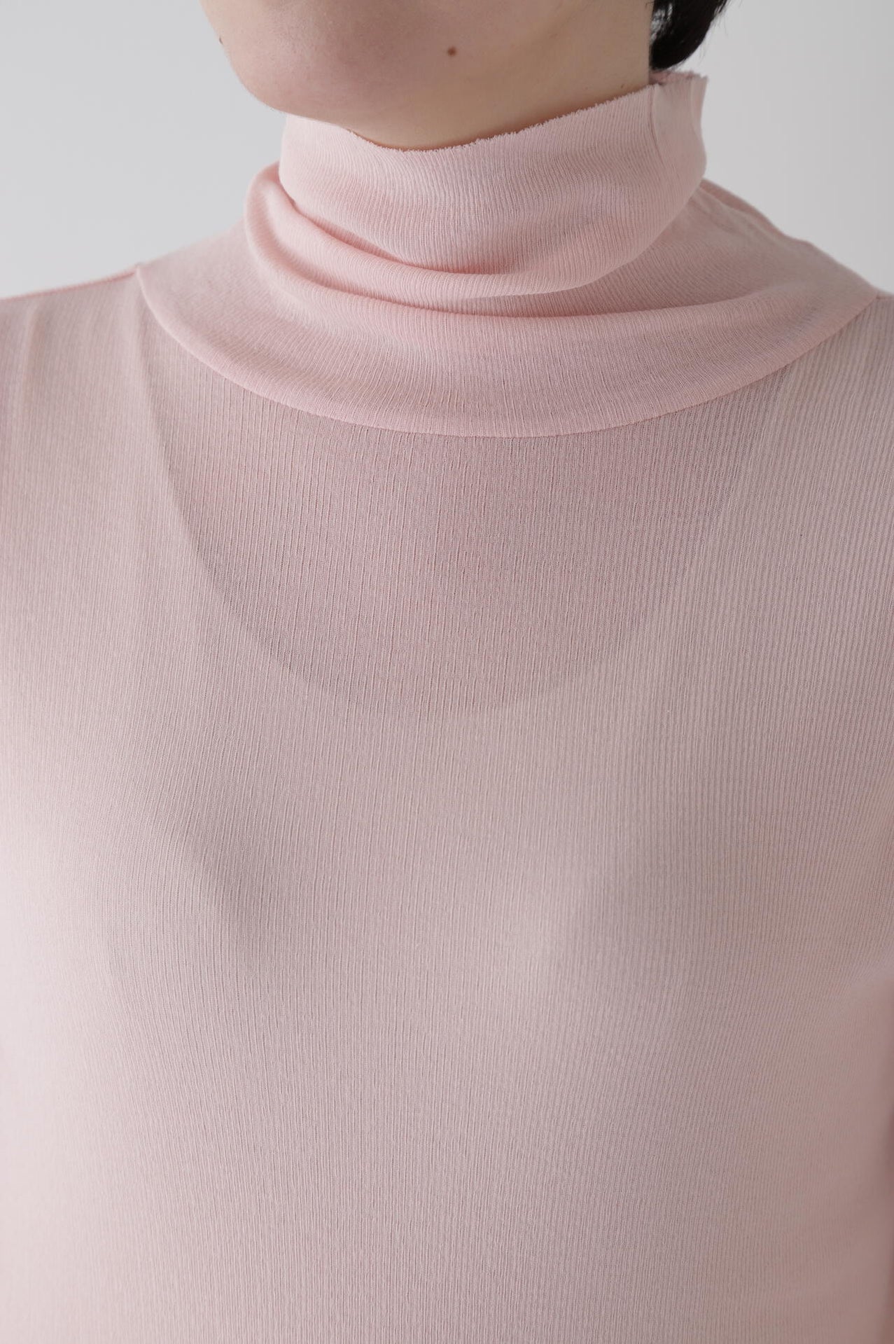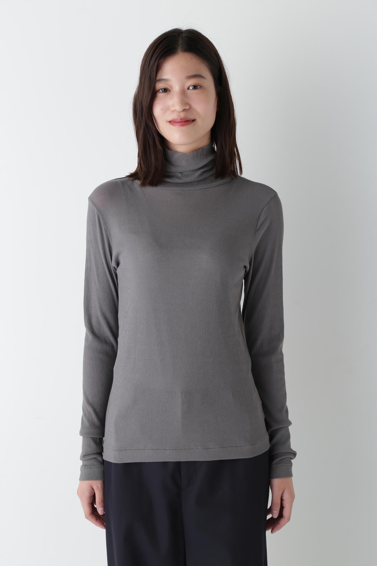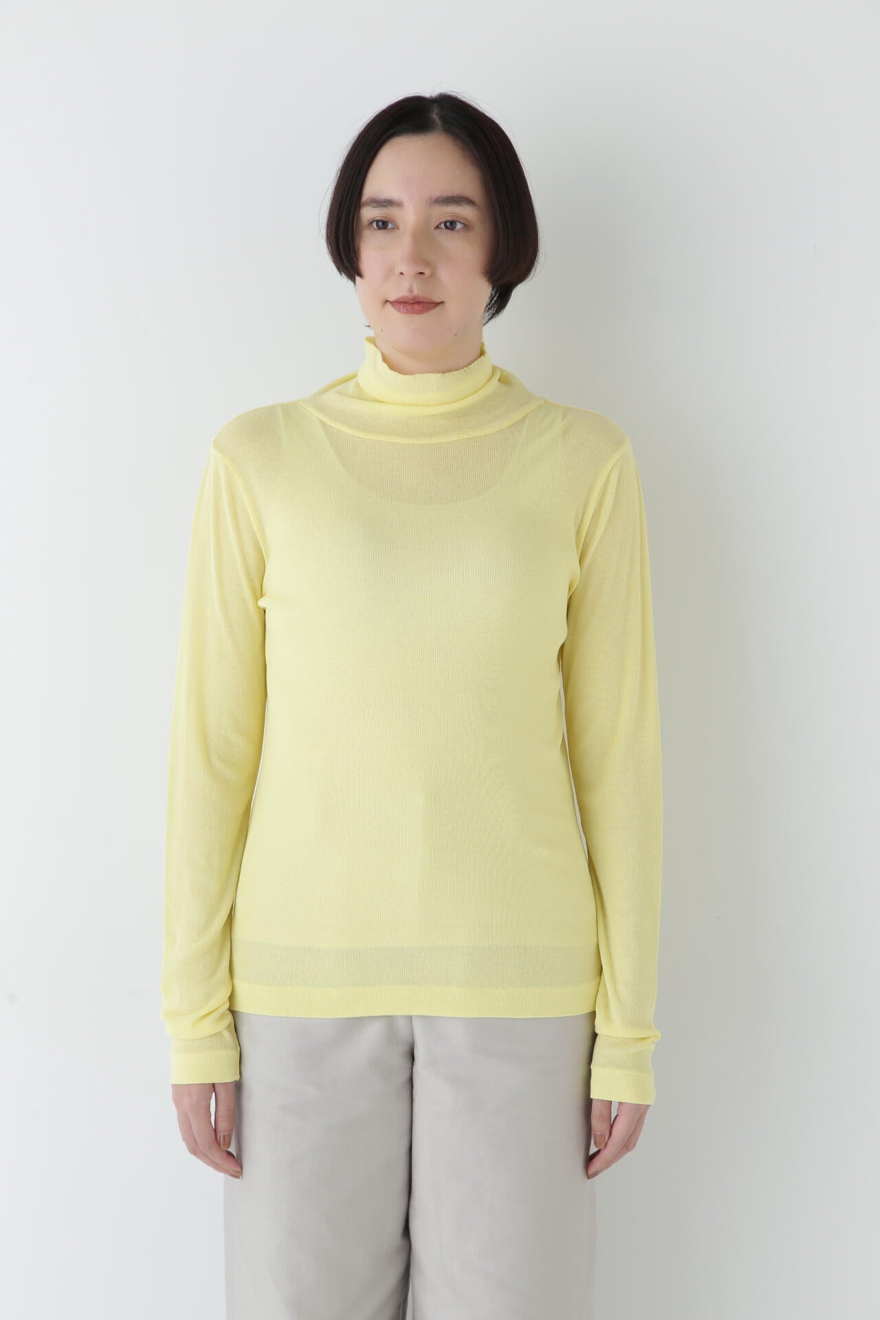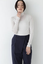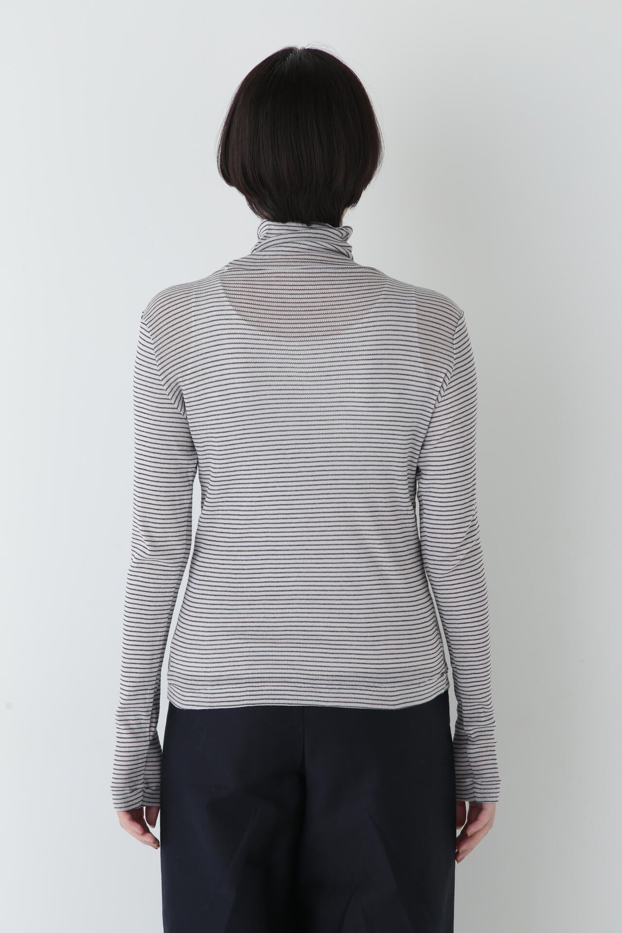 身体に程よくフィットするサイズ感のシアーテレコのタートルネックです。衿はややゆったりとした作りで衿端は断ち切りにしているので肌あたりもとても柔らかいです。