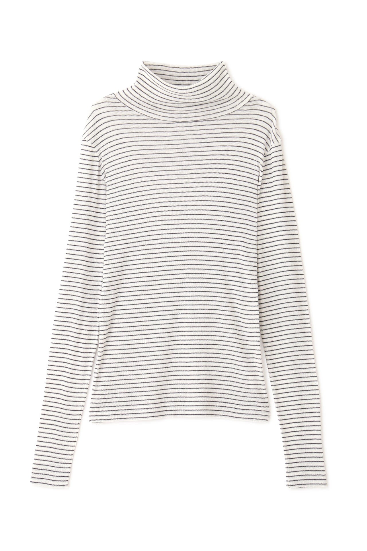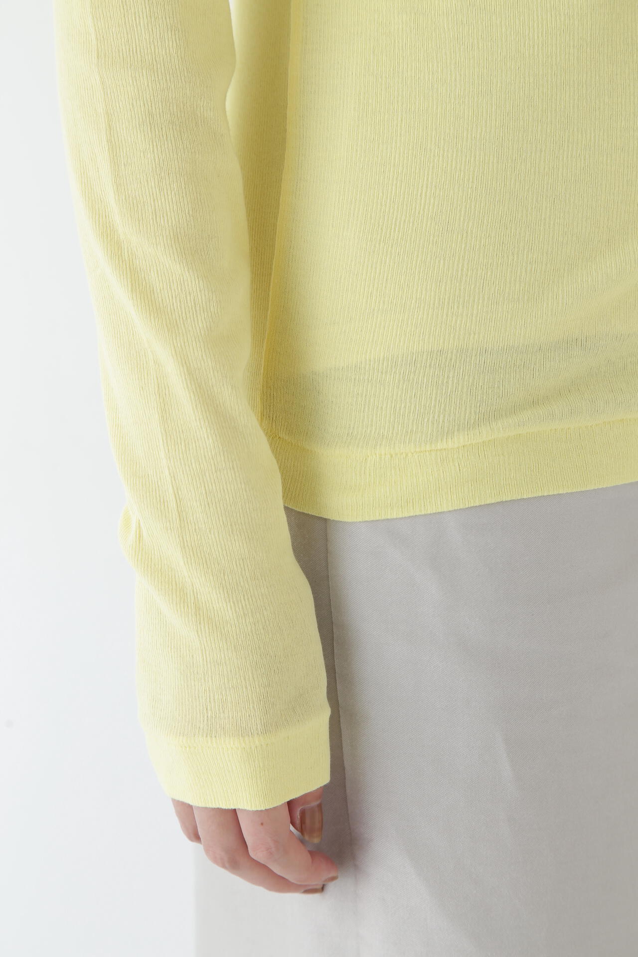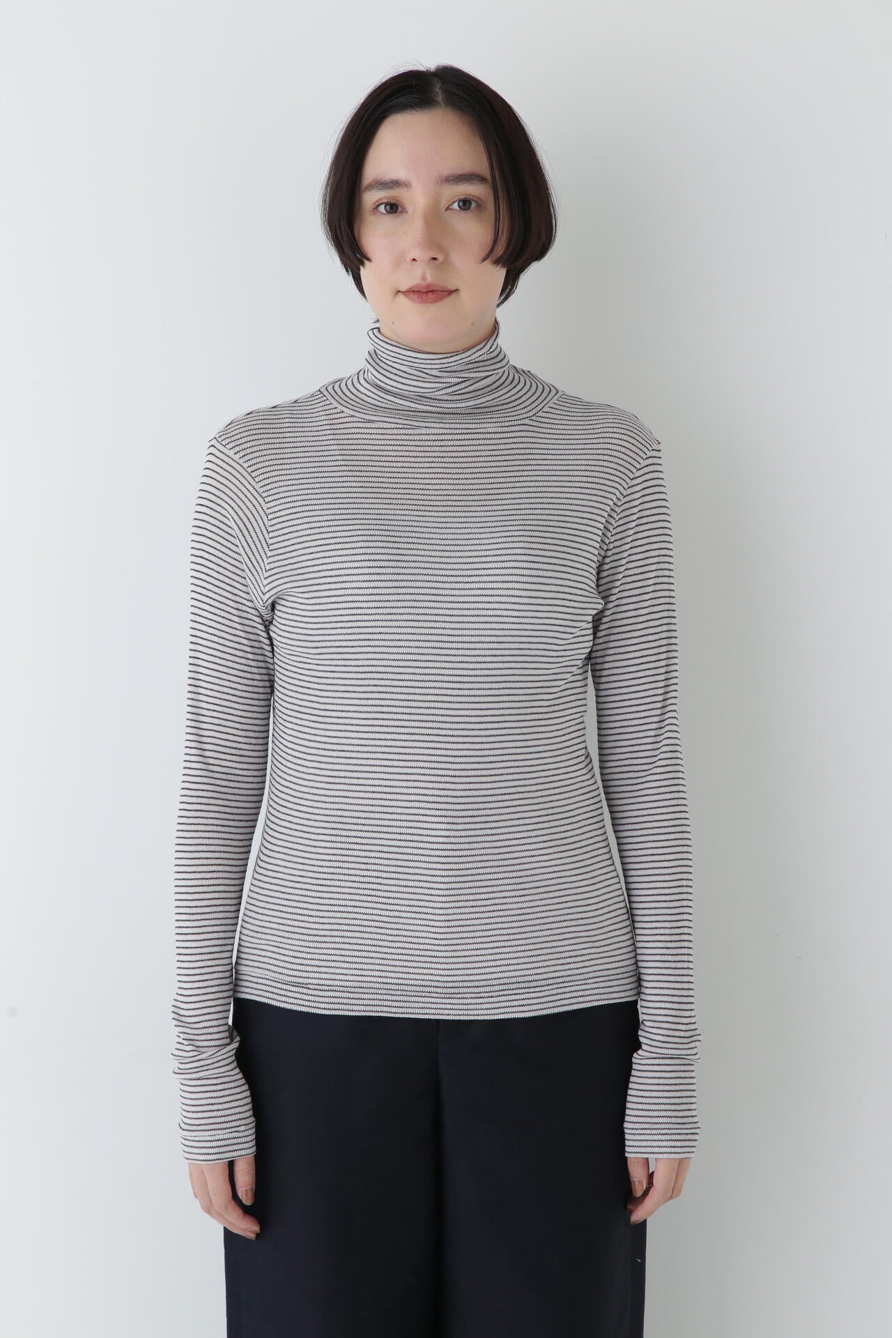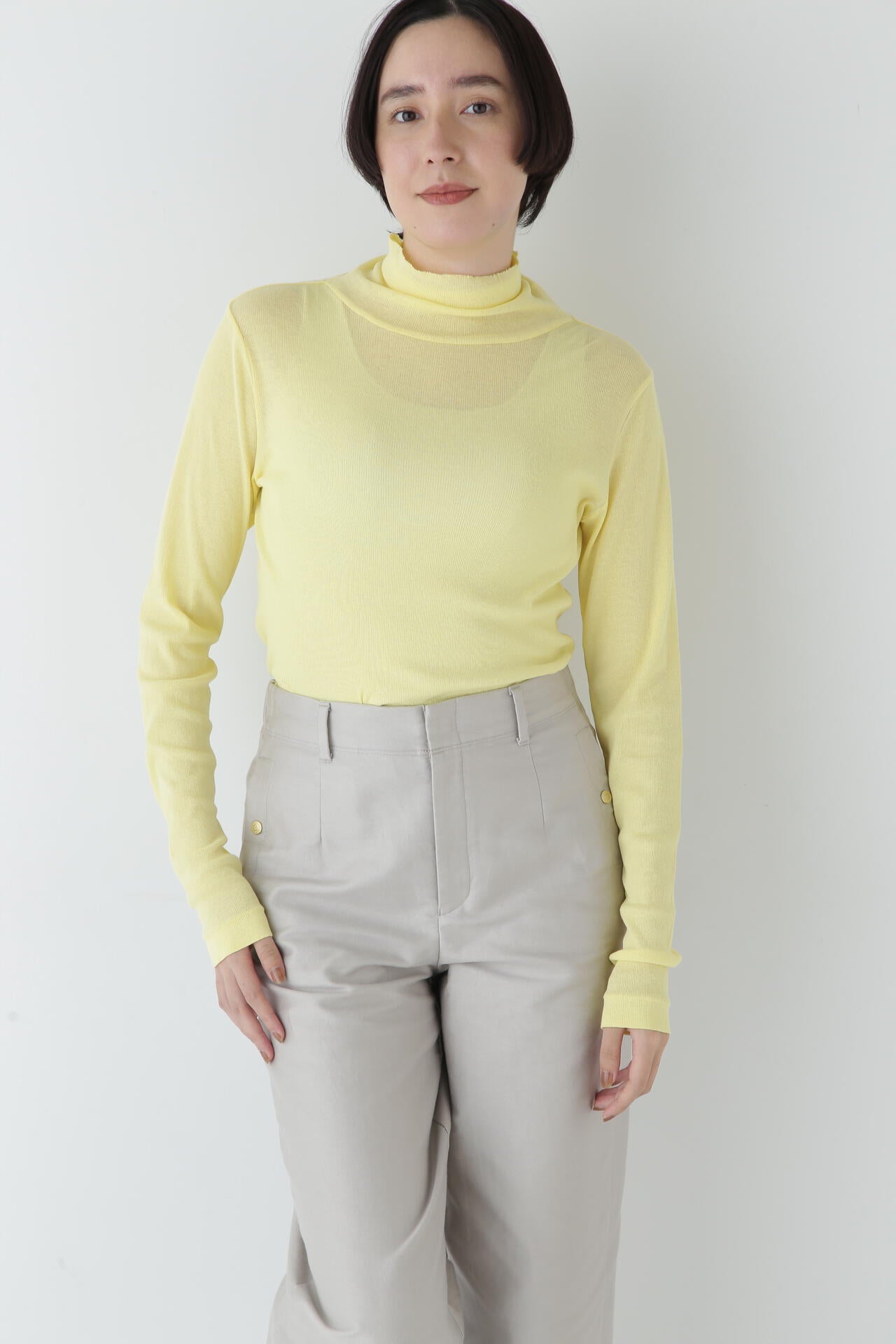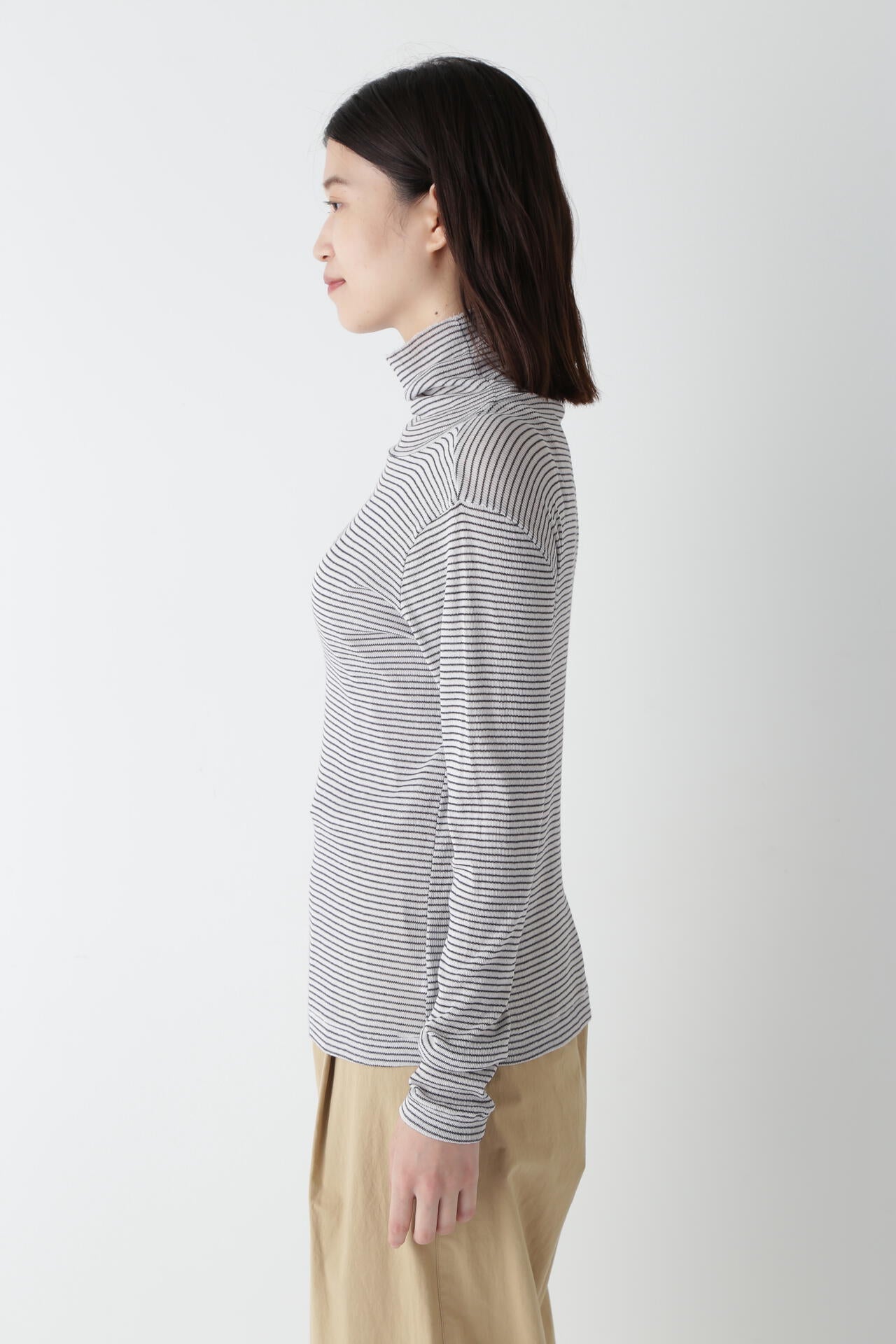 身体に程よくフィットするサイズ感のシアーテレコのタートルネックです。衿はややゆったりとした作りで衿端は断ち切りにしているので肌あたりもとても柔らかいです。
