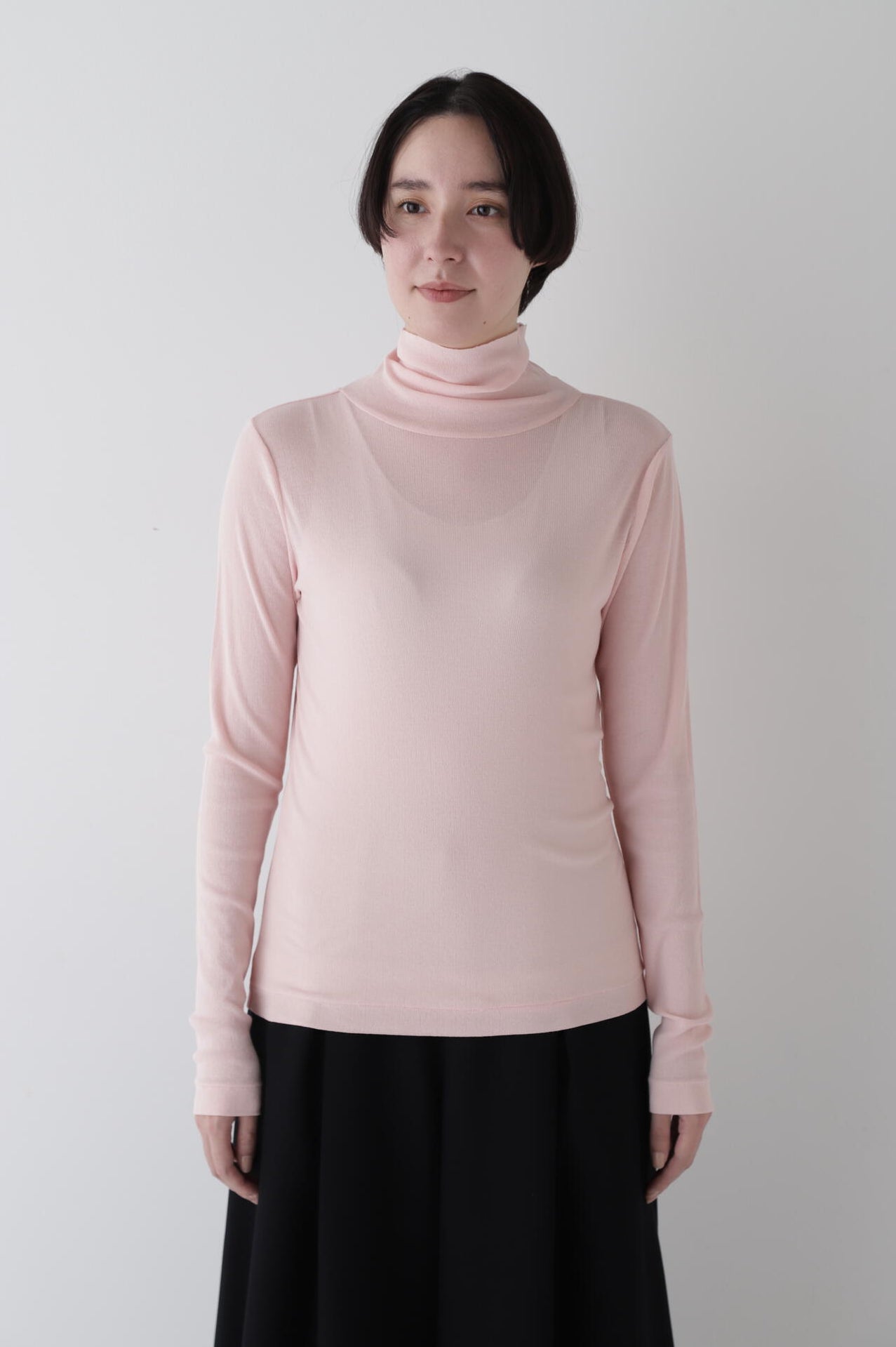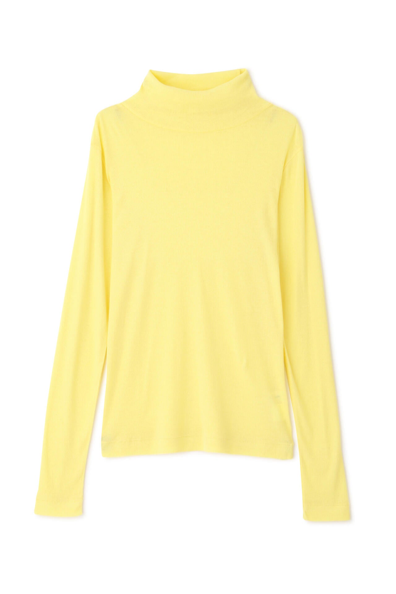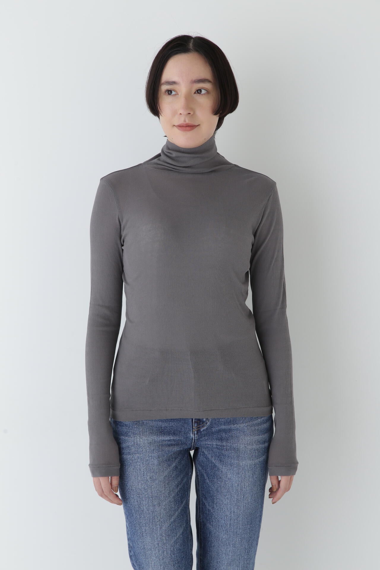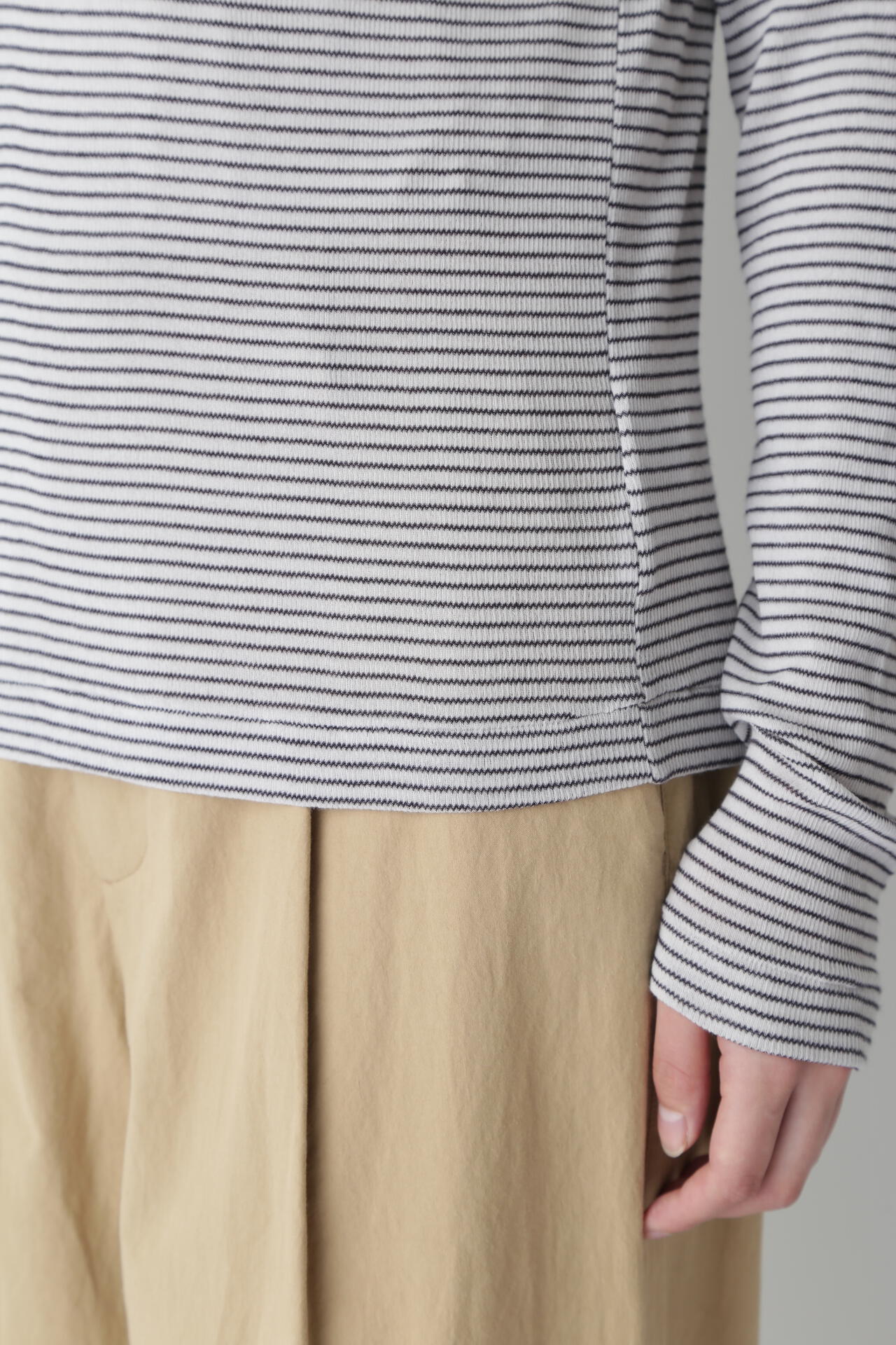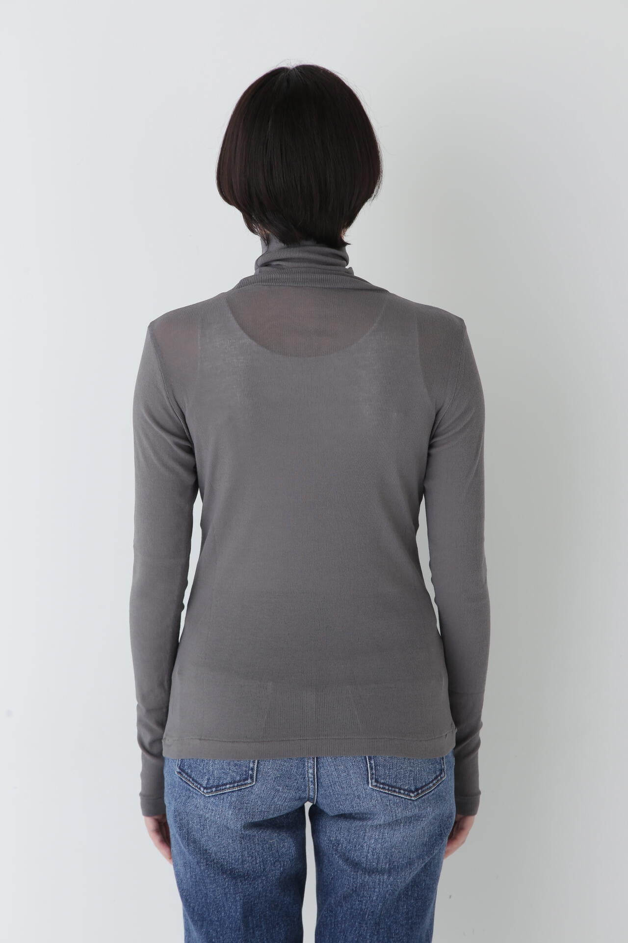 身体に程よくフィットするサイズ感のシアーテレコのタートルネックです。衿はややゆったりとした作りで衿端は断ち切りにしているので肌あたりもとても柔らかいです。