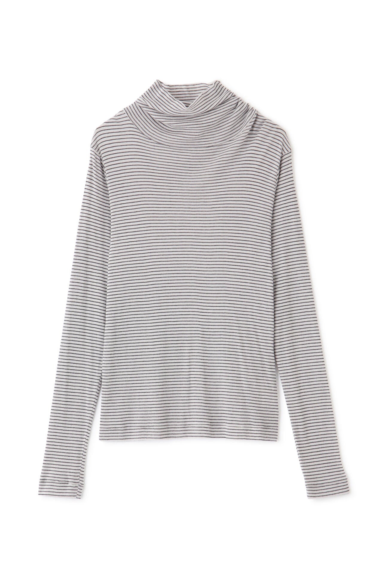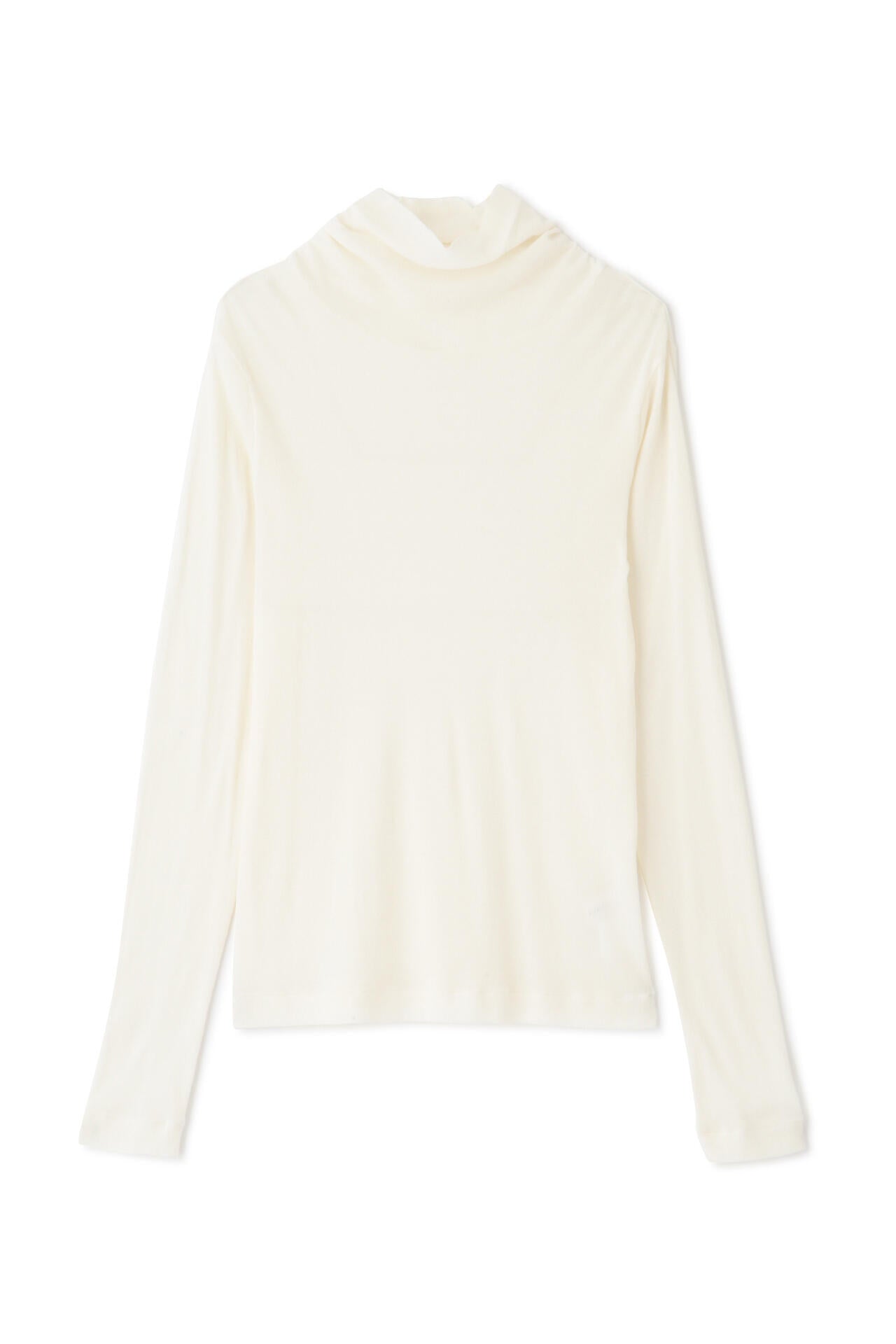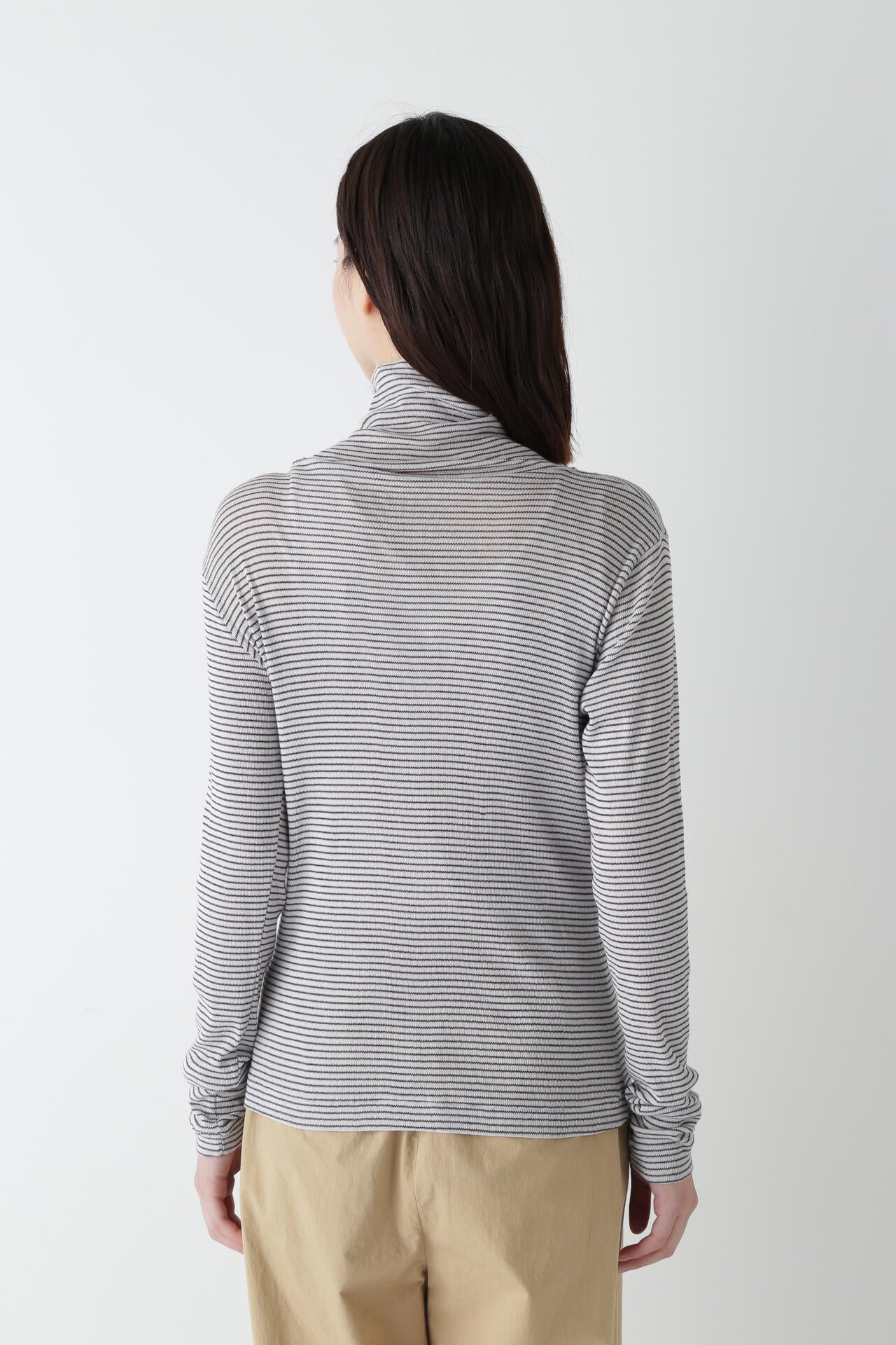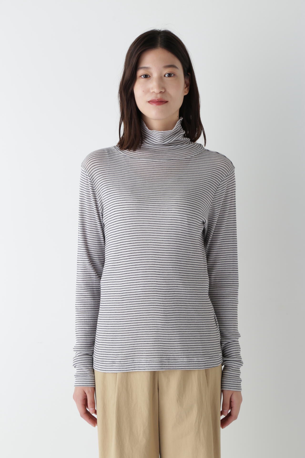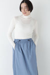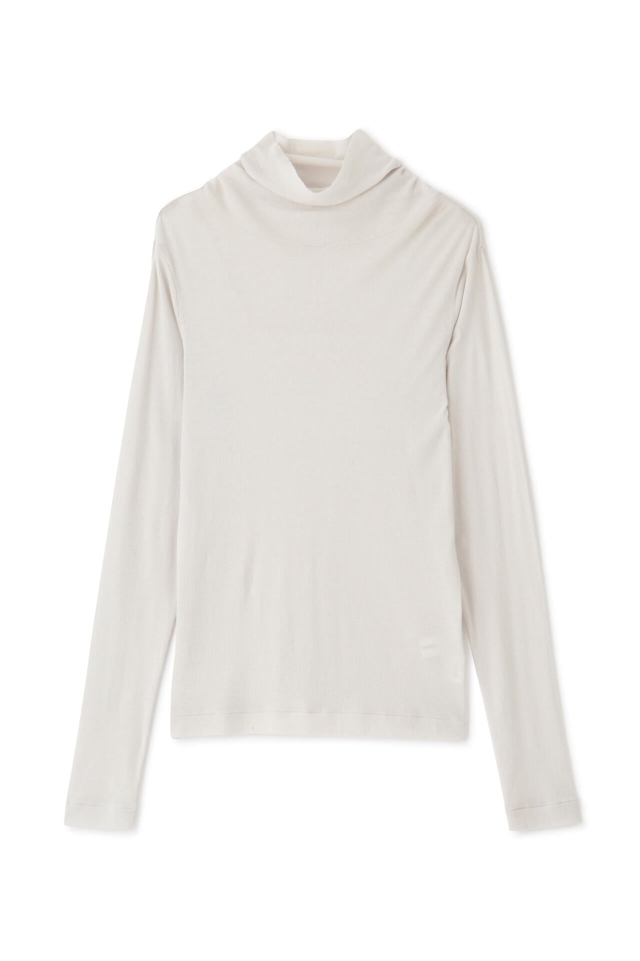 身体に程よくフィットするサイズ感のシアーテレコのタートルネックです。衿はややゆったりとした作りで衿端は断ち切りにしているので肌あたりもとても柔らかいです。