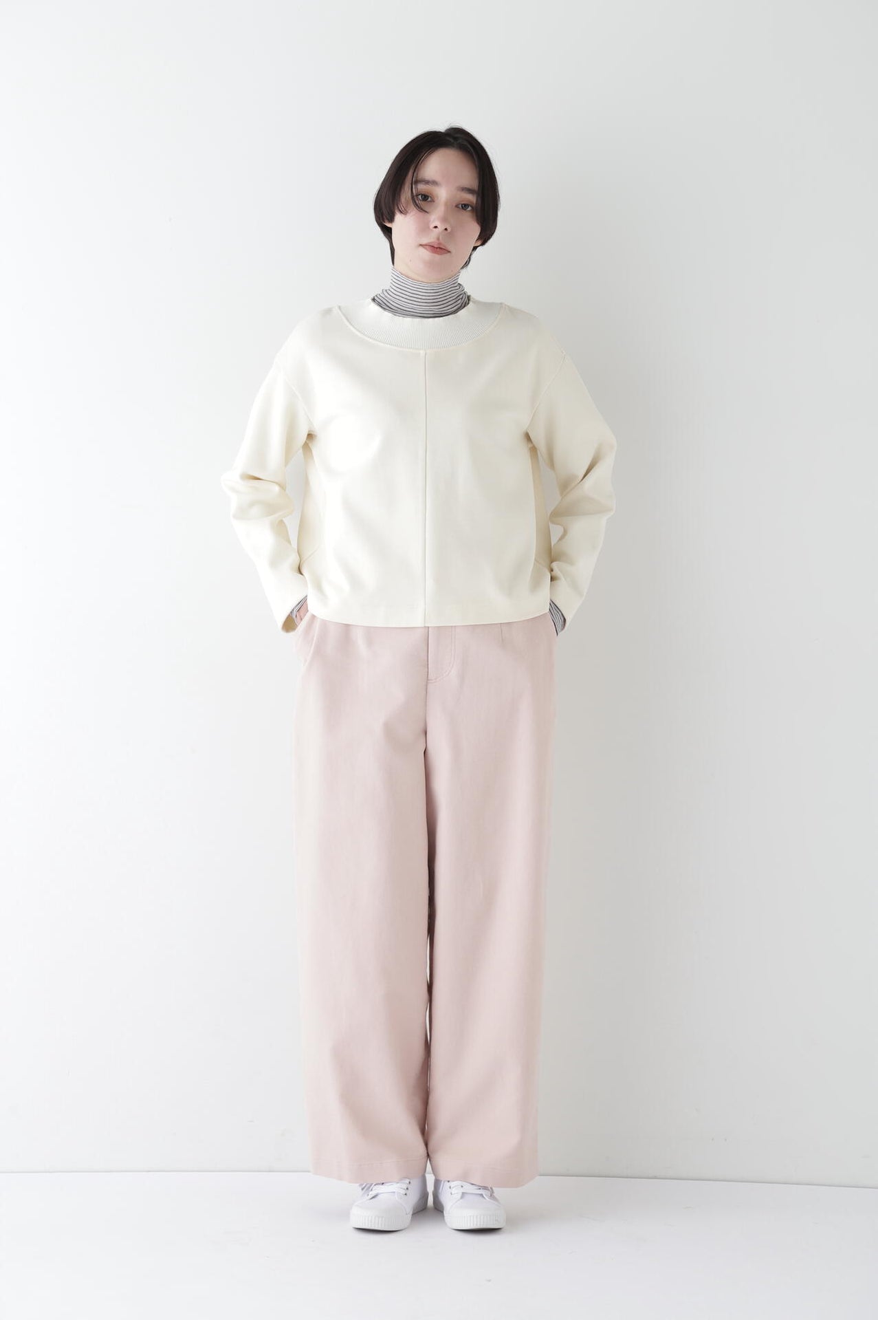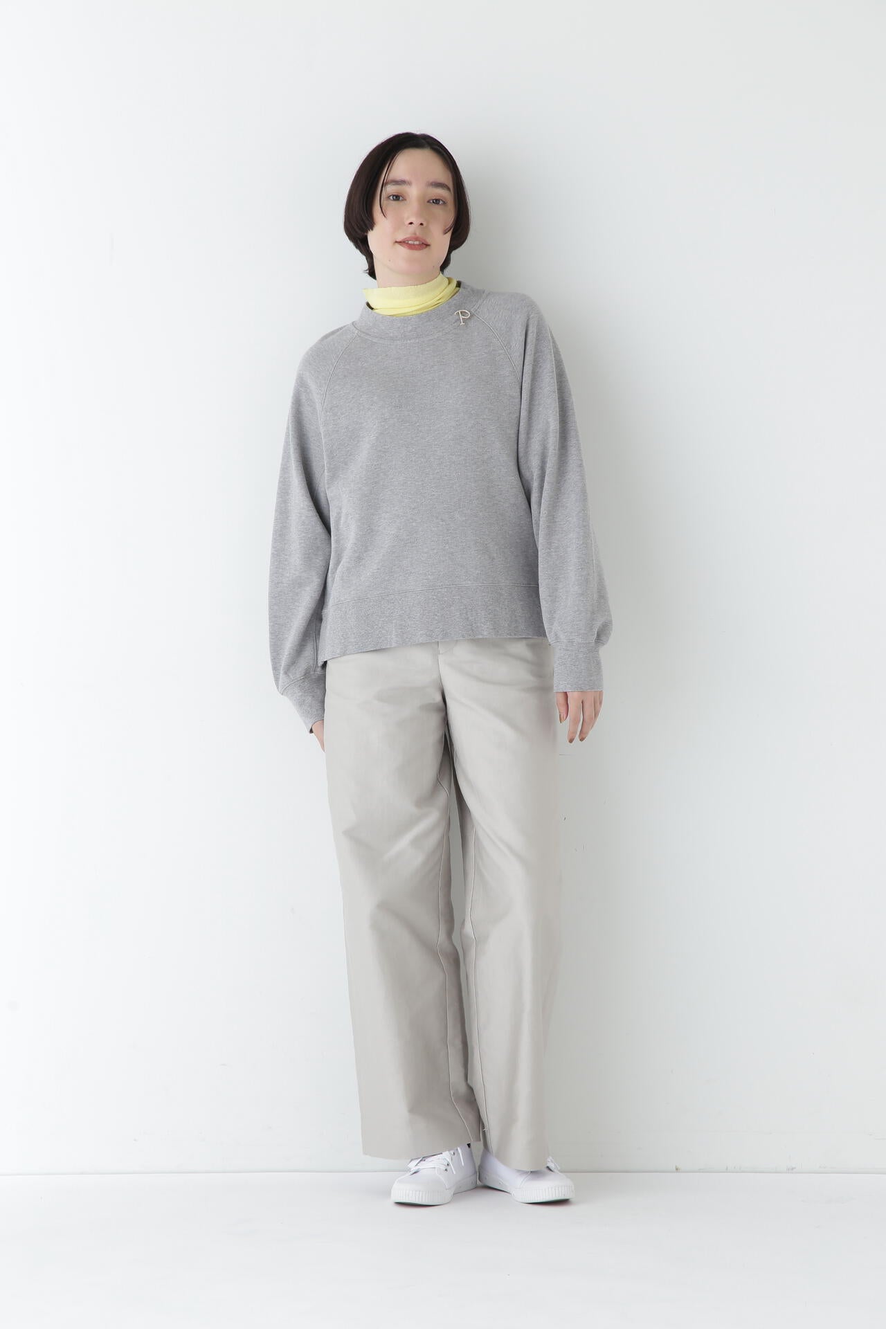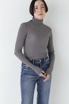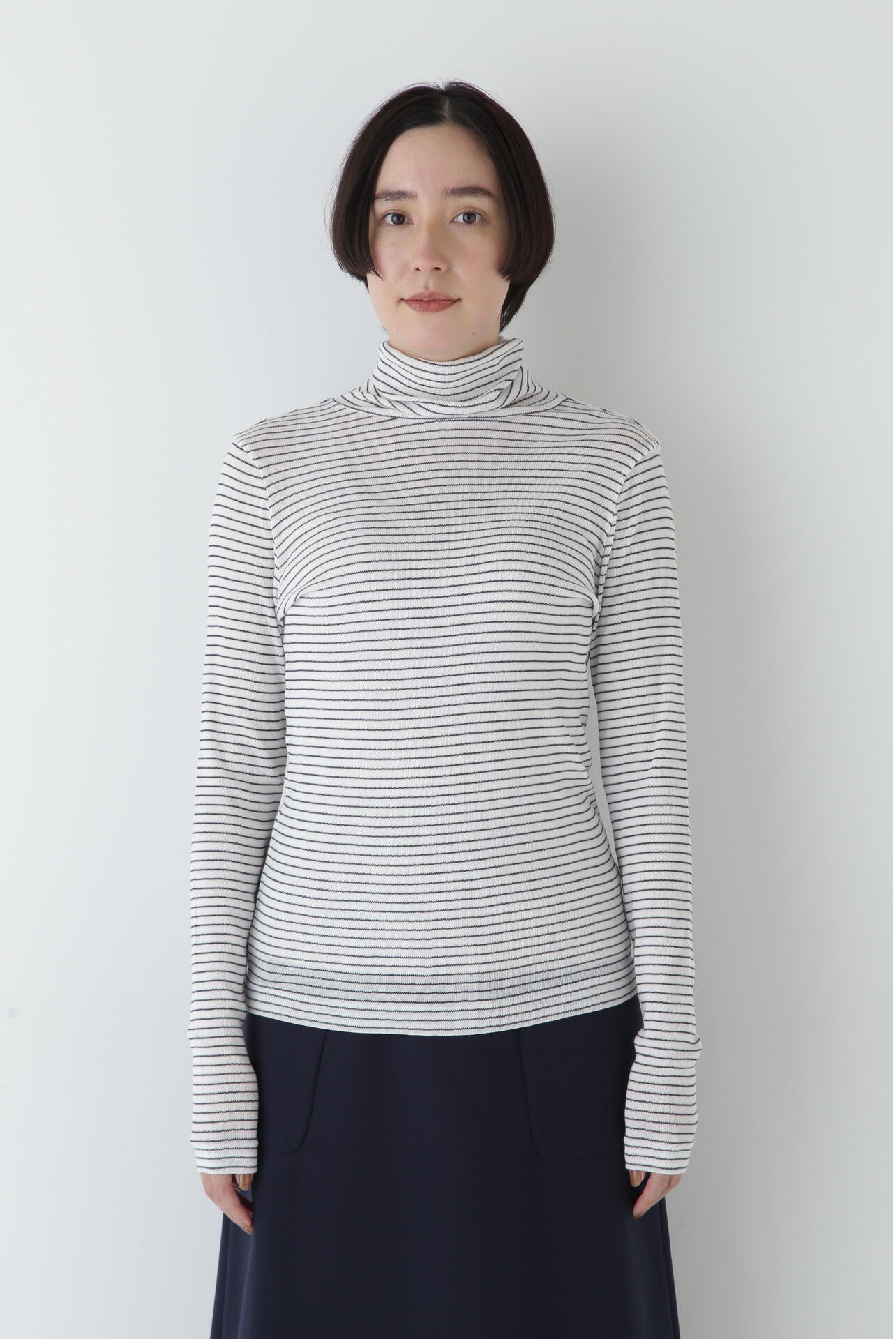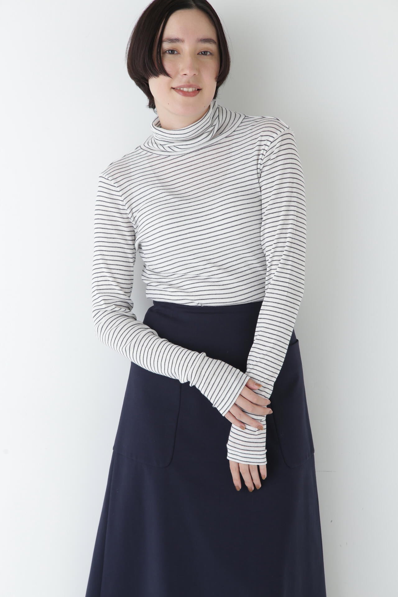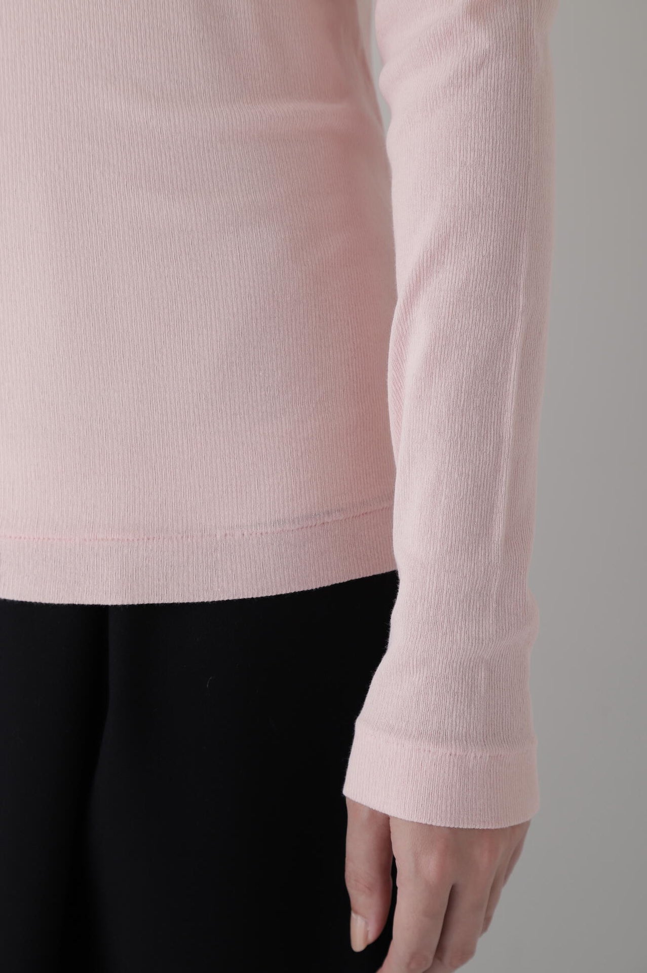 身体に程よくフィットするサイズ感のシアーテレコのタートルネックです。衿はややゆったりとした作りで衿端は断ち切りにしているので肌あたりもとても柔らかいです。