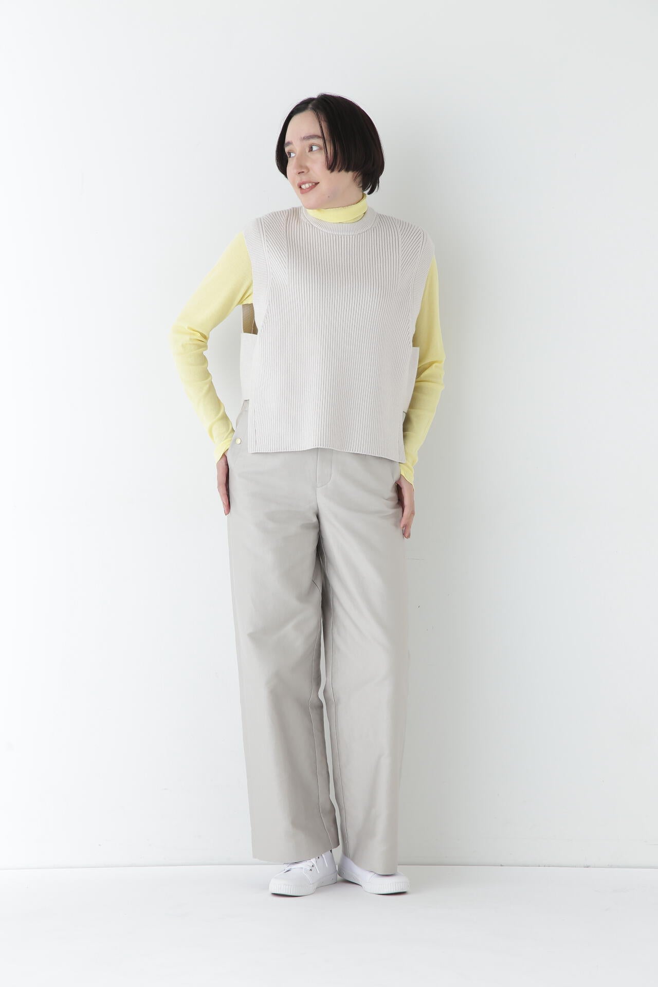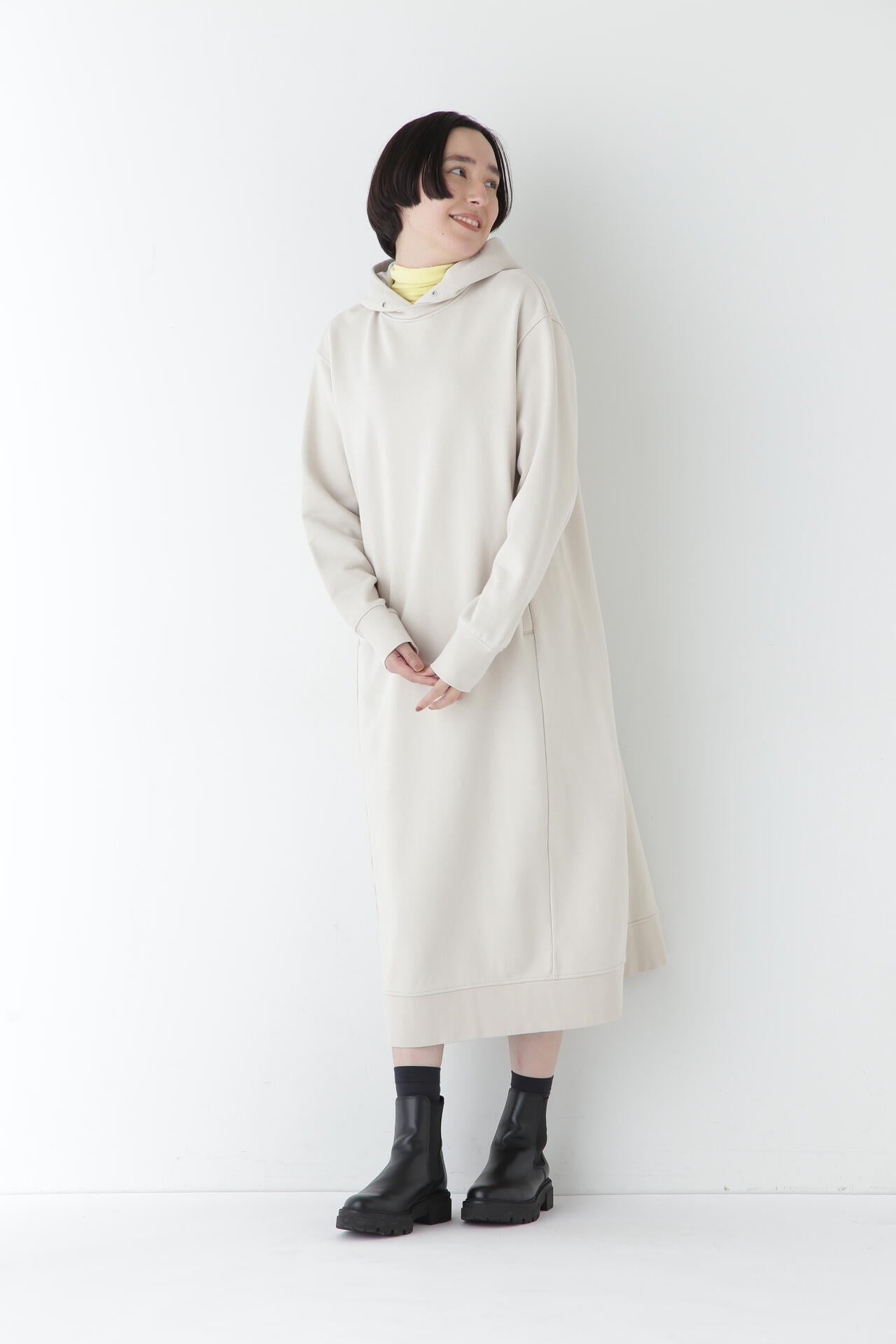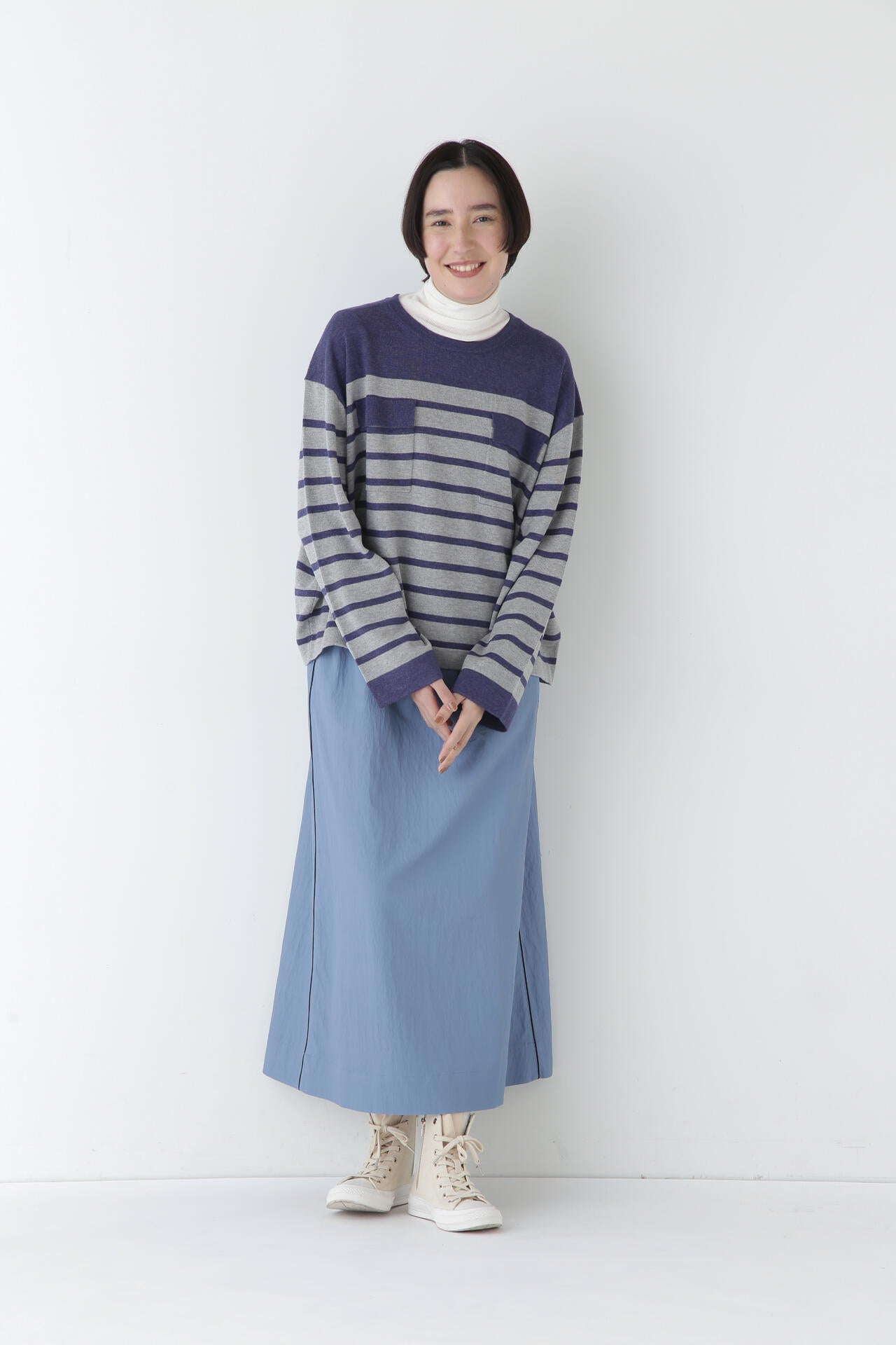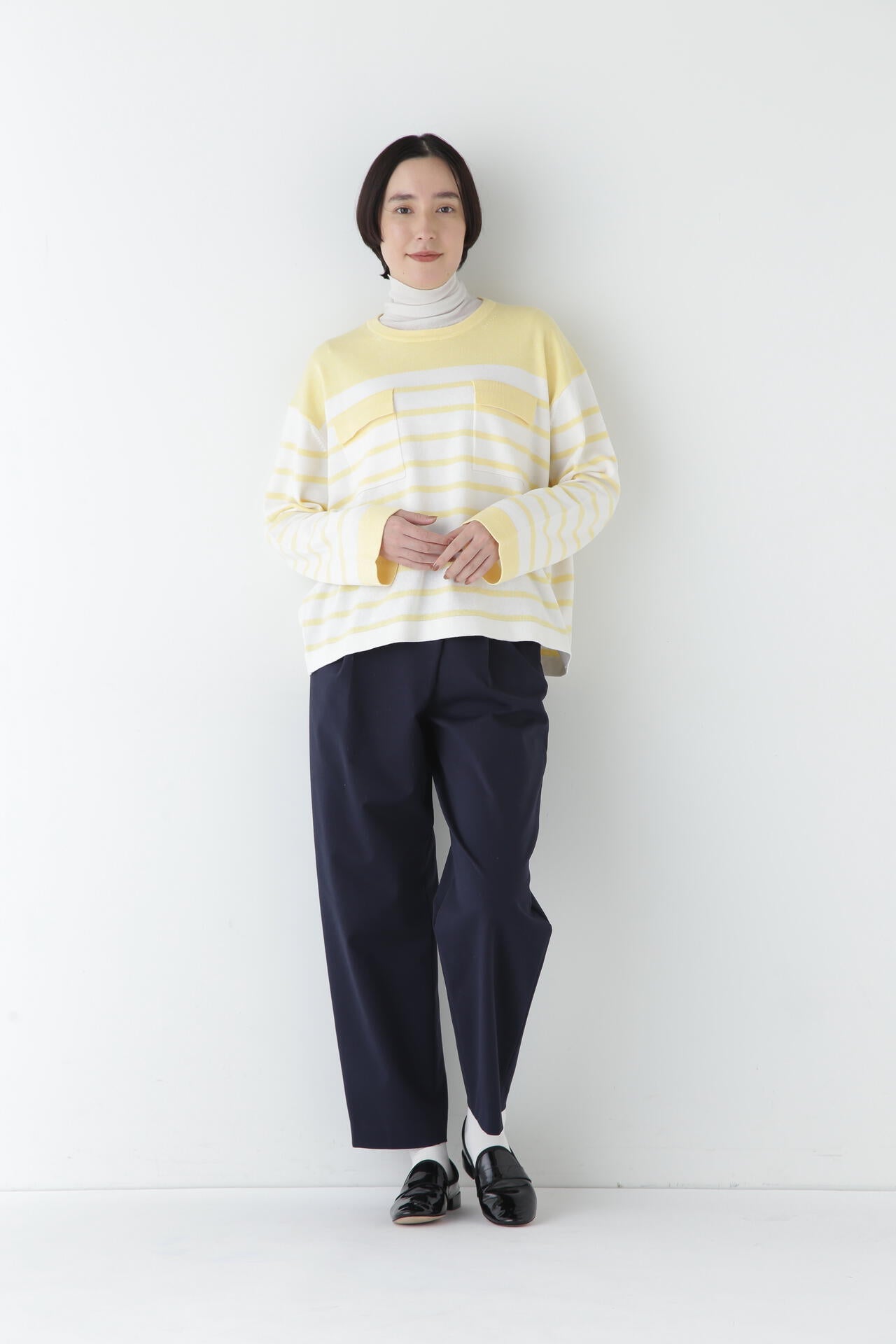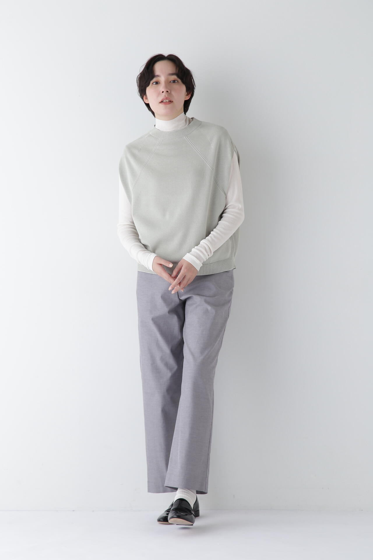 身体に程よくフィットするサイズ感のシアーテレコのタートルネックです。衿はややゆったりとした作りで衿端は断ち切りにしているので肌あたりもとても柔らかいです。