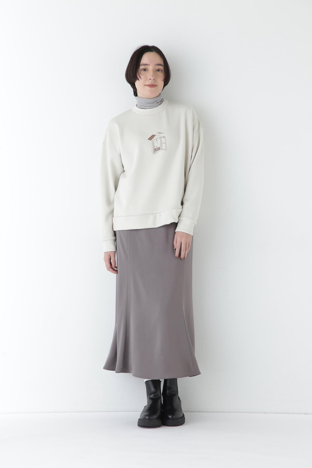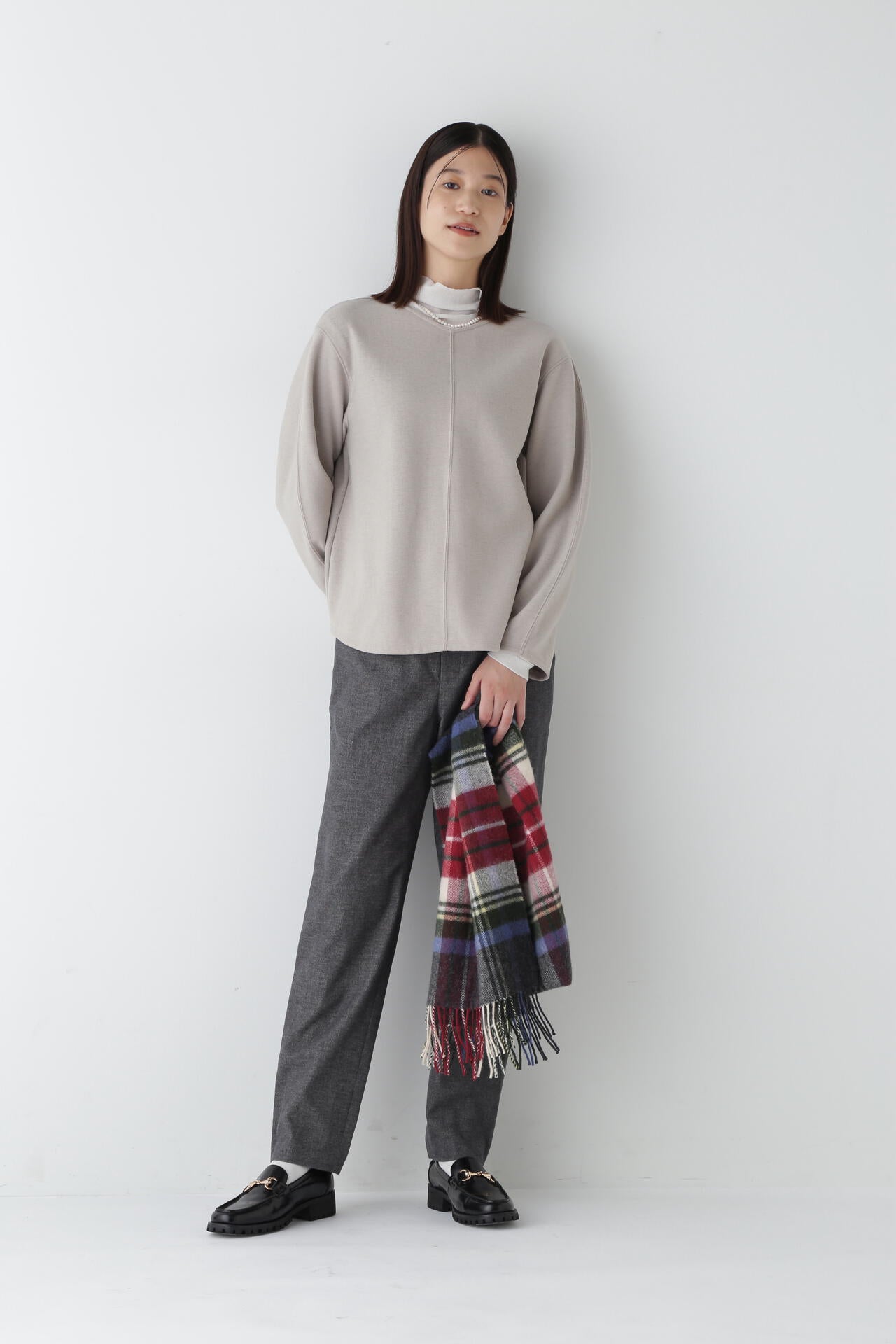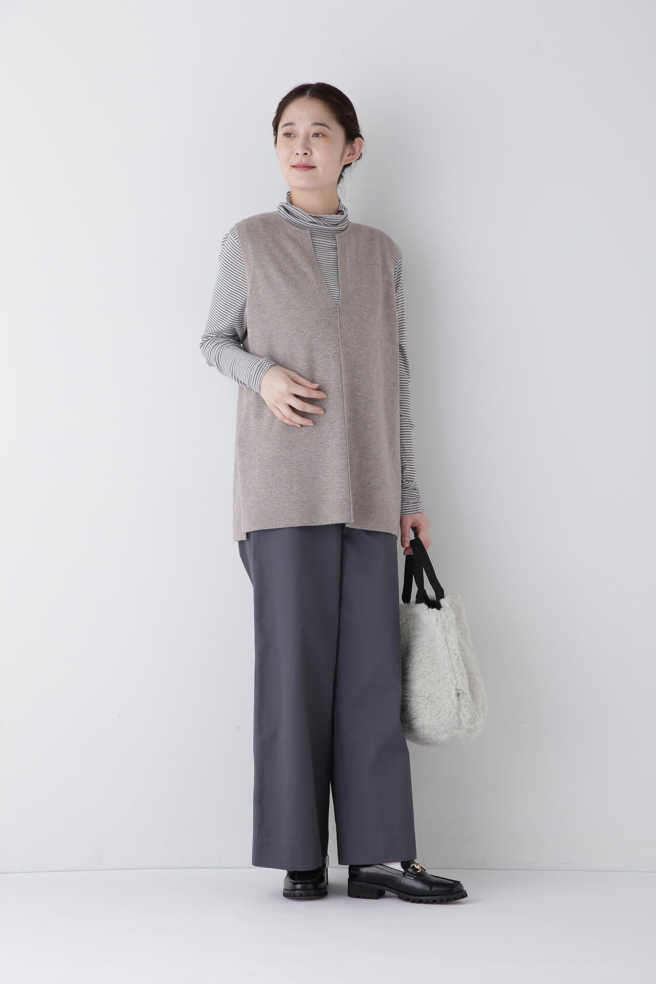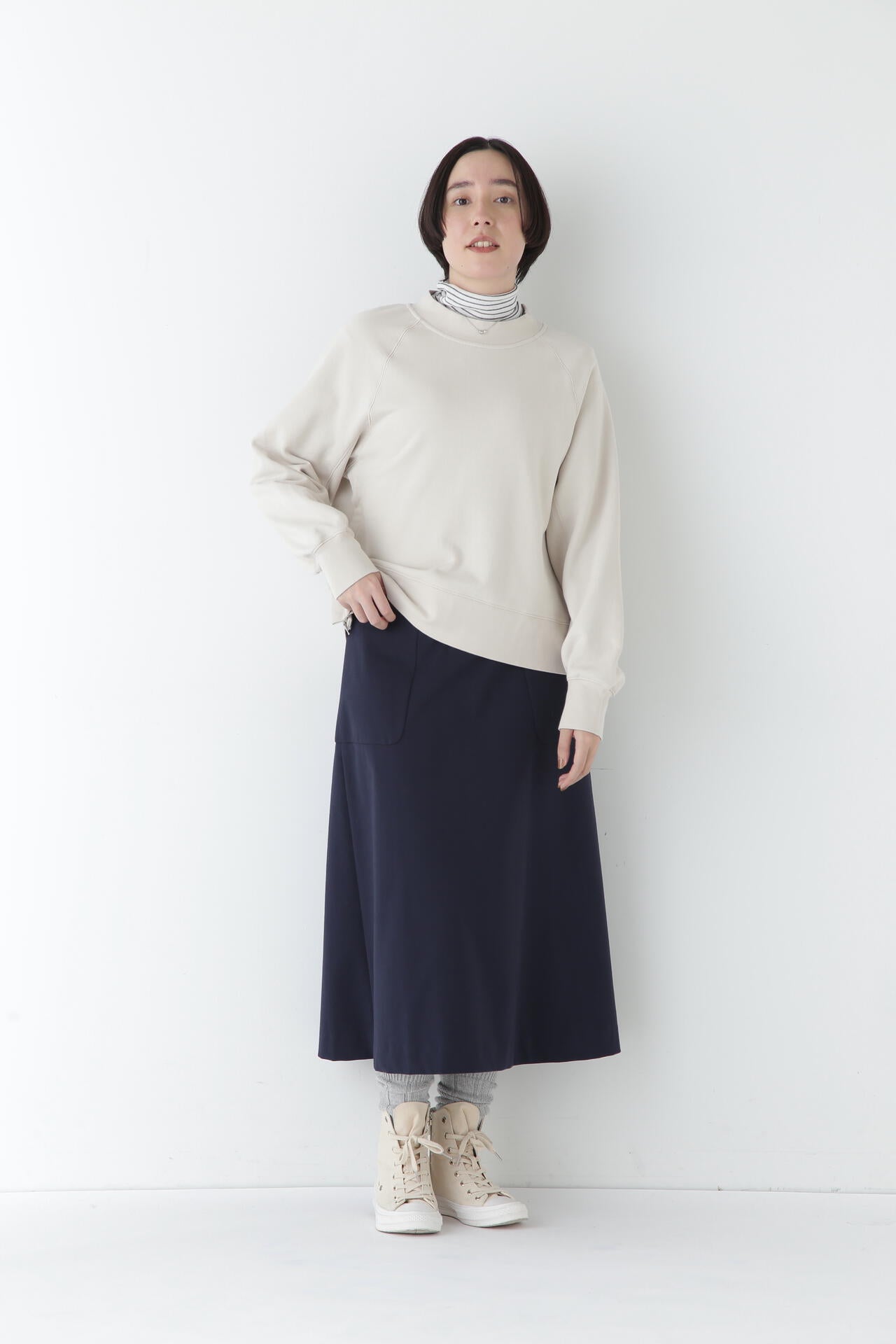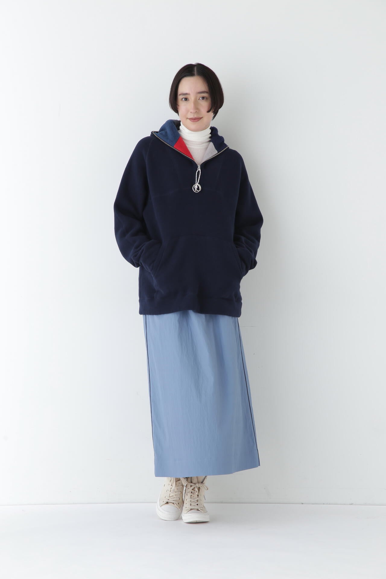 身体に程よくフィットするサイズ感のシアーテレコのタートルネックです。衿はややゆったりとした作りで衿端は断ち切りにしているので肌あたりもとても柔らかいです。