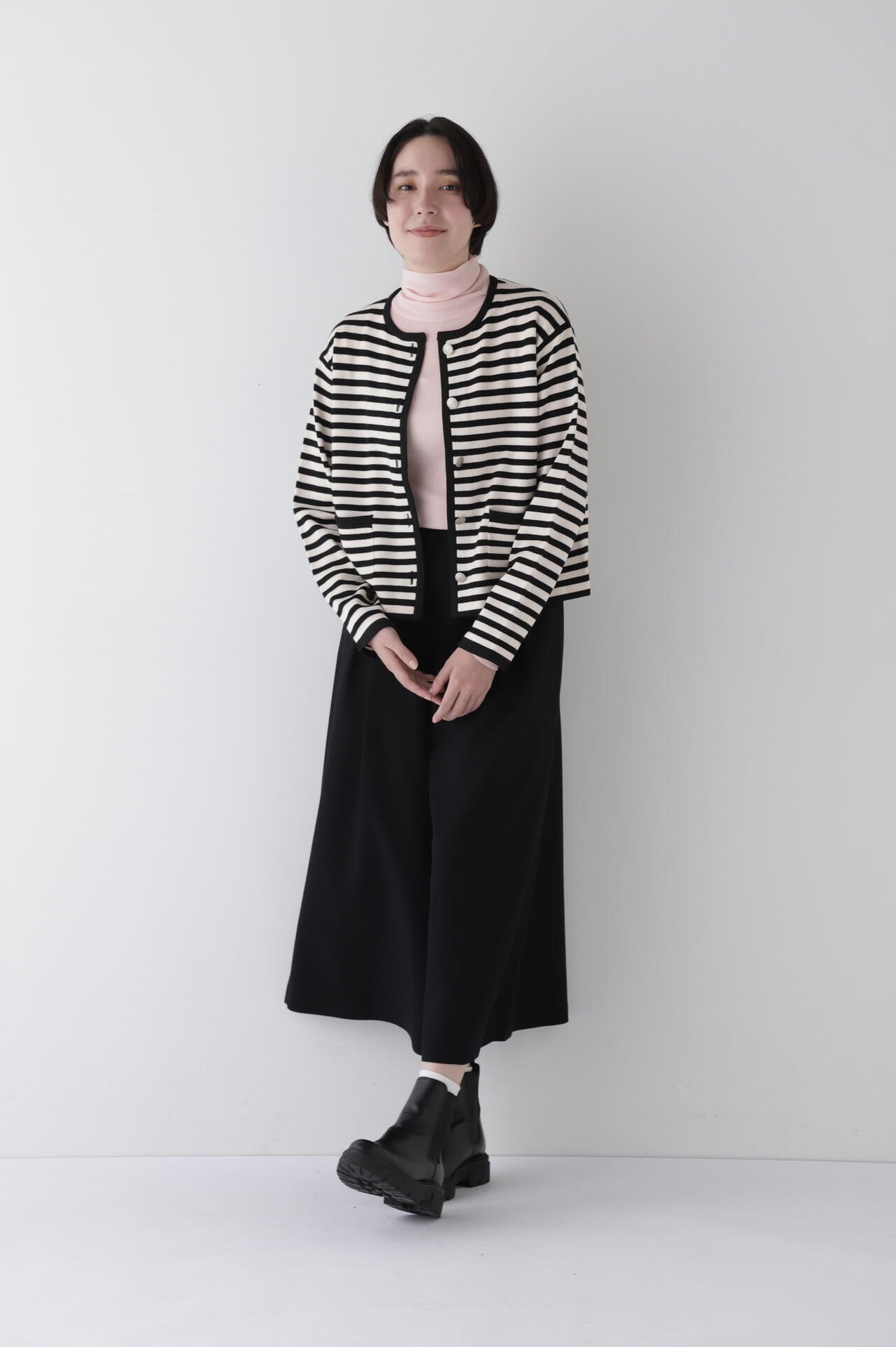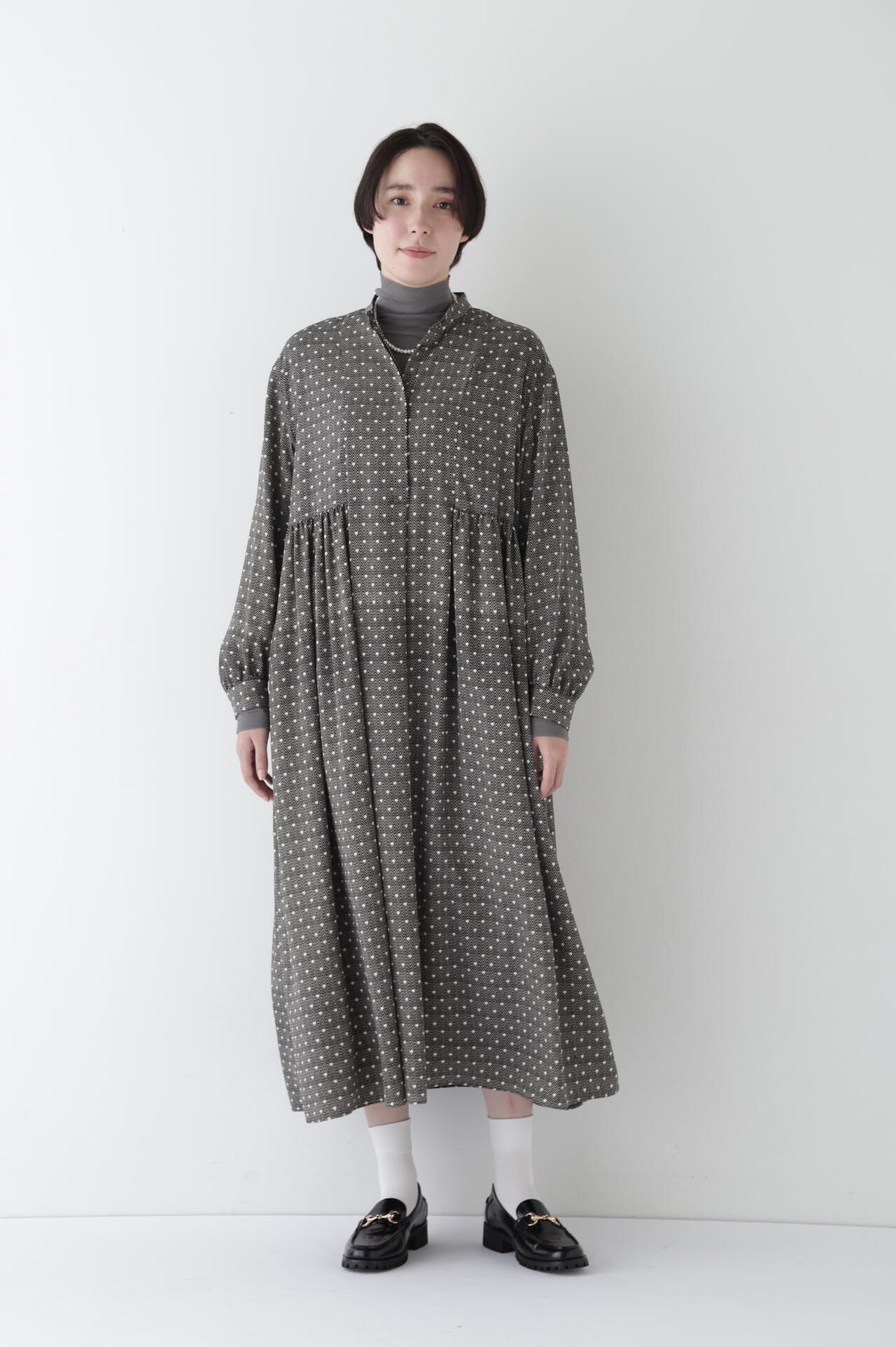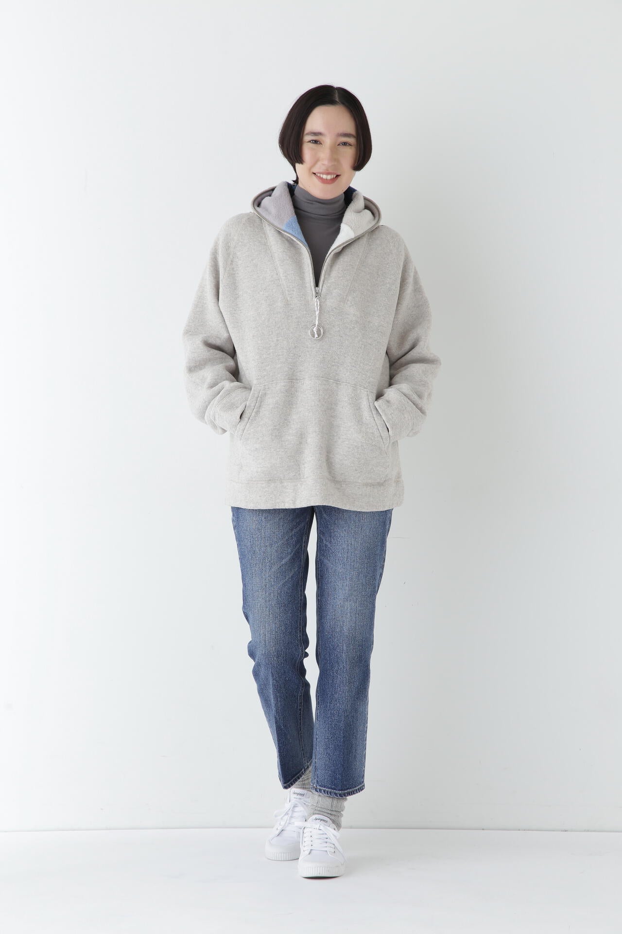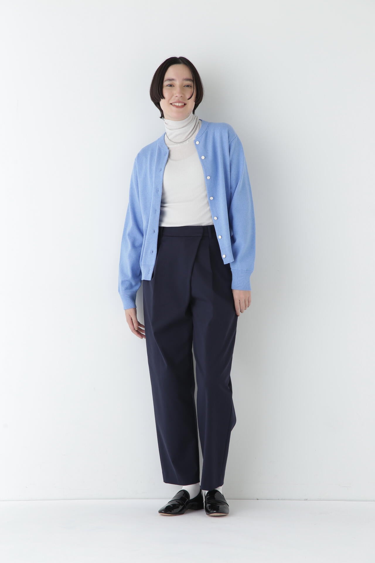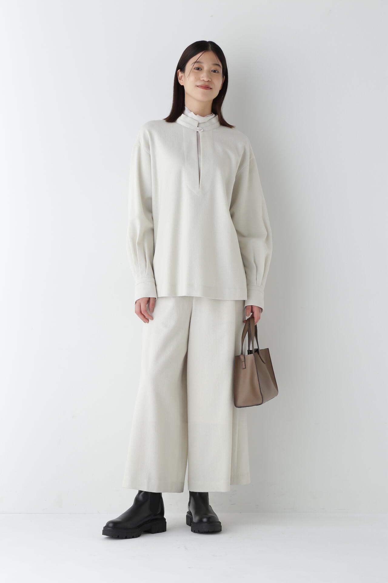 身体に程よくフィットするサイズ感のシアーテレコのタートルネックです。衿はややゆったりとした作りで衿端は断ち切りにしているので肌あたりもとても柔らかいです。