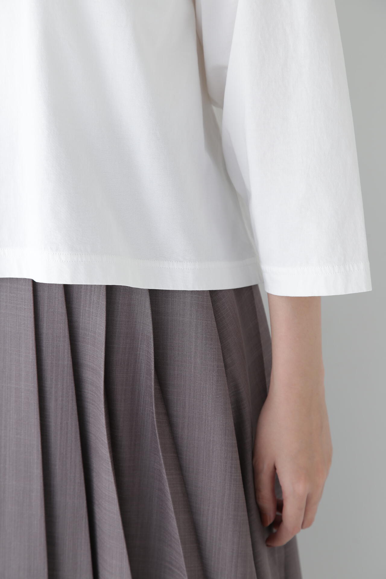 ハイゲージの天竺で白でも透けにくく薄手ながらハリ感があります。クリアーな表面は毛羽が少ないのでオンオフどちらでも使えます。