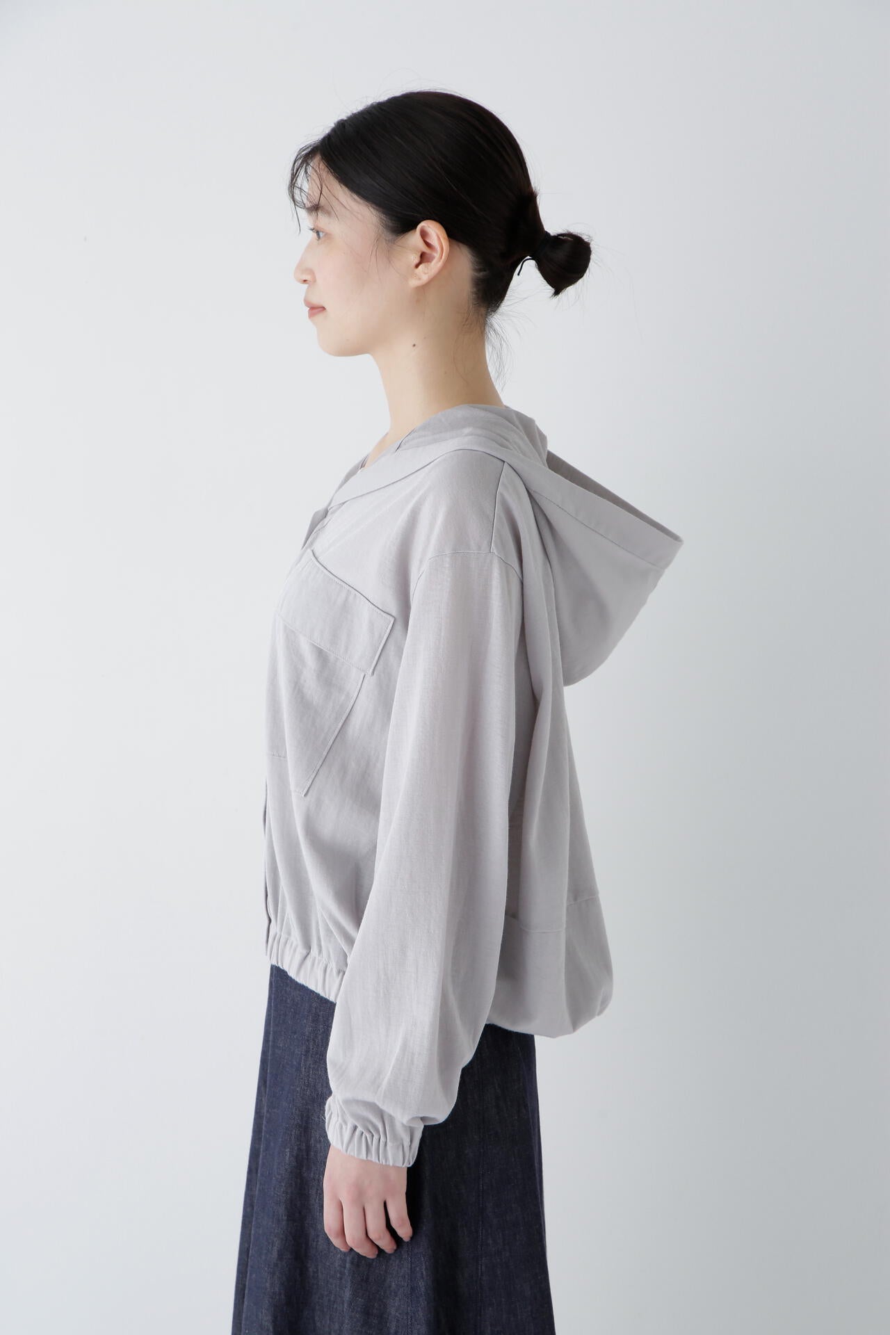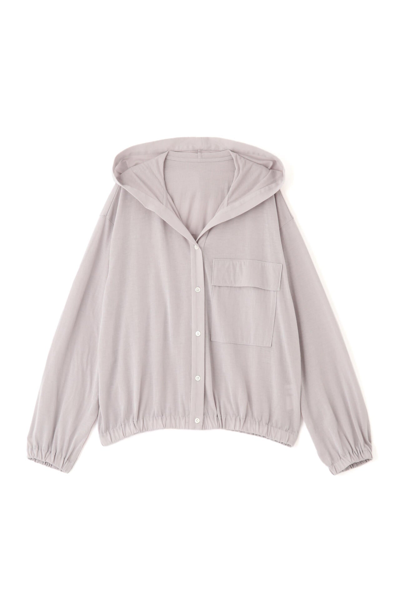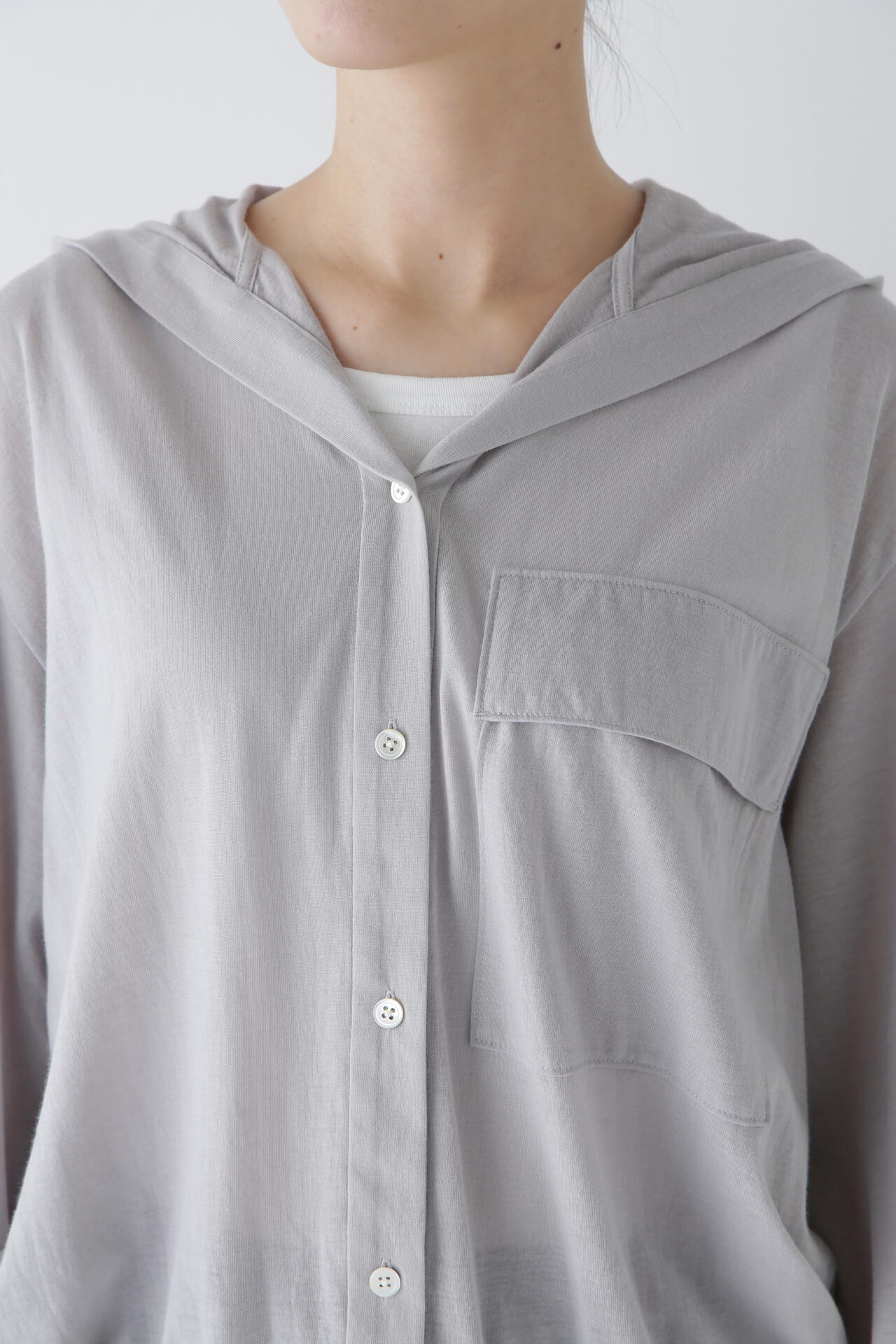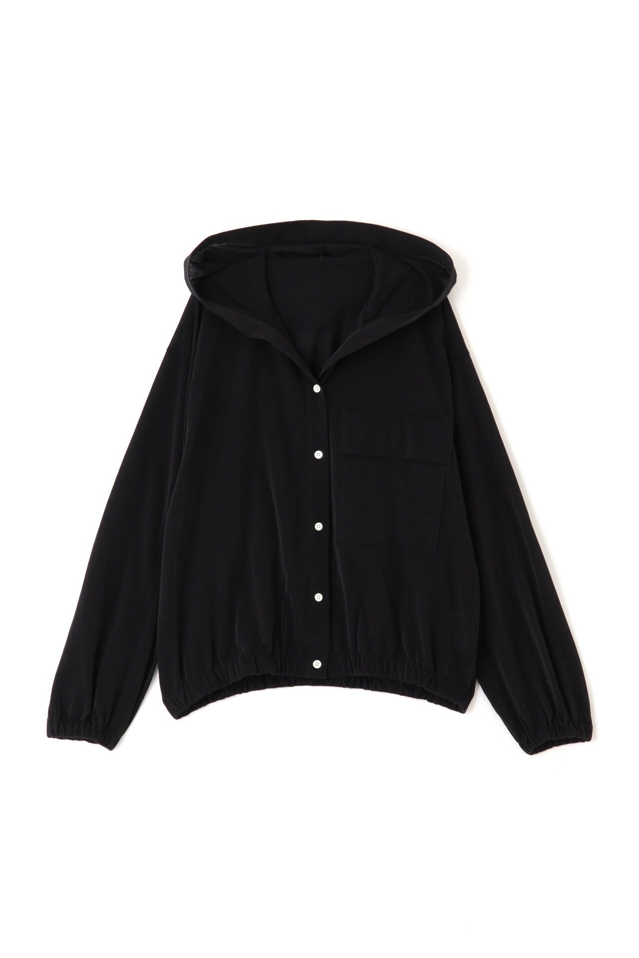 大きめ胸ポケットが特徴のフーディー。スパークナイロン入りの薄手素材で控えめに光沢がある天竺素材は 今年のトレンド素材です。長すぎない丈感と後ろ身頃のボリューム感がポイントです。