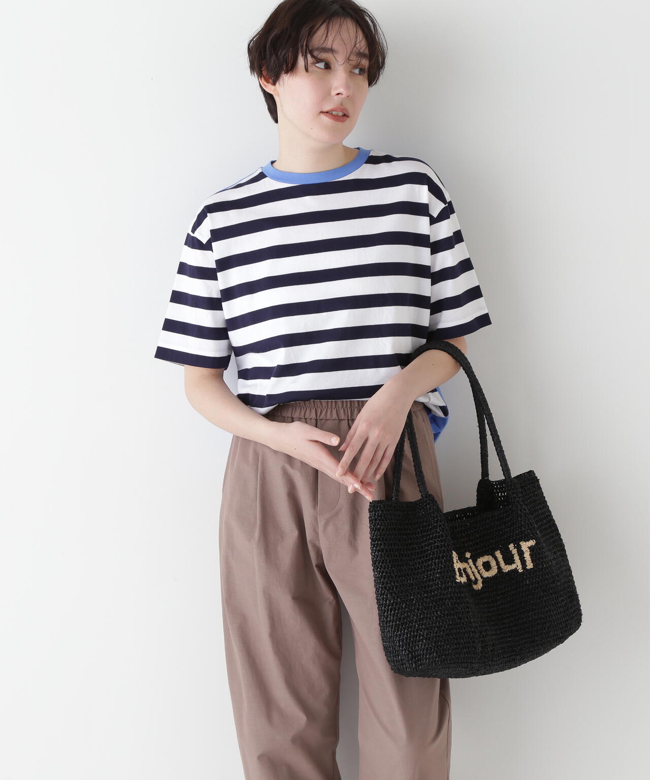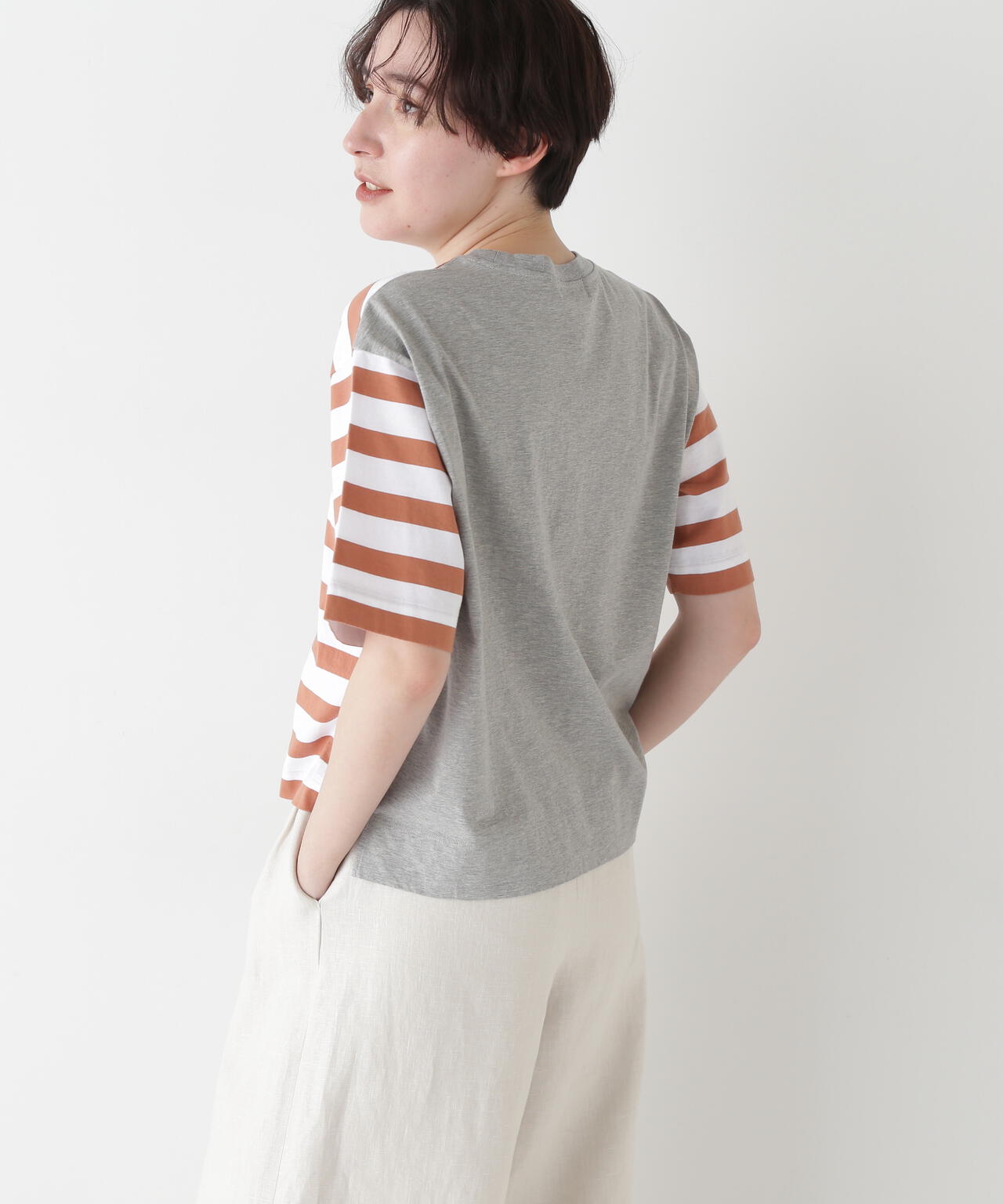 遊び心ある切り替えが目を惹くボーダーカットソー