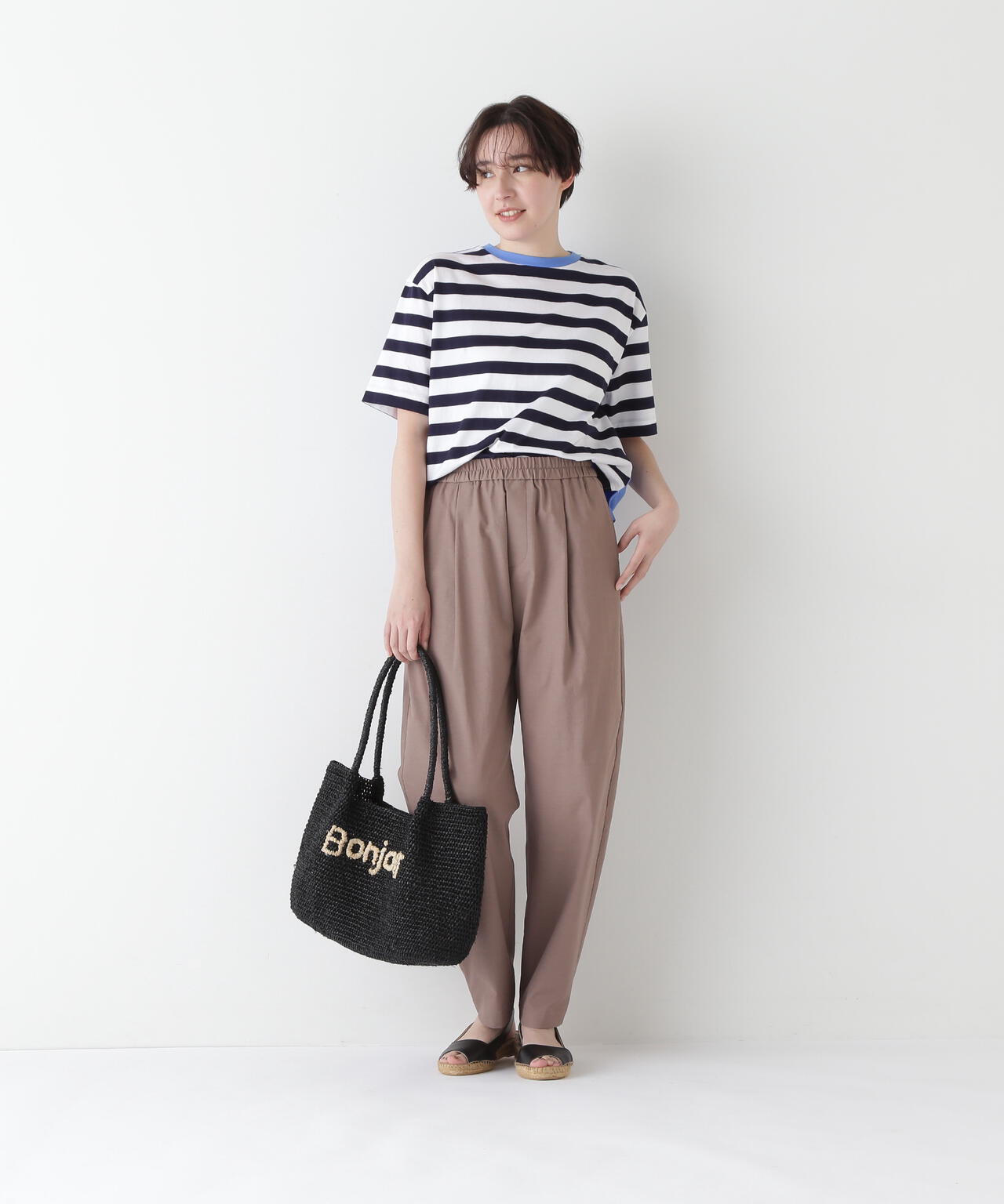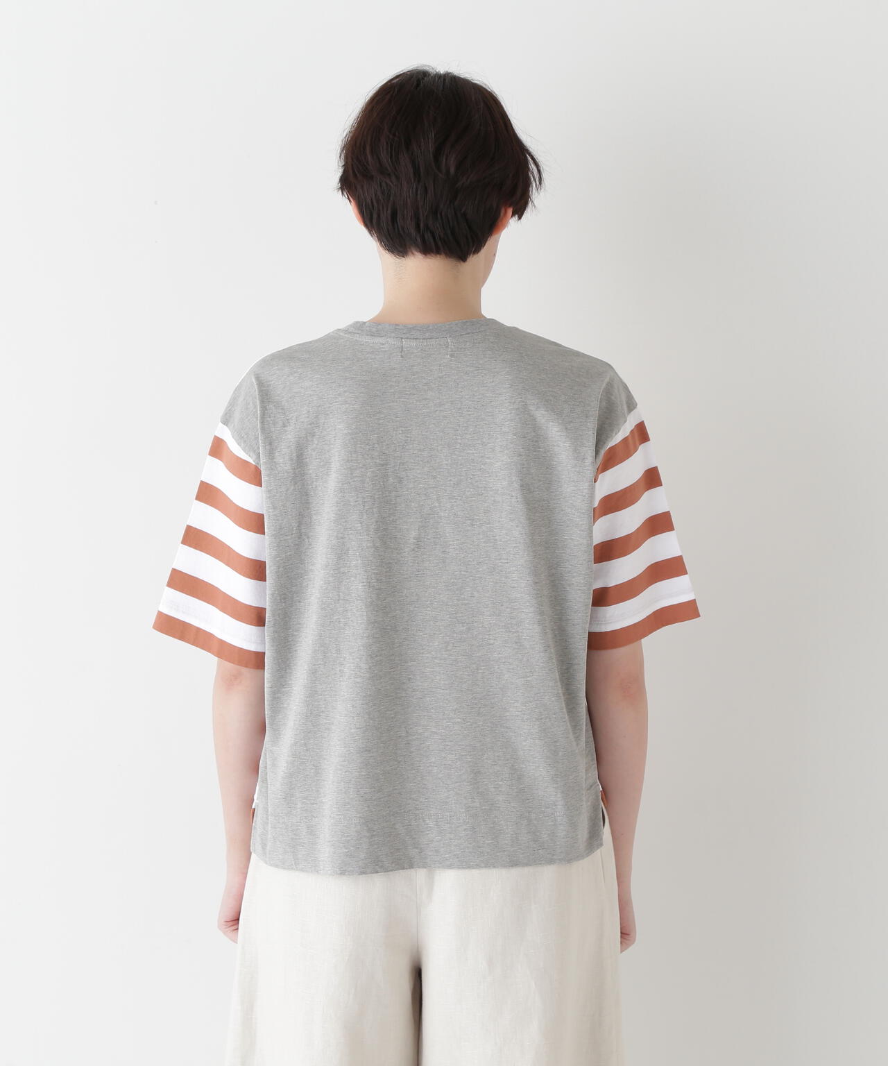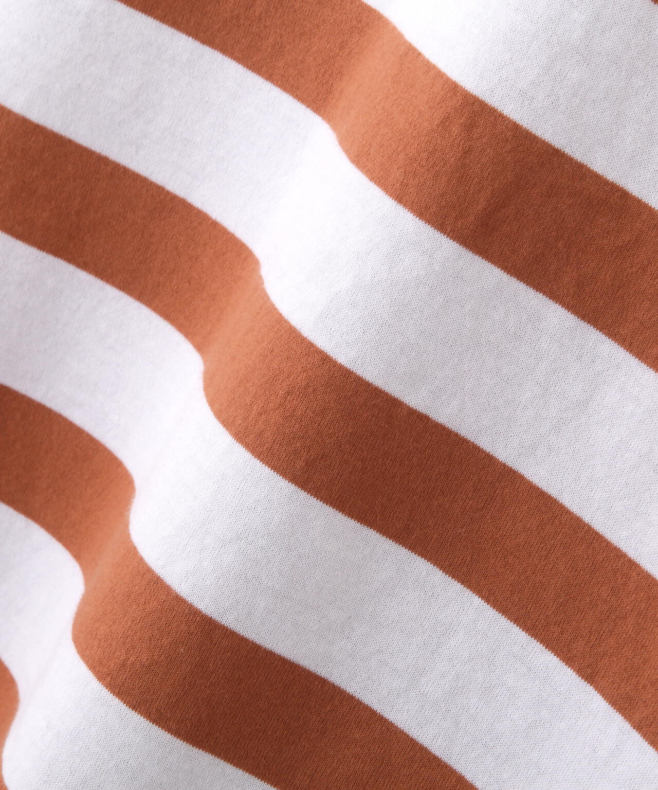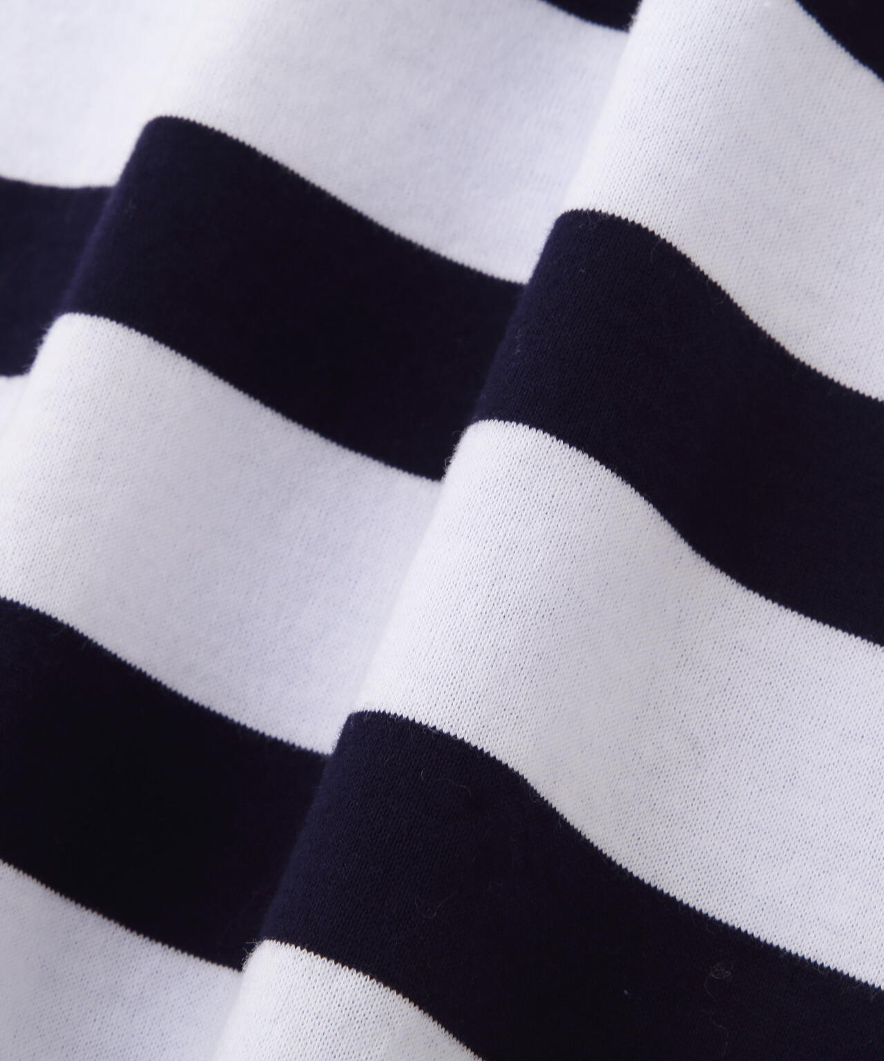 ボーダーはシルケット加工により毛羽の少ないきれい目な表情でさらっとしたタッチです。後ろ身頃の無地天竺はボーダーより一角薄く、強撚ガス焼きでキレイな目ヅラで滑らかな風合いが心地よいです。