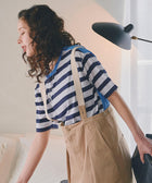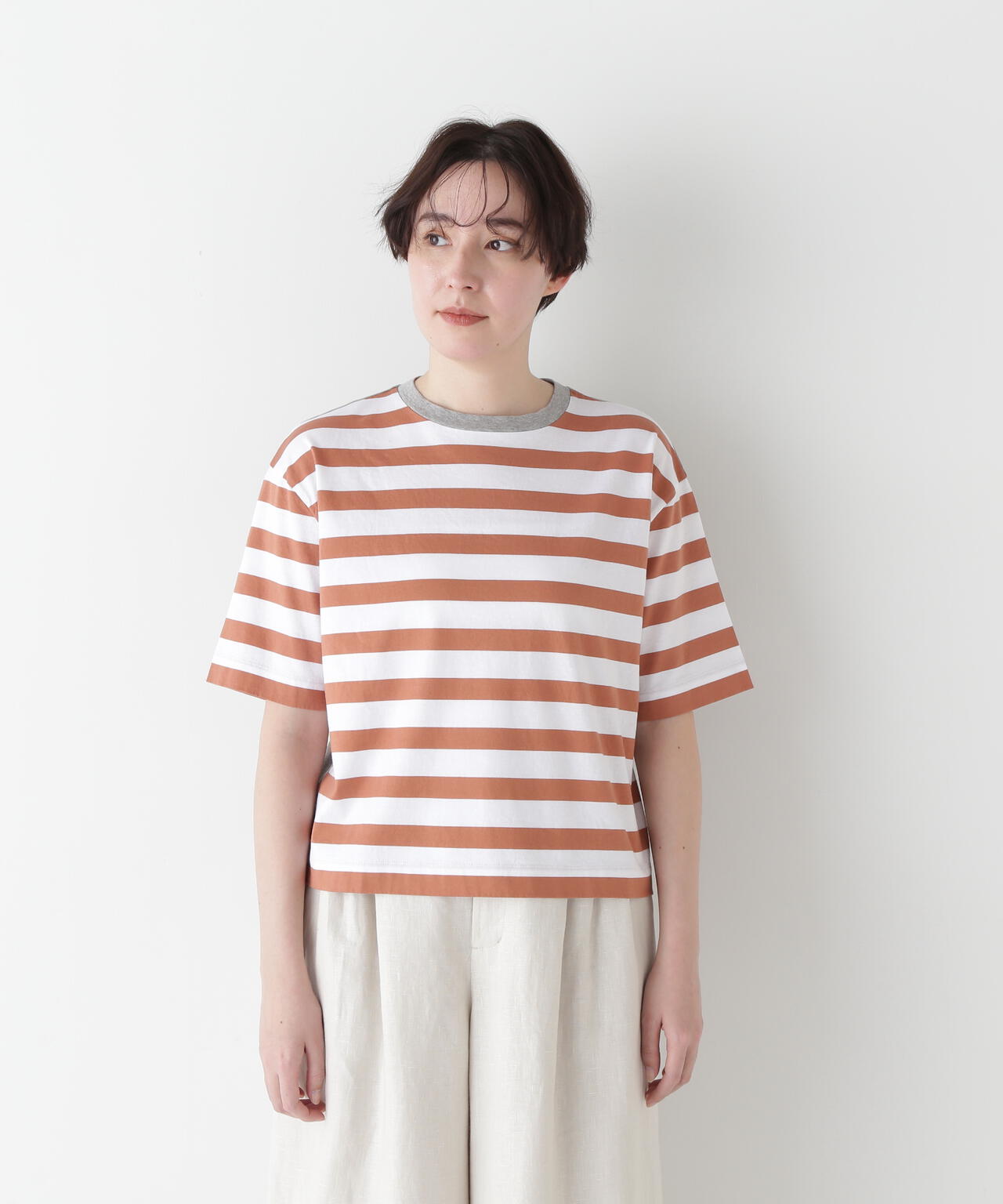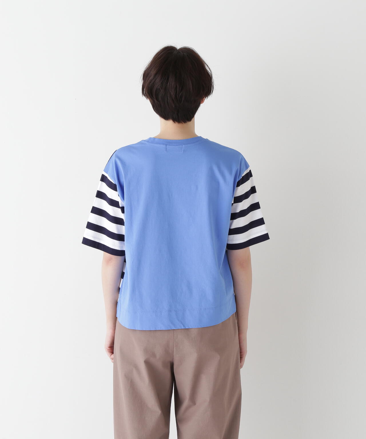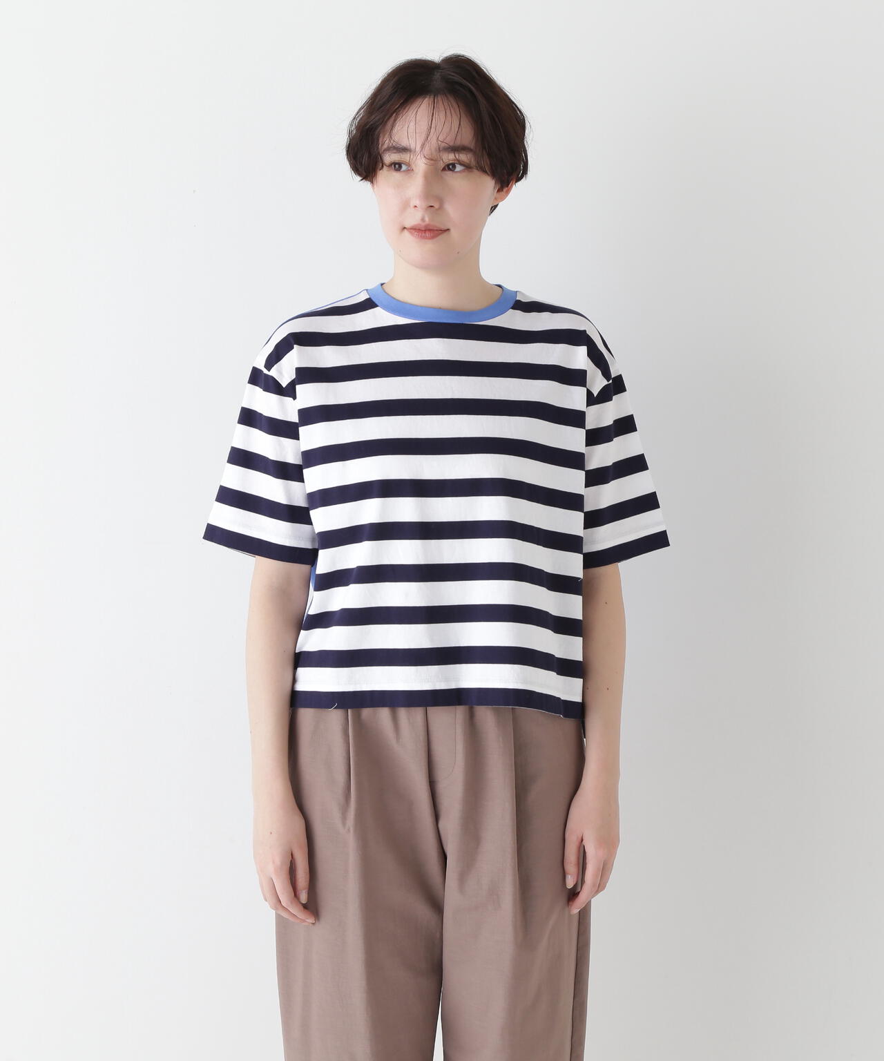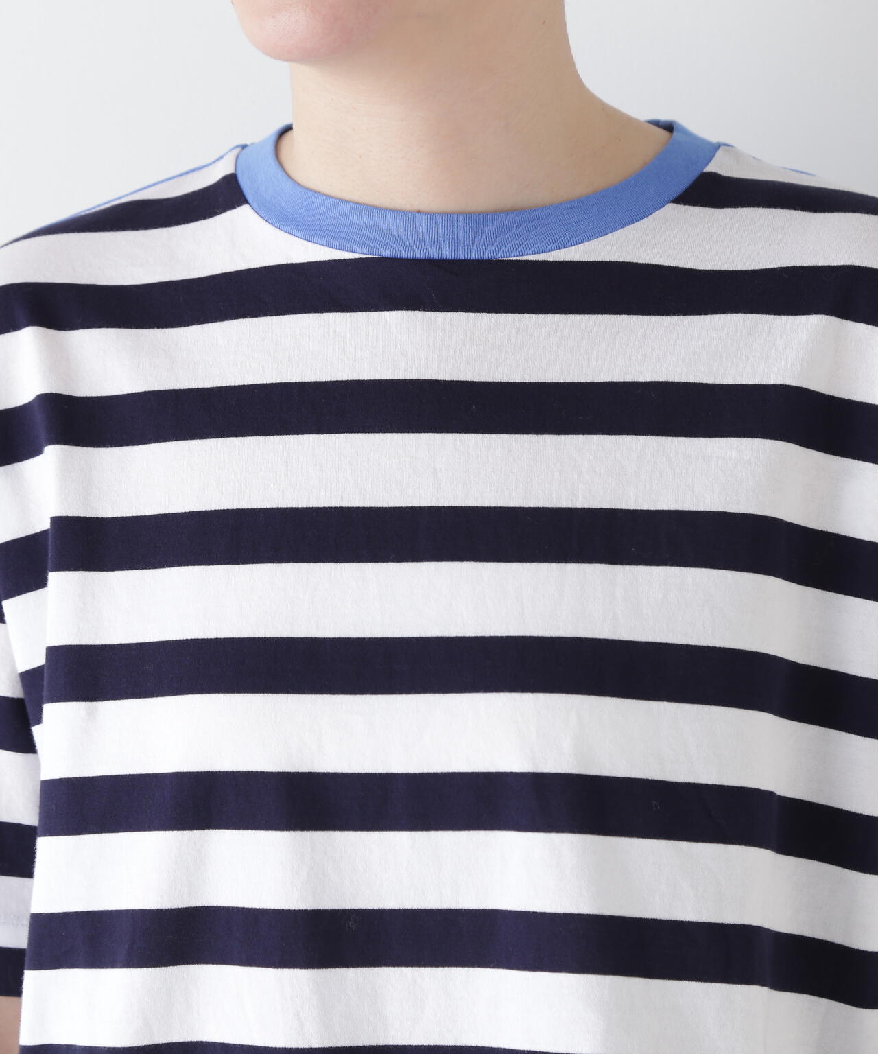 前身頃と袖がボーダー、後身頃と衿フライスは無地で配色になっているクルーネックTシャツ。ボーダーも太めでカジュアル感があり、配色で楽しめるTシャツです。