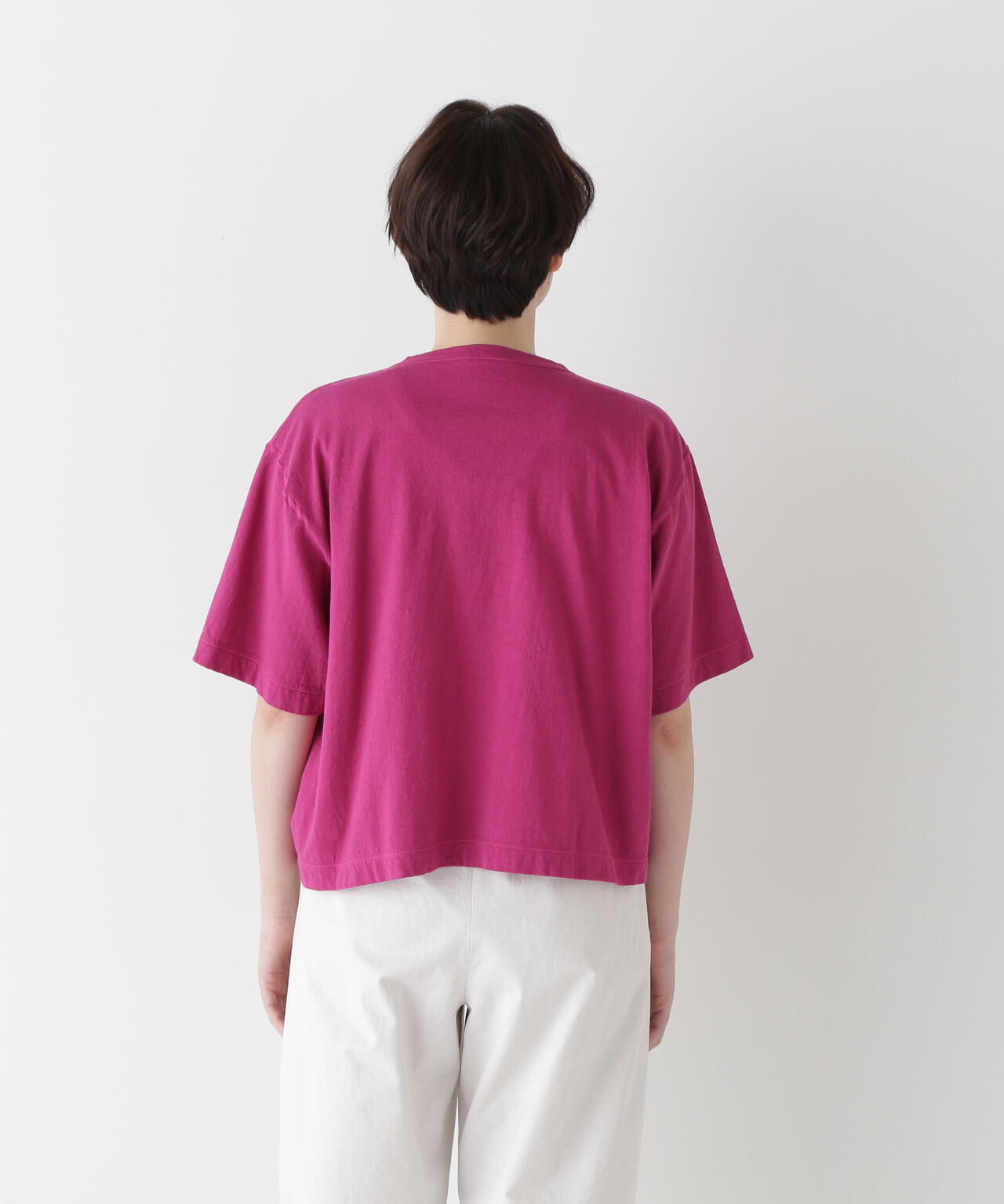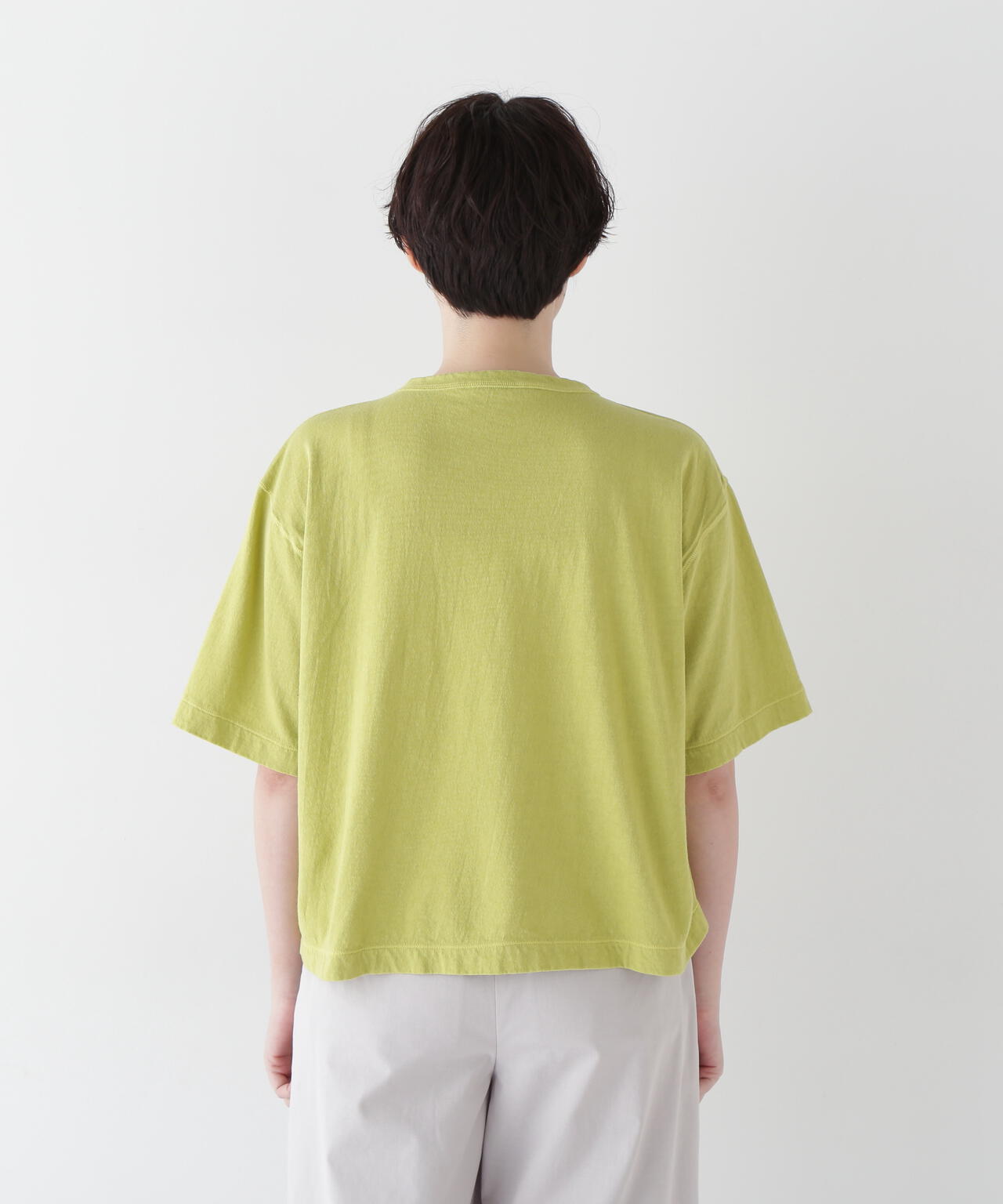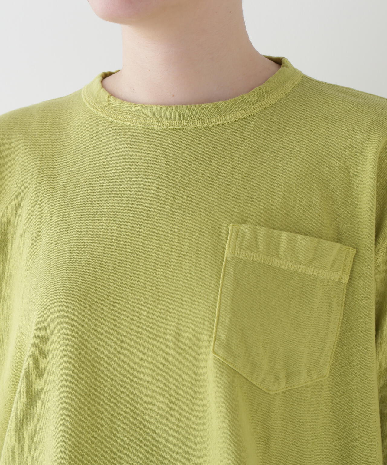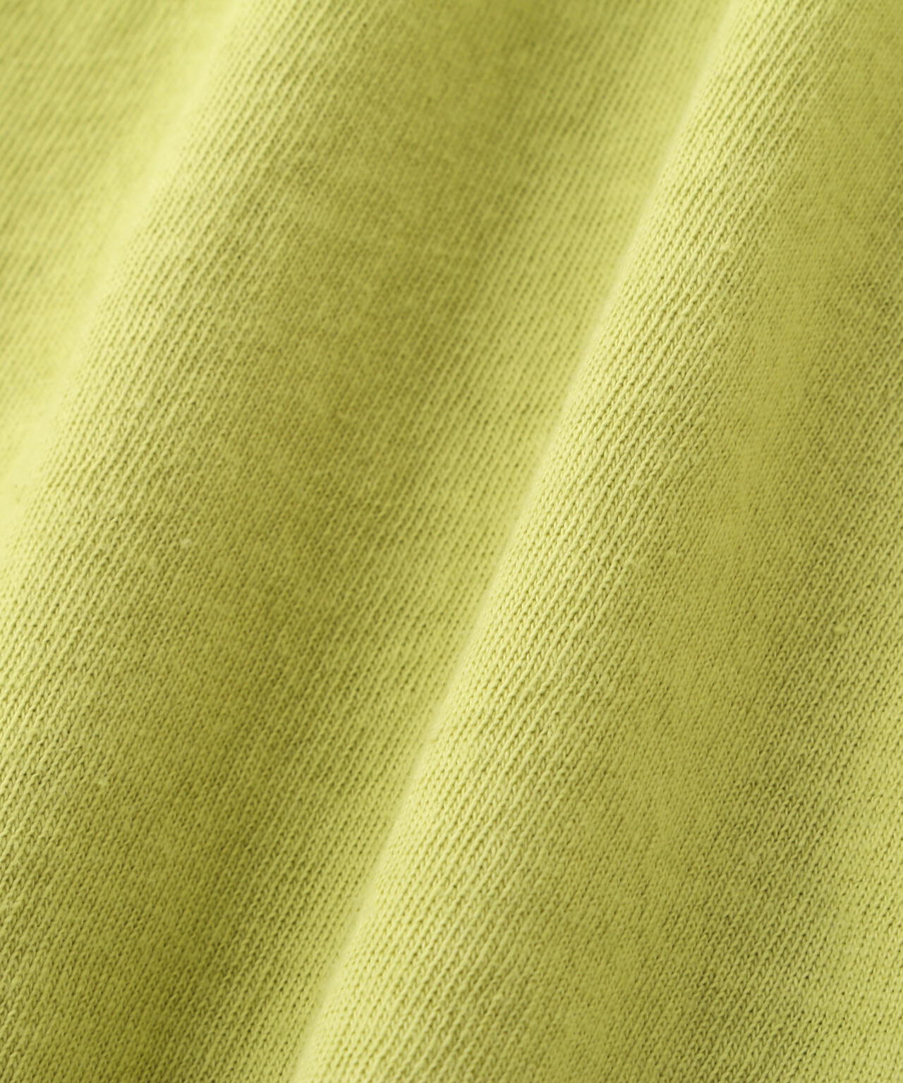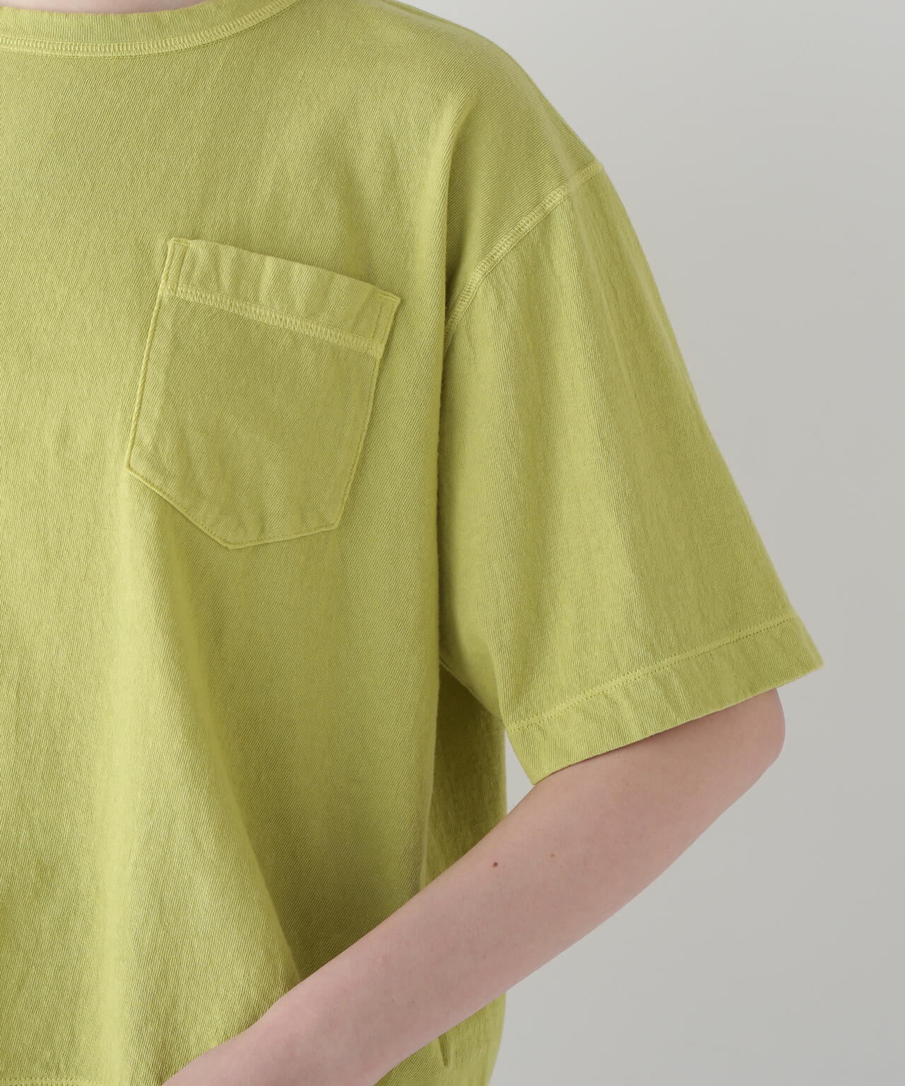 シーズンのポイントカラーを表現したカジュアルな製品染Tシャツです。ニュアンス感を出す為に接ぎ目は表振りミシンで縫製しています。後ろ襟ぐり裏の舟形に挟み込んだグログランテープも製品染めらしく一緒に染めています。