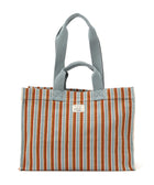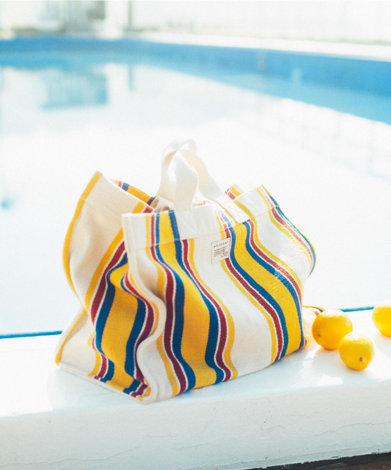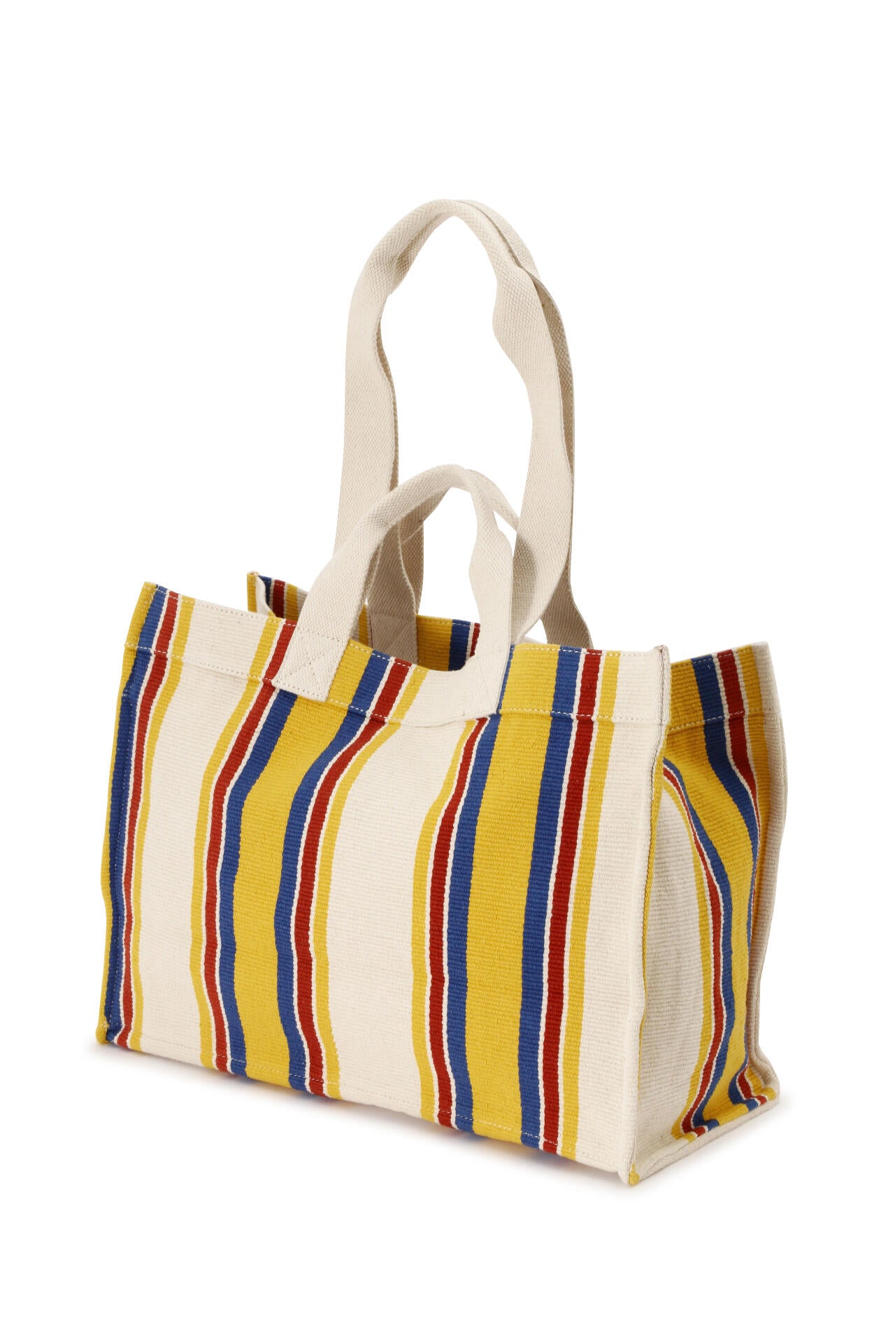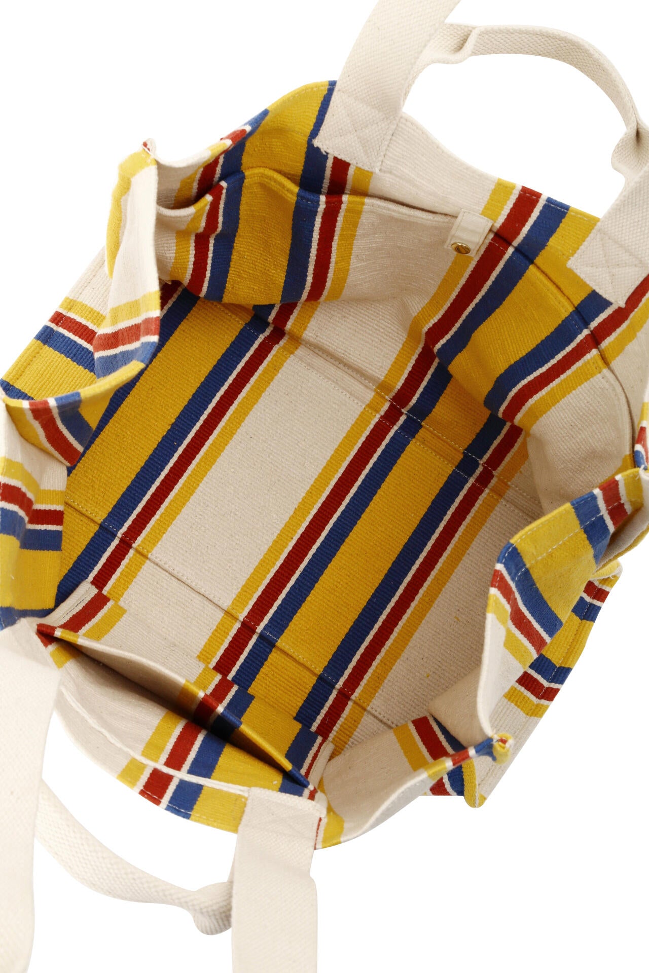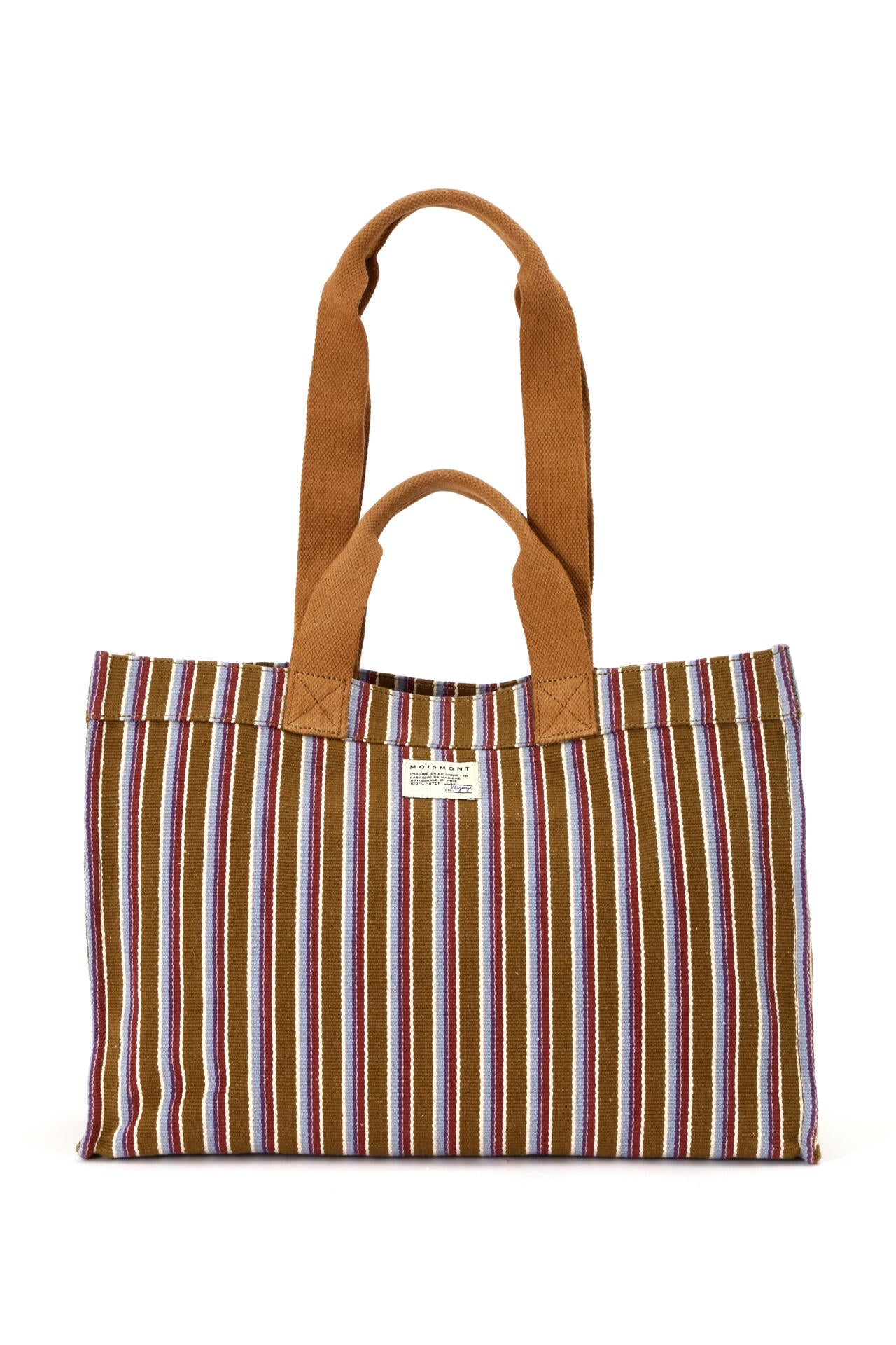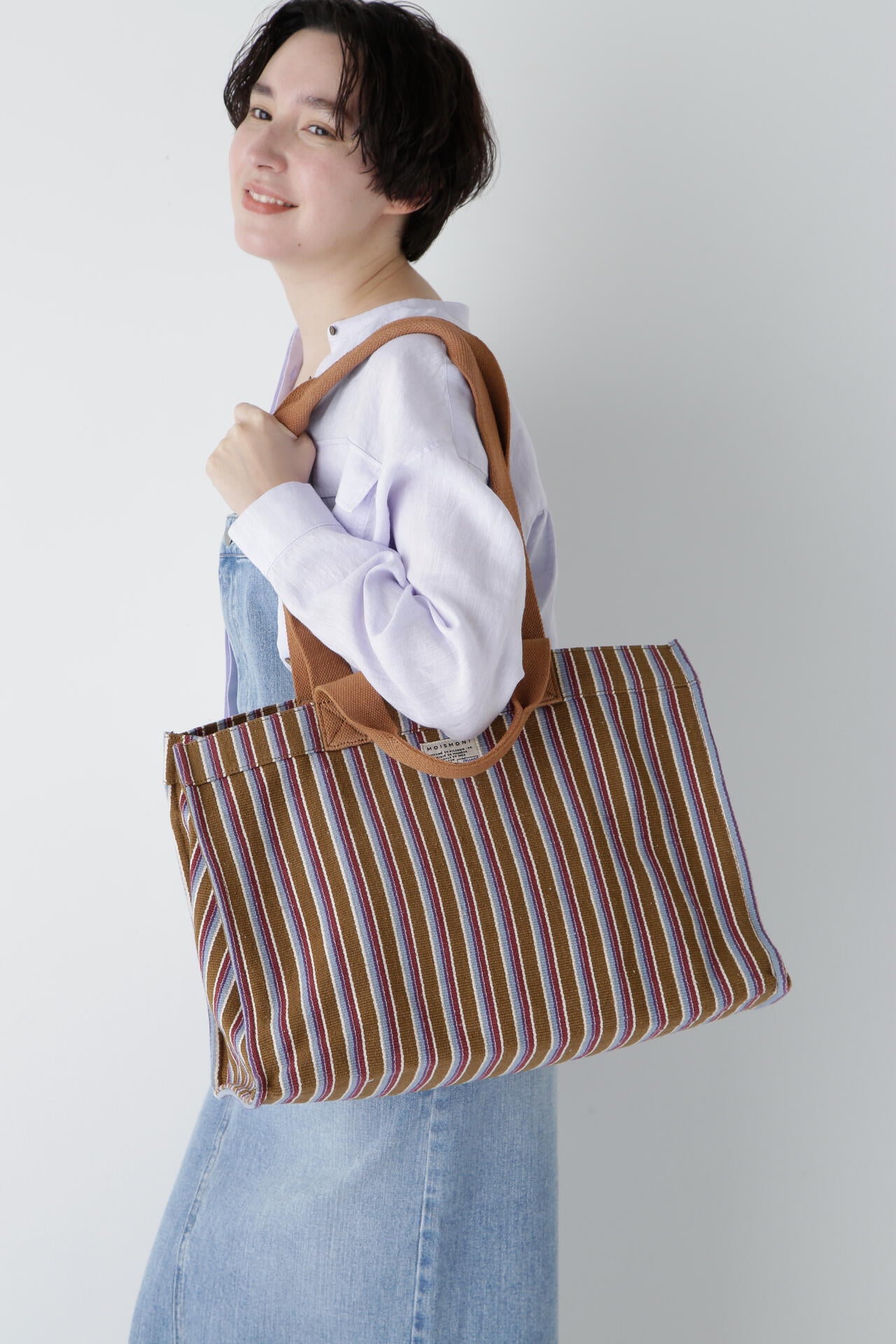 カラーリングが印象的な マルチストライプ柄のビッグサイズのトートバッグです。小旅行にも使用できるサイズです。