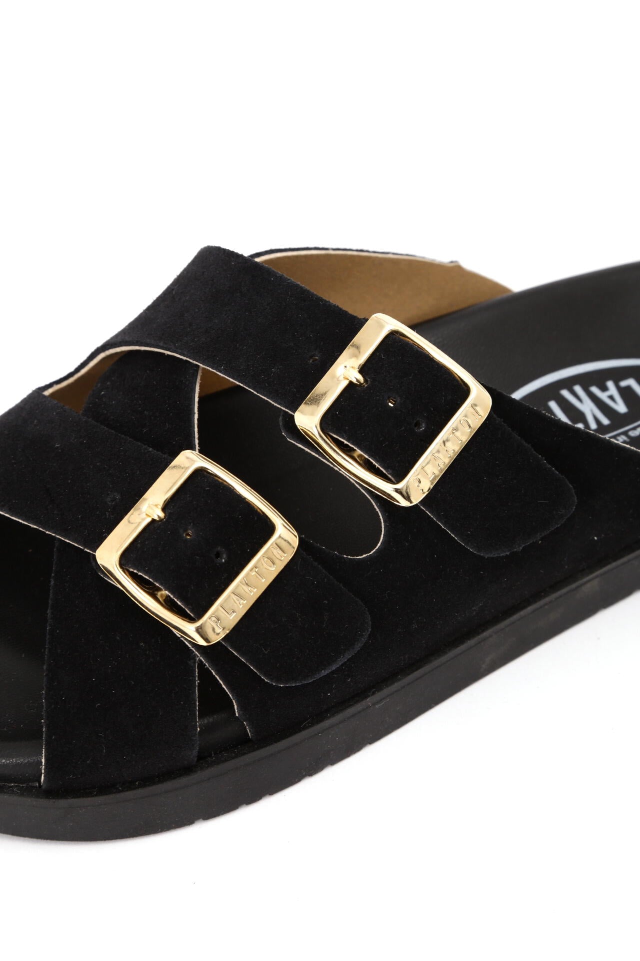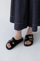 デイリーでありながら存在感のあるゴールドのバックルがスタイリッシュな雰囲気を演出します。フラットで安定感のある履きやすいサンダルです。