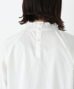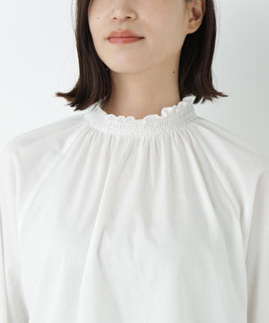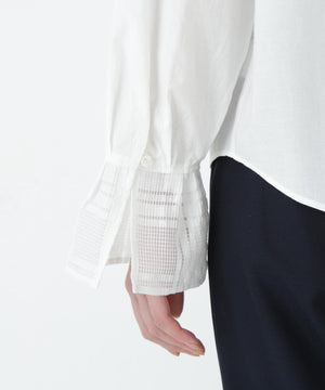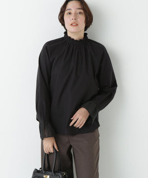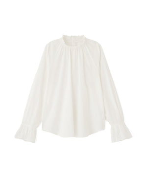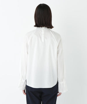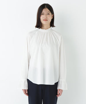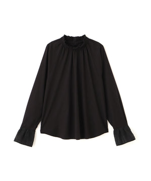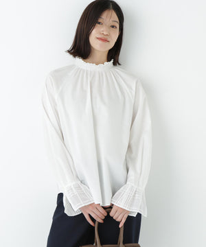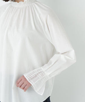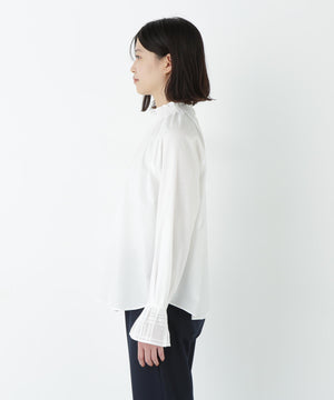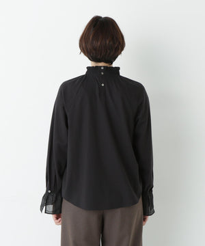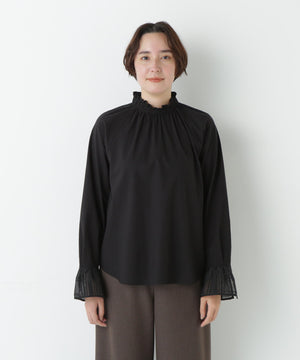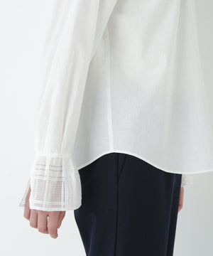1枚でも華やか、重ね着にもおすすめのブラウスです。襟はシャーリングになっており細かいギャザーが甘すぎない印象。袖カフスにはチェックのシアー素材を使用しています。