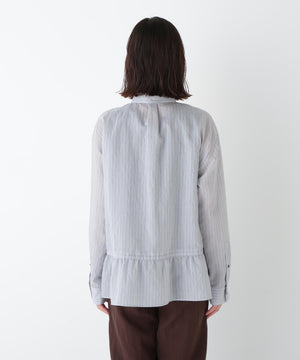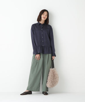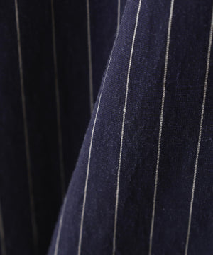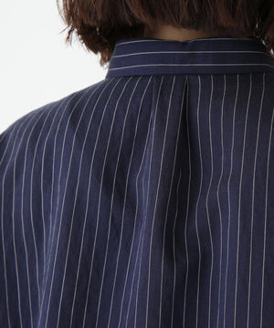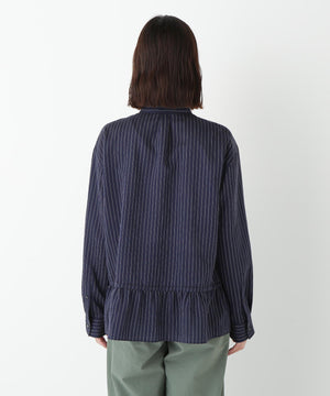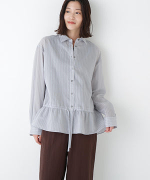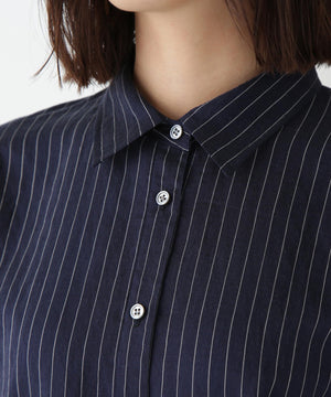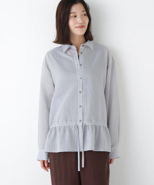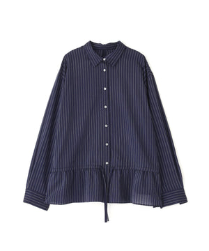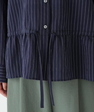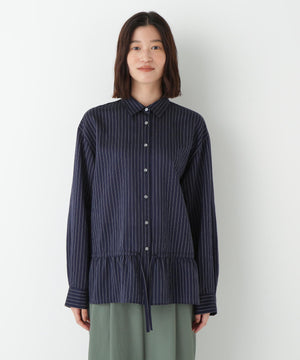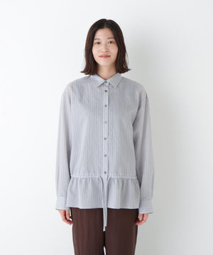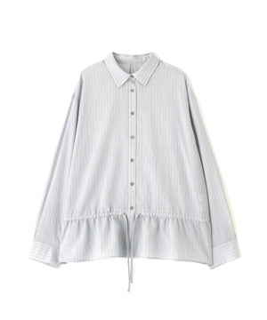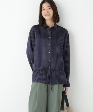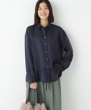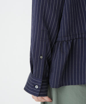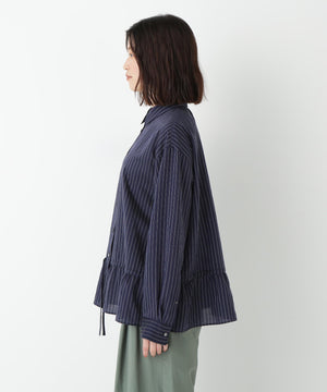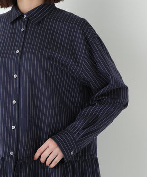 ストライプシャツにヘムフレアーデザインをポイントにしました。前は切り替えまでの前立て部分が開く仕様です。