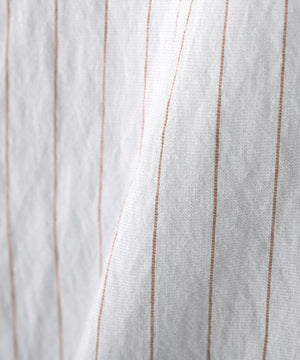 ナイロンとキュプラをベースにしてシルクとポリエステルが入った程よい透け感のあるストライプ素材です。ベーシックなネイビー×ホワイトとブルー×ブラウンの効かせ色の2色展開です。
