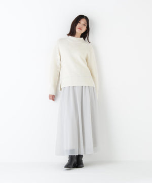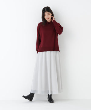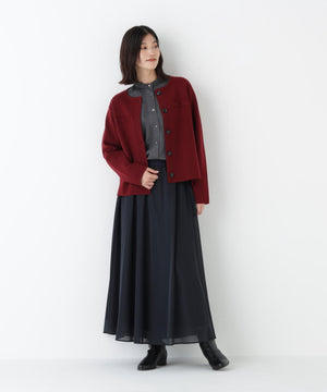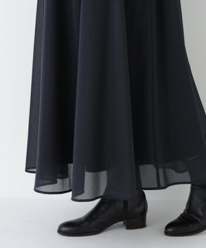 寒い期間を考慮したさらりとしながらもオールシーズン着用できるウール調合繊素材に、超軽量で空気をはらんだようなエアリーなシルエットを演出する梨地のような表面感のオーガンジートリコットを重ねています。