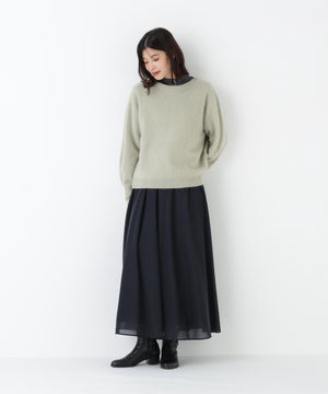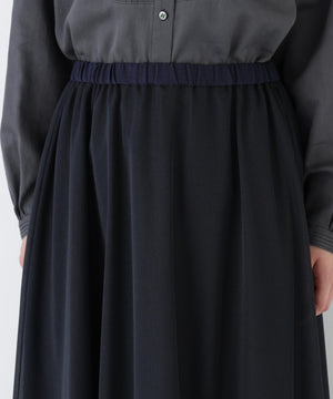 裏地を含め三重構造の、分量感がありながらも軽い印象のギャザースカートです。ウエストは平ゴム+ドロストひも仕様で着脱もストレスフリーです。
