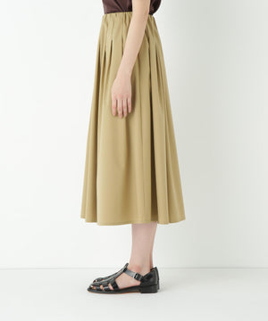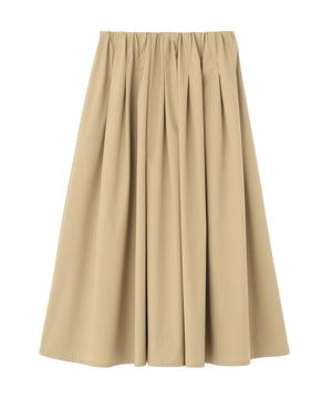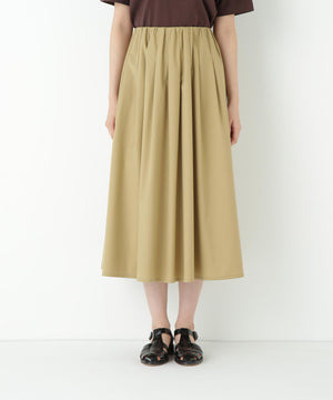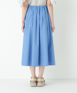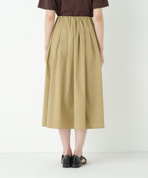 ウエストのゴムを内側に折り込んだ仕様のタックギャザースカートです。ウエスト部分で数か所縫い止ているのでウエスト周りは見た目程広がらずすっきりします。