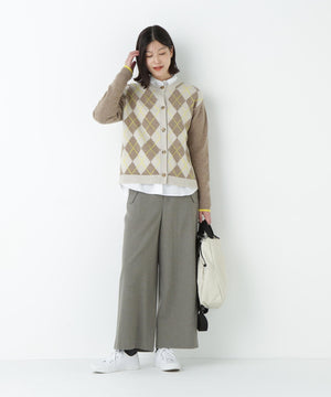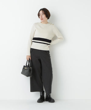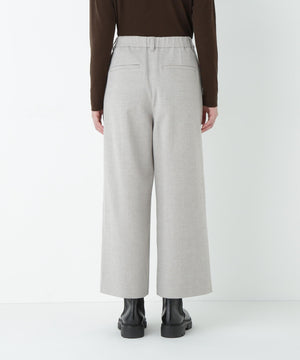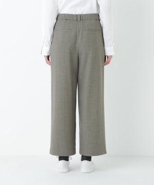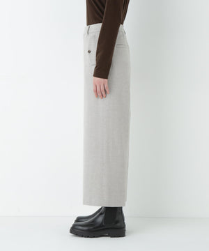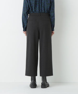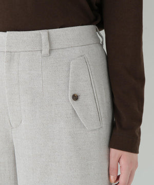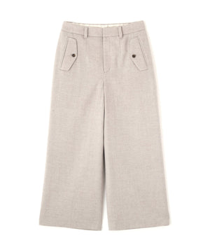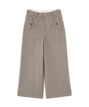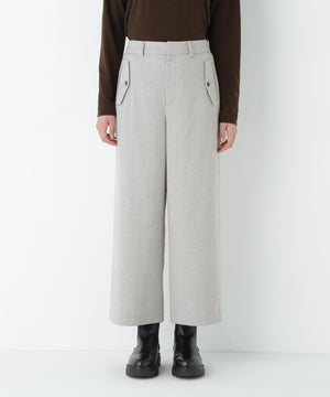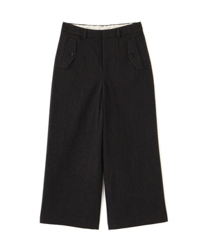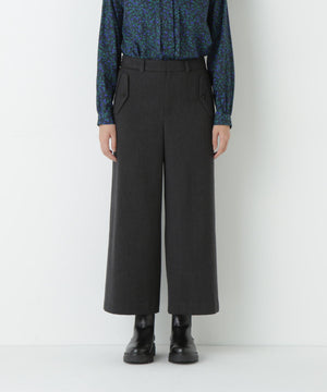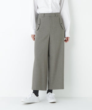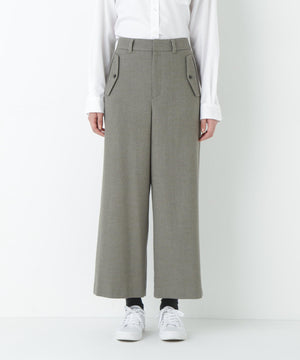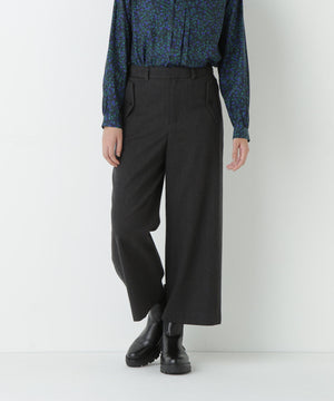 前に見えてくる両玉縁フラップポケットがポイントのガウチョパンツです。フラップは中にしまうことができ、スッキリとした見え方でも着用いただけます。