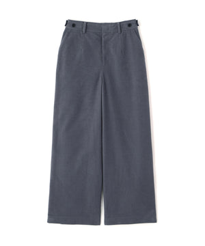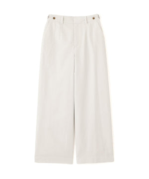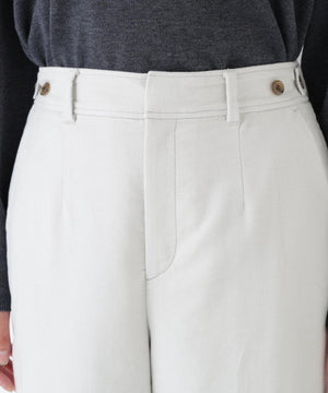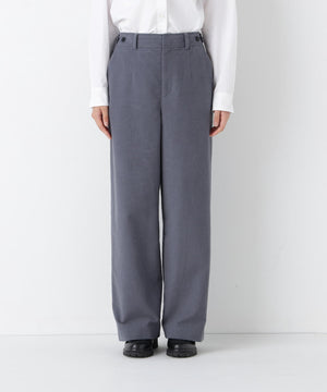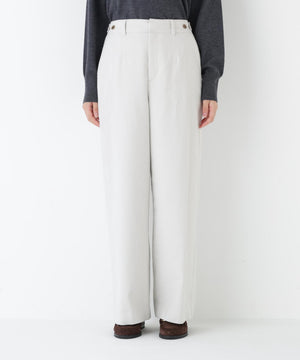 human woman定番セミワイドパンツです。ベルト脇タブがポイントです。タブの背中心側に表から見えないように平ゴムを仕込んでおり、サイズアジャストしたときにもたつかず綺麗なシルエットを保てます。