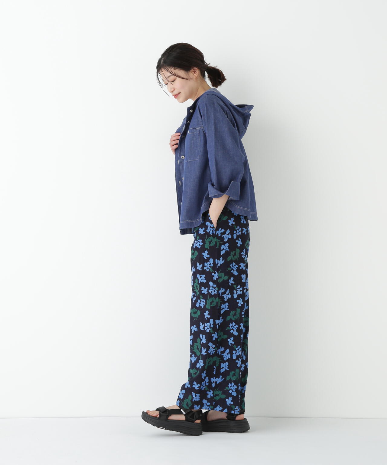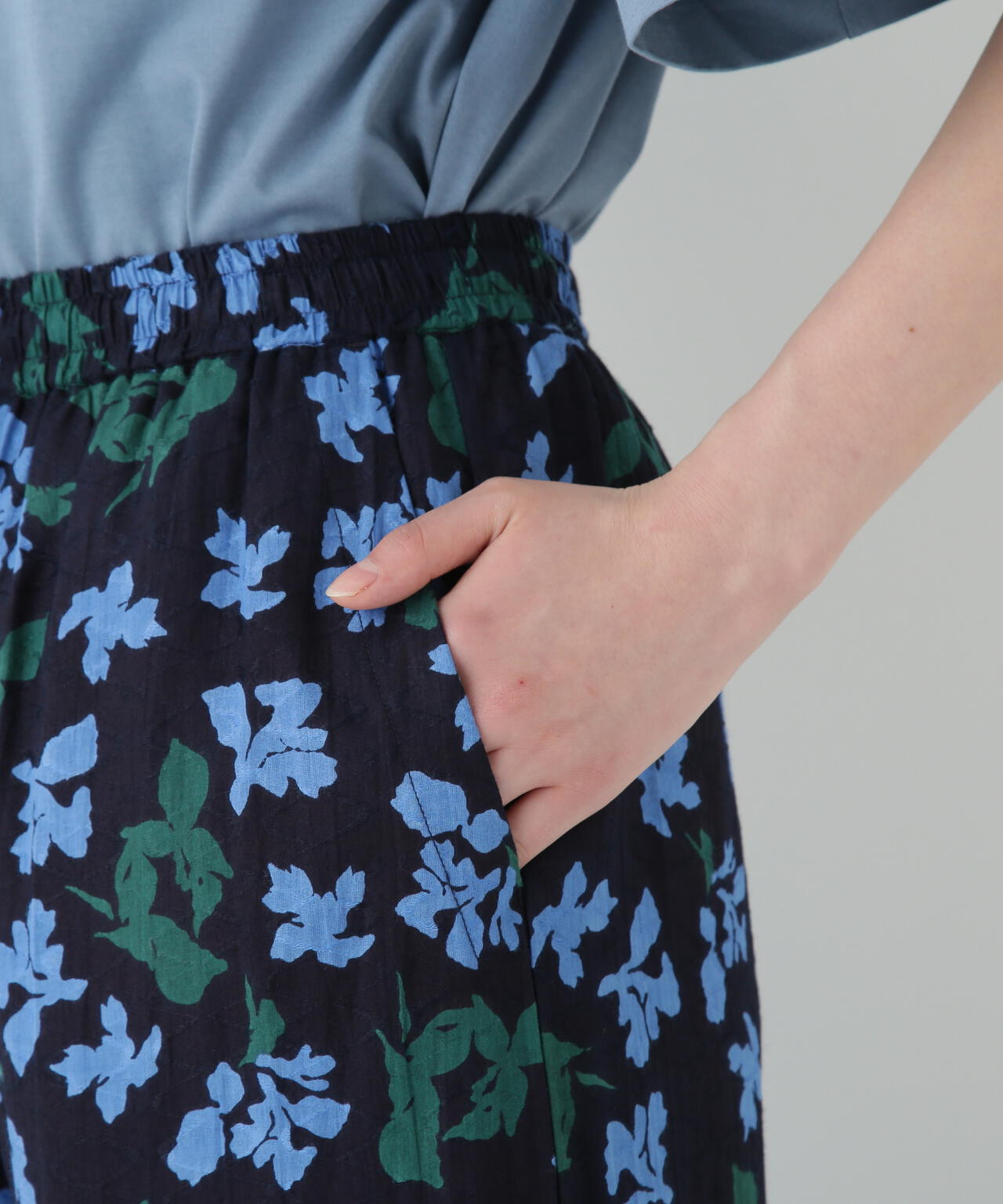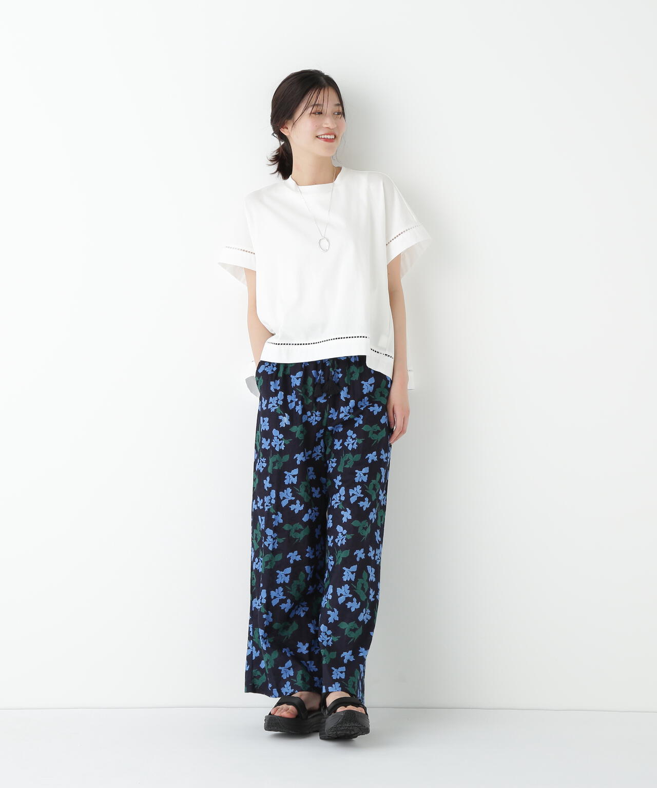 存在感がありながらもベーシックカラーで仕上げているので、シンプルなトップスはもちろんカラートップスを合わせても夏らしいボトムです。サンダル合わせがおすすめです。