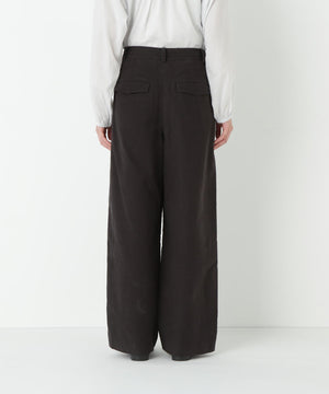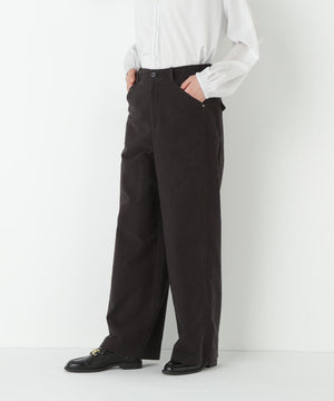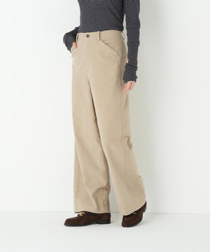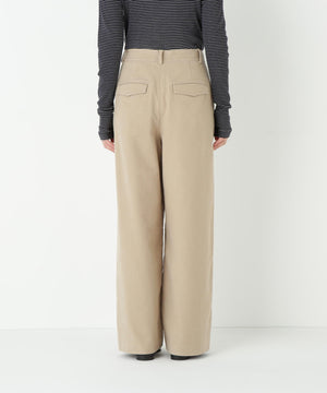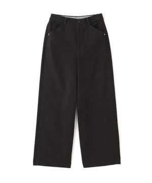 human woman定番セミワイドパンツです。ステッチワークと前ポケット端に見えてくるカシメ使いもポイントです。前に振った脇線は細見え効果も期待できます。