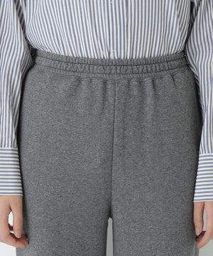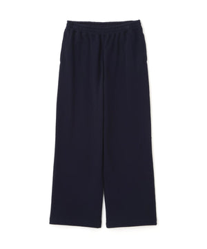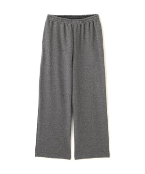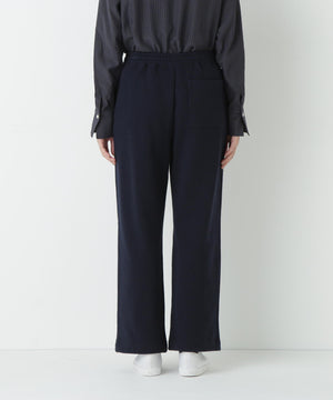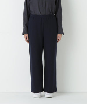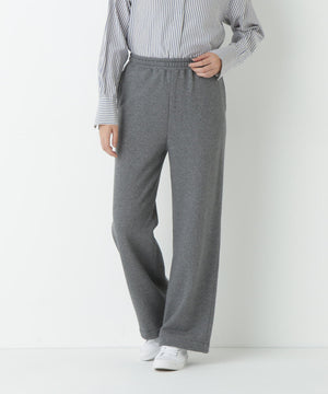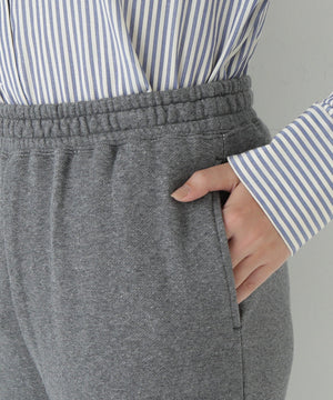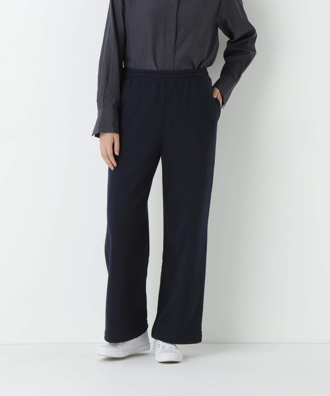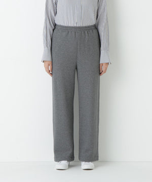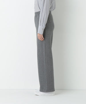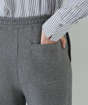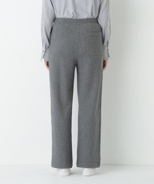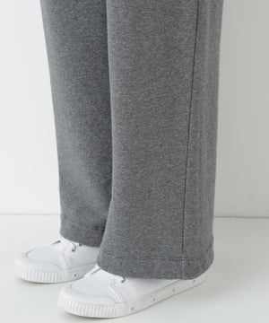 ベーシックな裏毛を使用したストレートパンツです。ポケット口にグログランリボンを付けてデザインポイントかつ手が入れやすい機能性をプラスしました。裾はスピンドルが入っているのでシルエット変化も楽しめます。ウェストは総ゴム、紐付きなので調節が可能です。