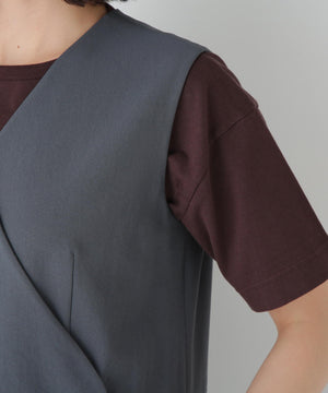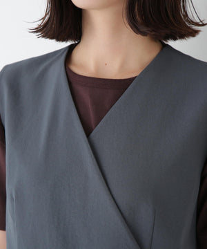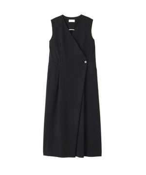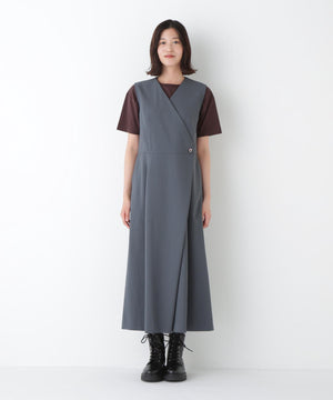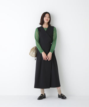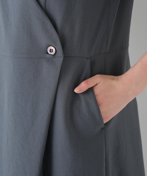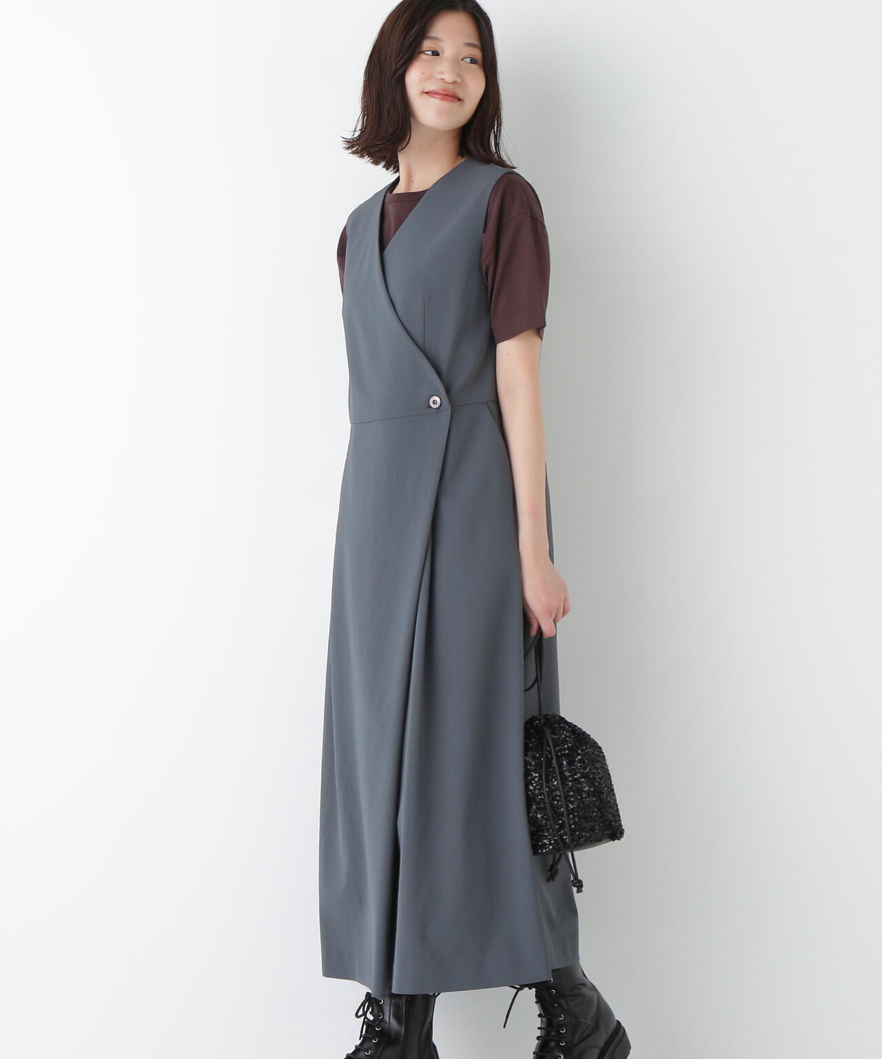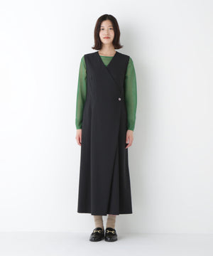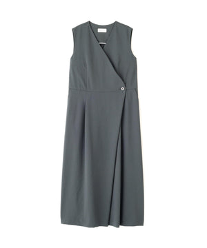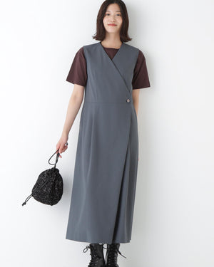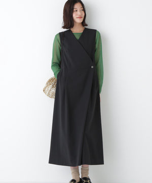 スカート部分奥タックのラップ風Vネックノースリーブワンピースです。