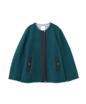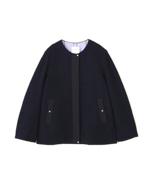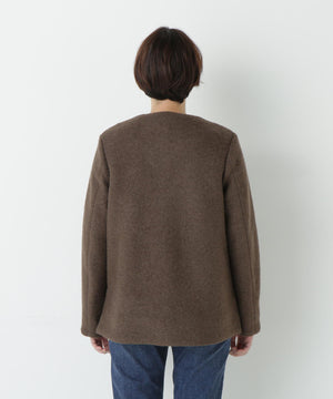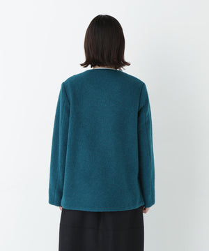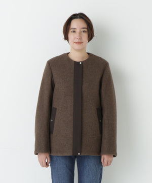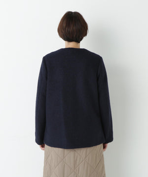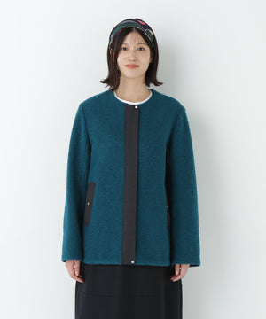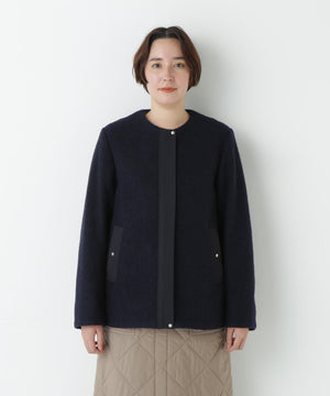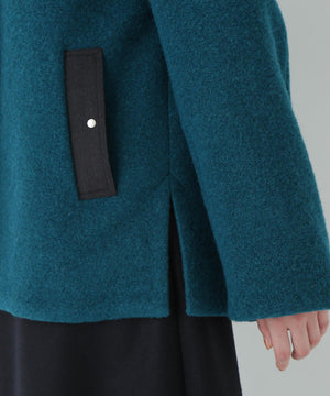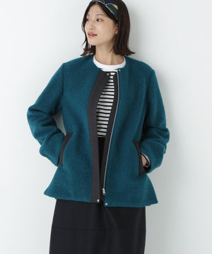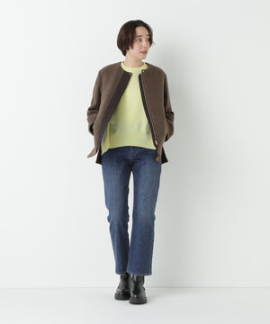 クルーネックのスライバージャケットです。今期は前開きジップデザインでおつくりしています。前端・ポケット部分の別布使いもポイントです。