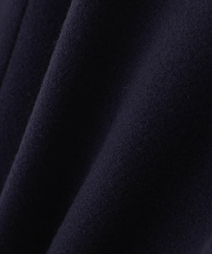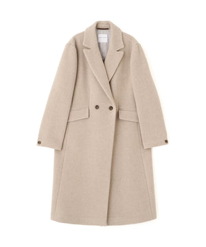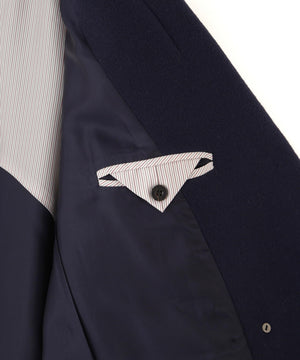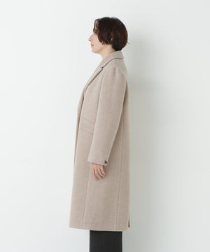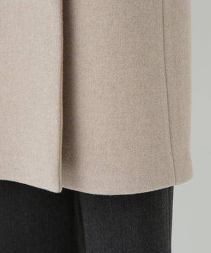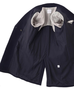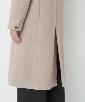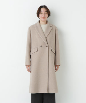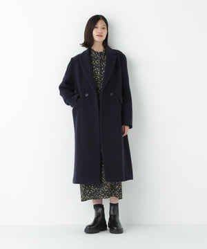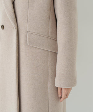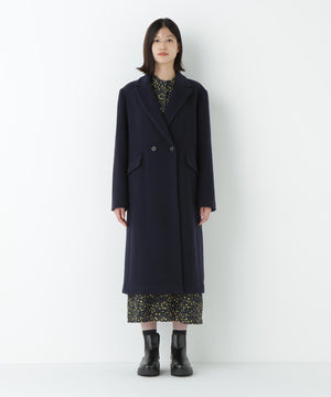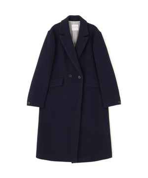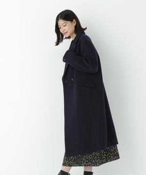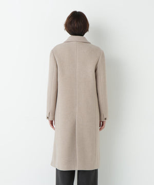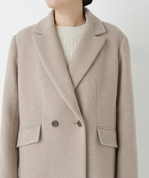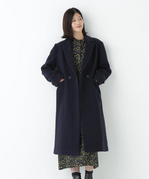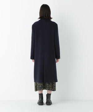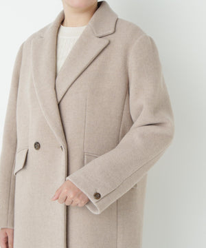 きちんと感のあるダブル前のチェスターコートをとても軽いダブルモッサの素材で作りました。袖裏、背裏、内ポケットをストライプ仕様にして本格的な内装の作りです。