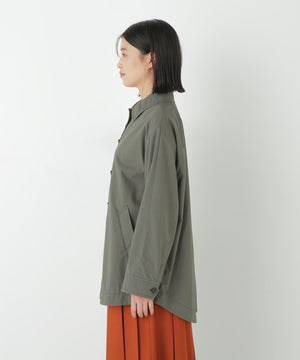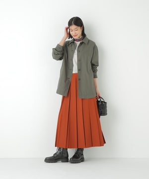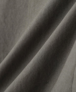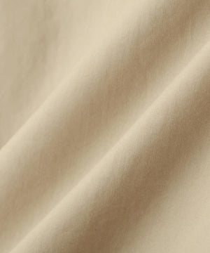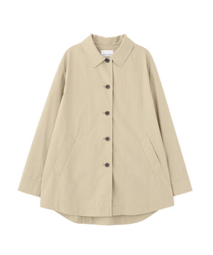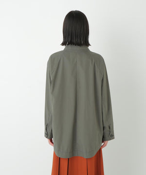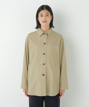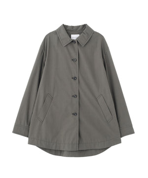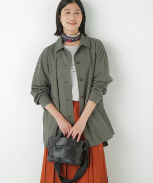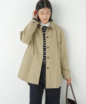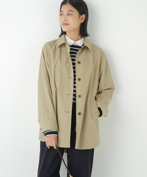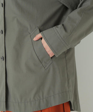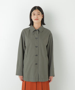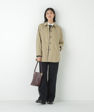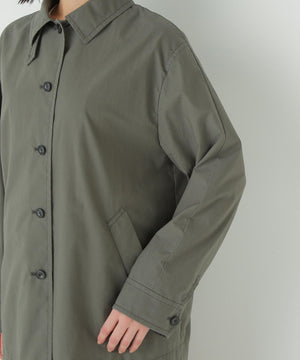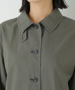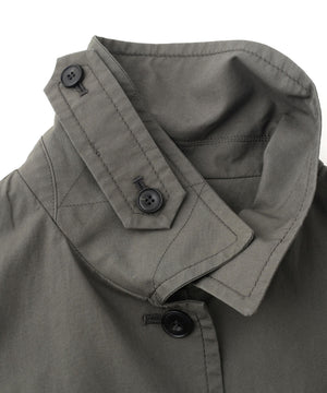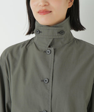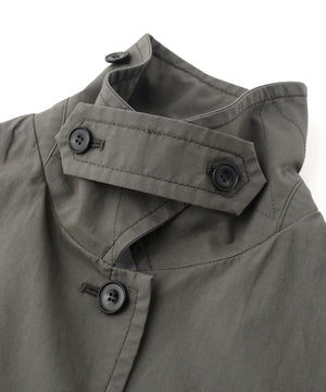 シャツ地で仕上げた軽いステンカラーコートです。釦でサイズアジャストできる袖口カフスや、首元のチンベルトがポイントです。チンベルトは衿奥の釦に留めることもできます。