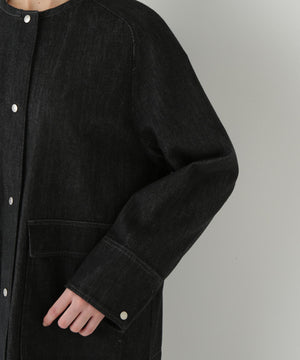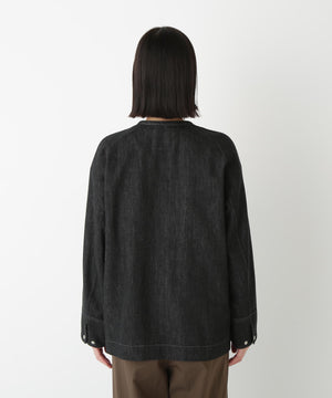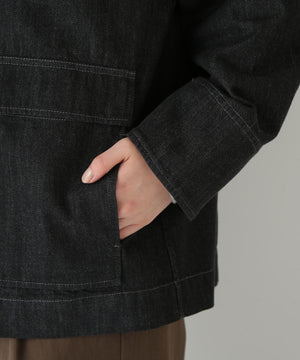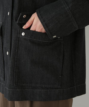 シンプルなデザインのカバーオール風デニムブルゾンです。すっきりしたクルーネックのラグランスリーブデザインにフラップポケットは横からも手が入る仕様にしています。