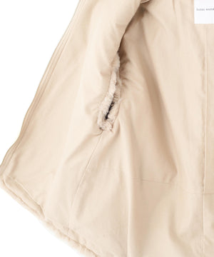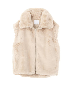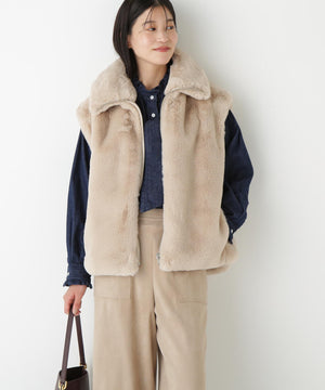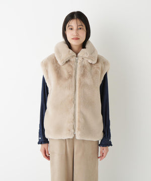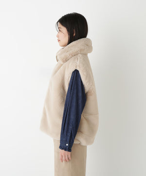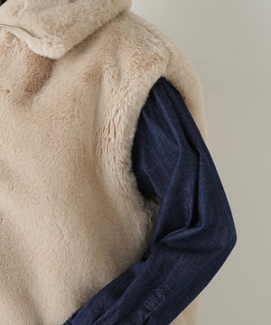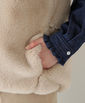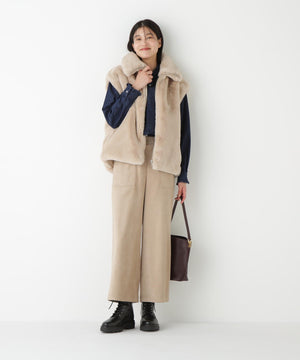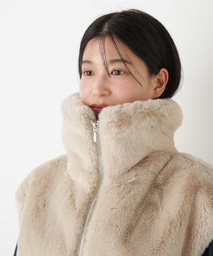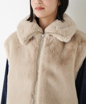 大きめ衿がキャッチーなフレンチスリーブフェイクファージップジレです。毛足で目立たないように後ろ身頃に切り替えとタックを入れて程よいコクーンシルエットを表現しています。ファスナーを噛まないように前端にコットンテープを施しています。
