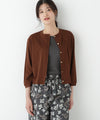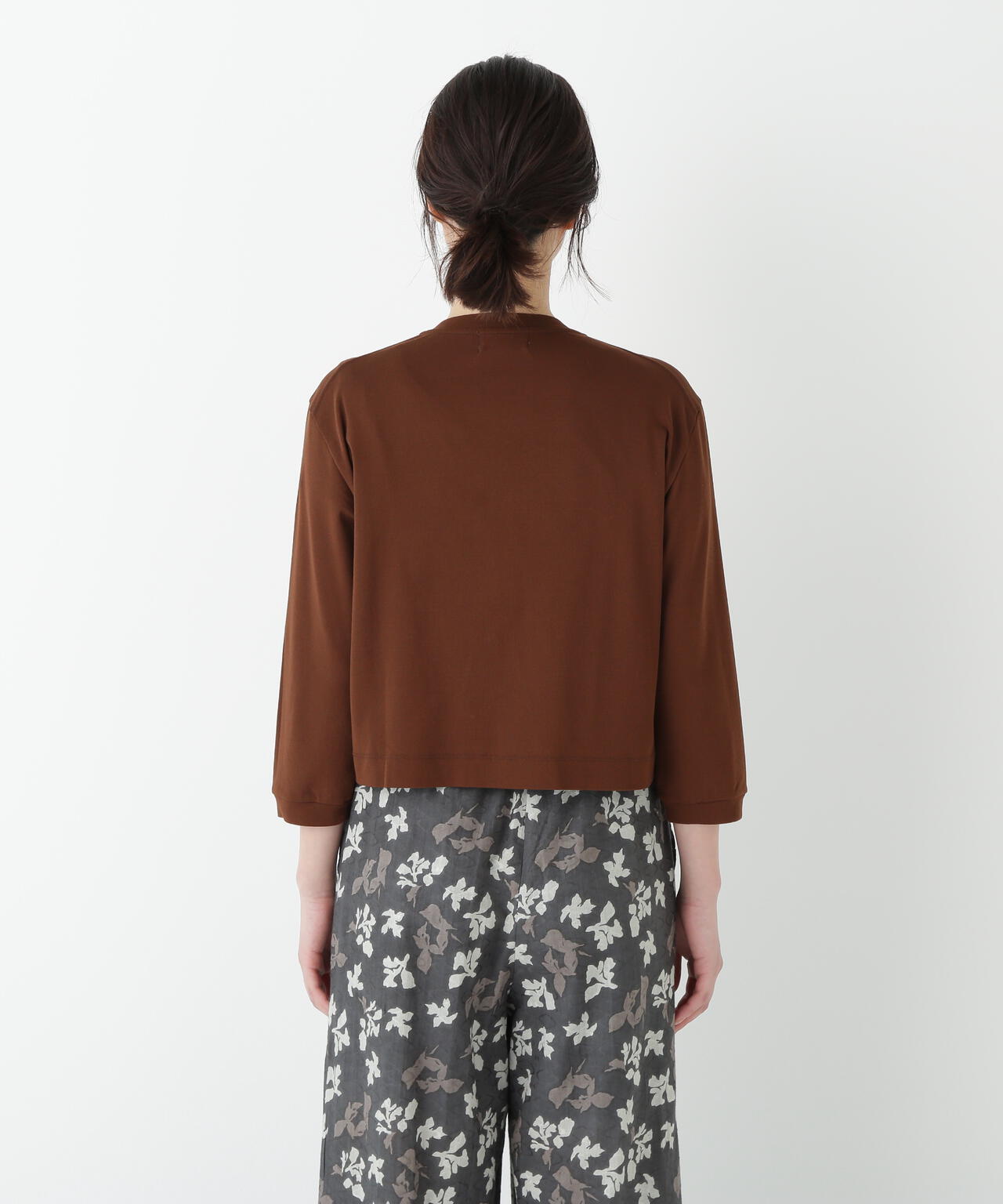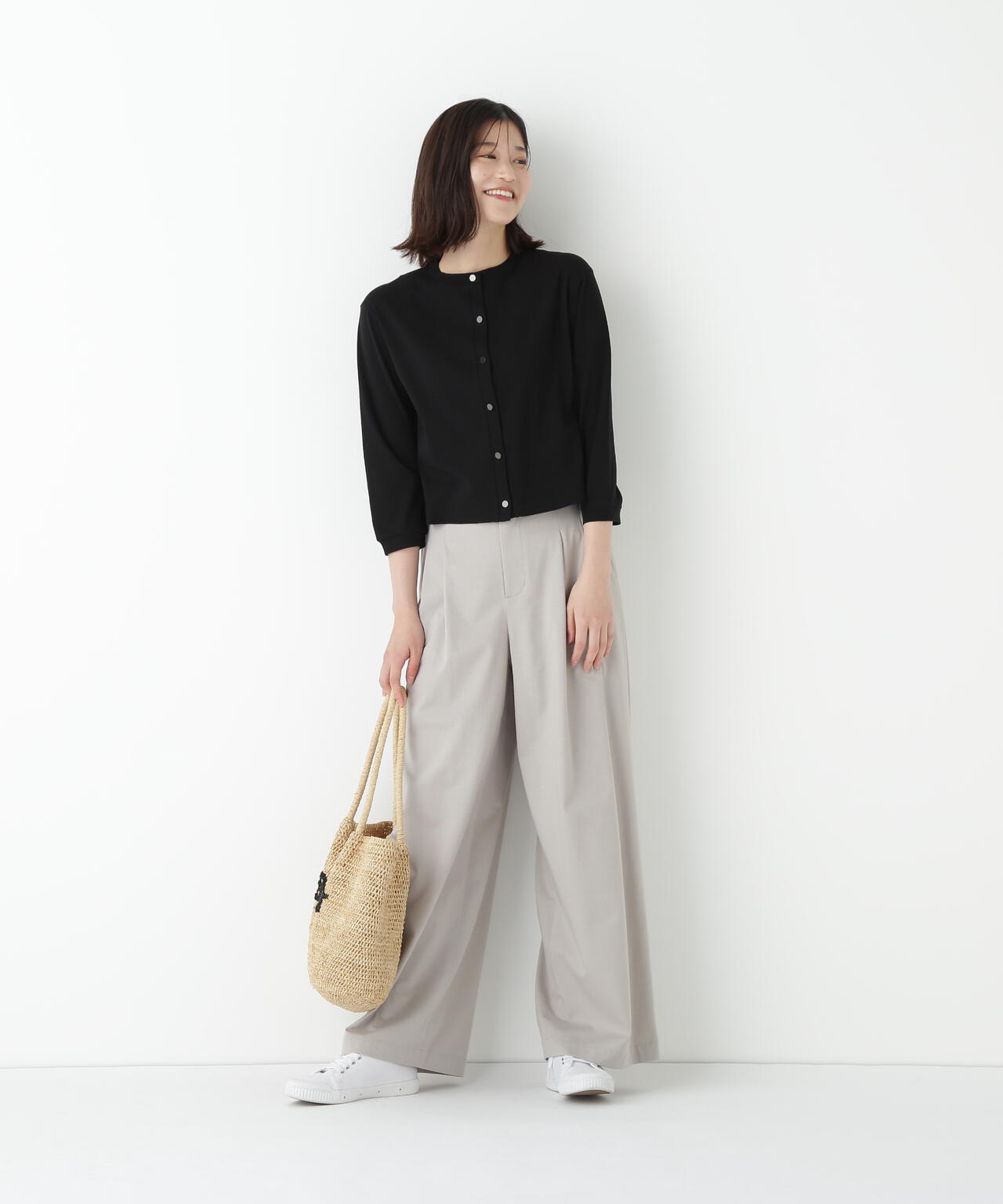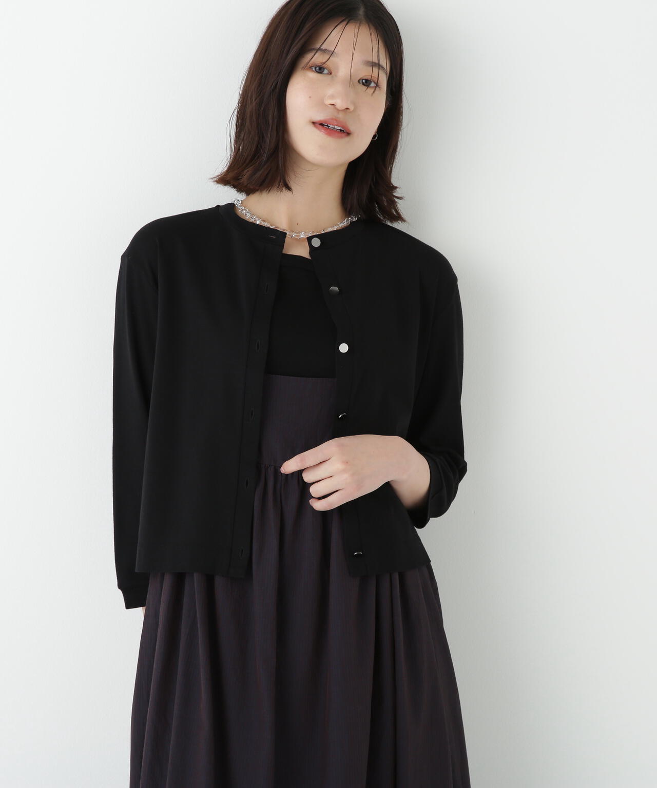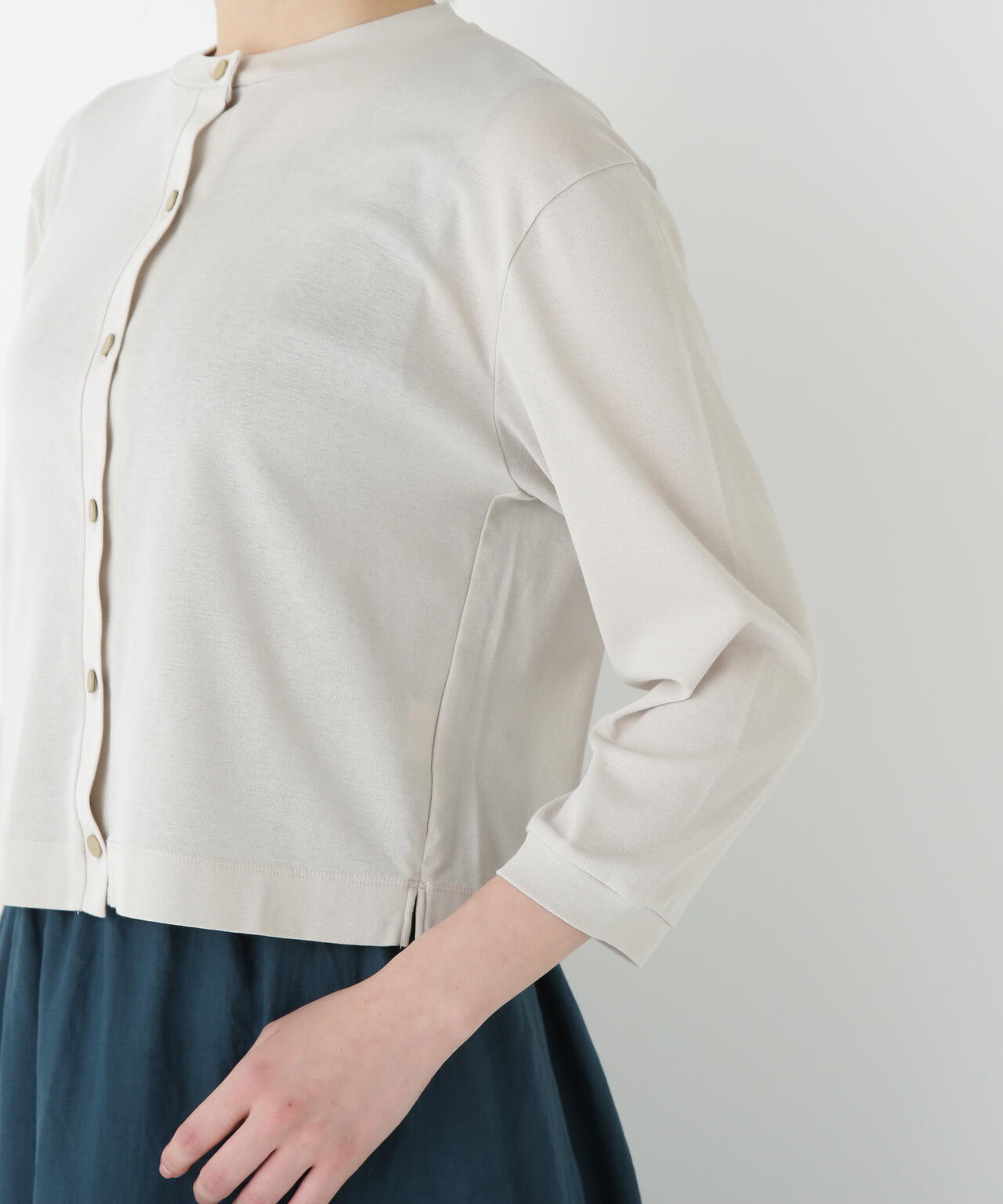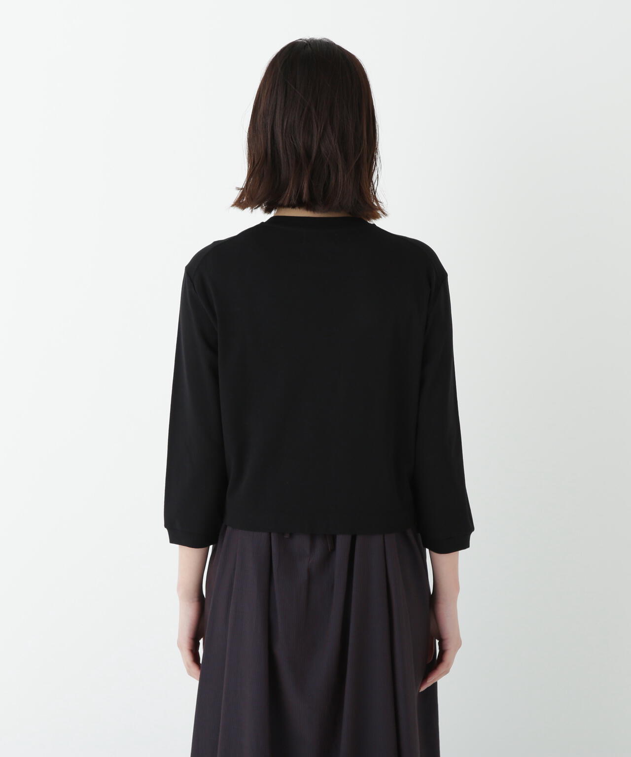 短丈が特徴のクルーネックカーディガン。7分袖で軽い印象です。金属がアクセントになり、きれい目シーンでも活躍します。