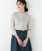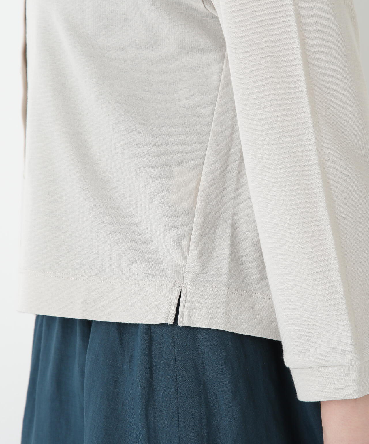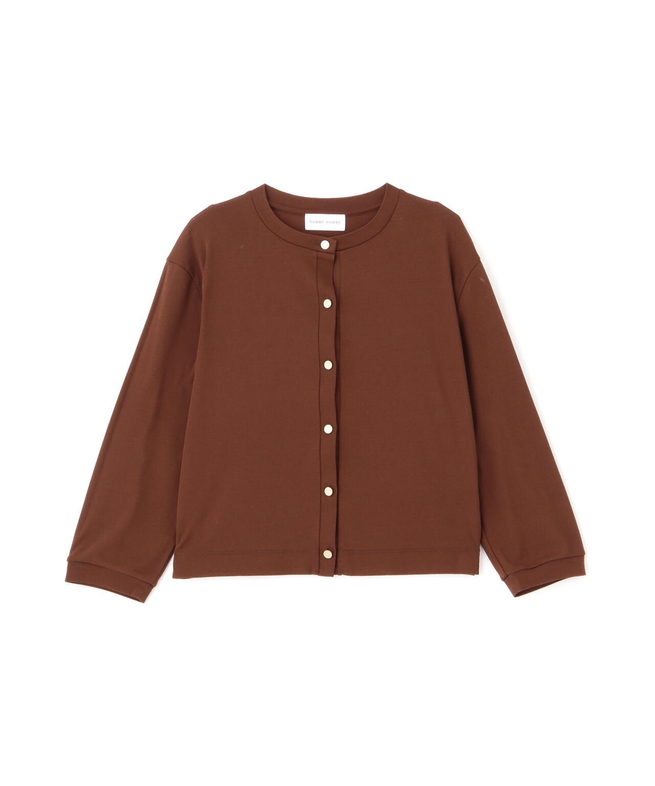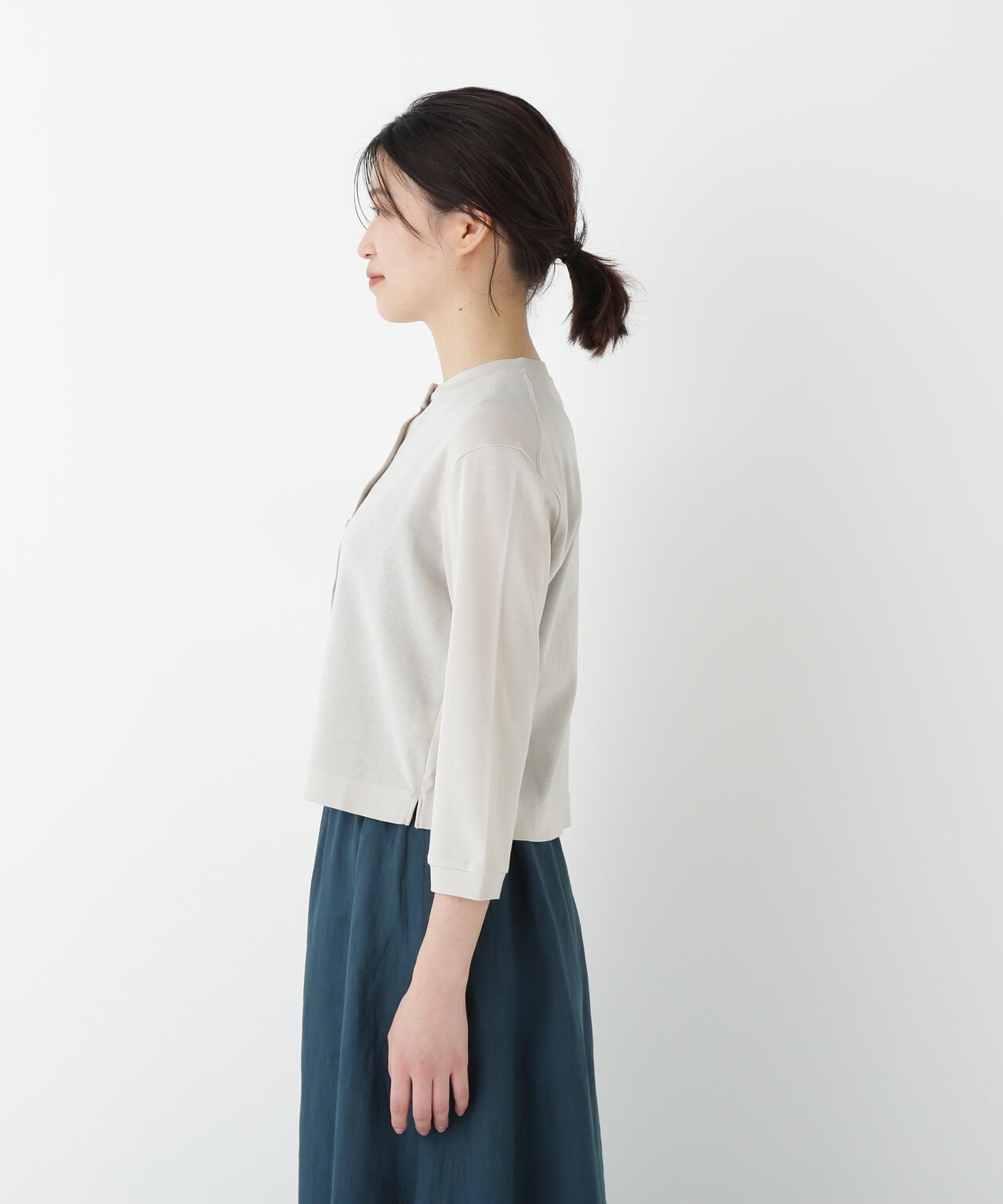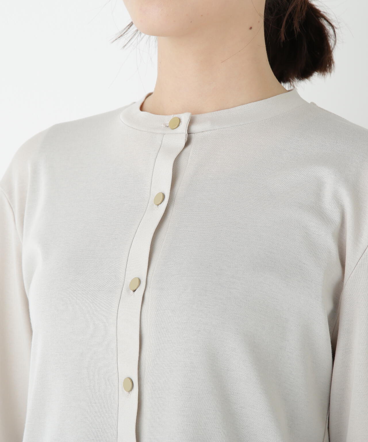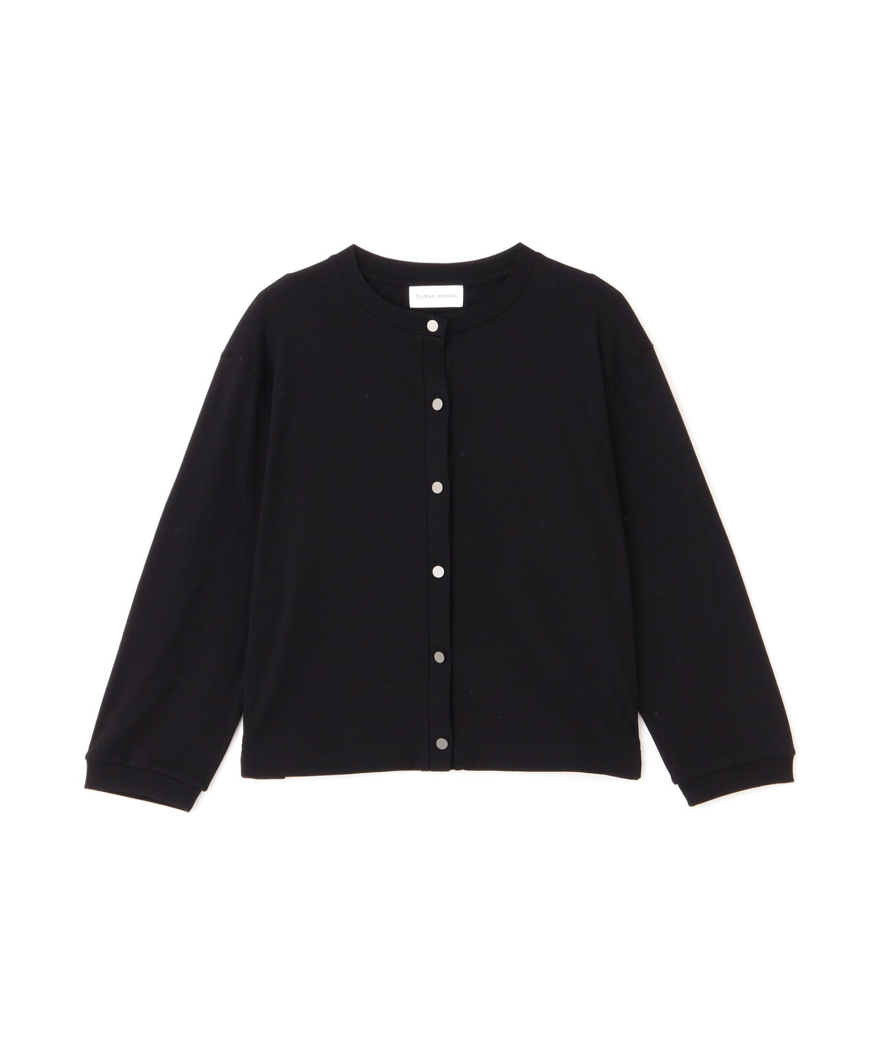 短丈が特徴のクルーネックカーディガン。7分袖で軽い印象です。金属がアクセントになり、きれい目シーンでも活躍します。