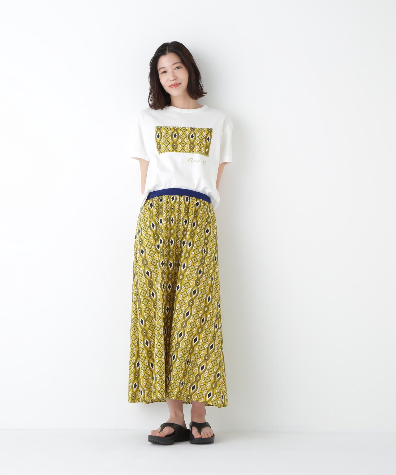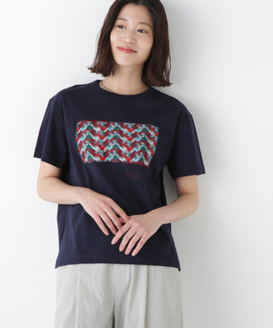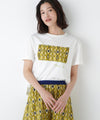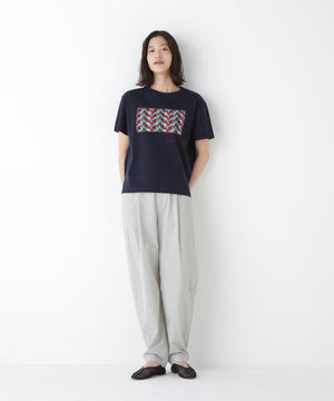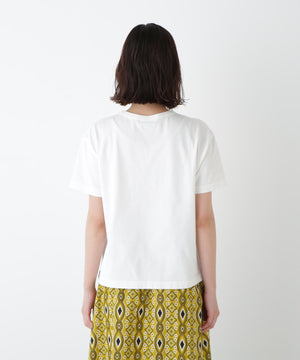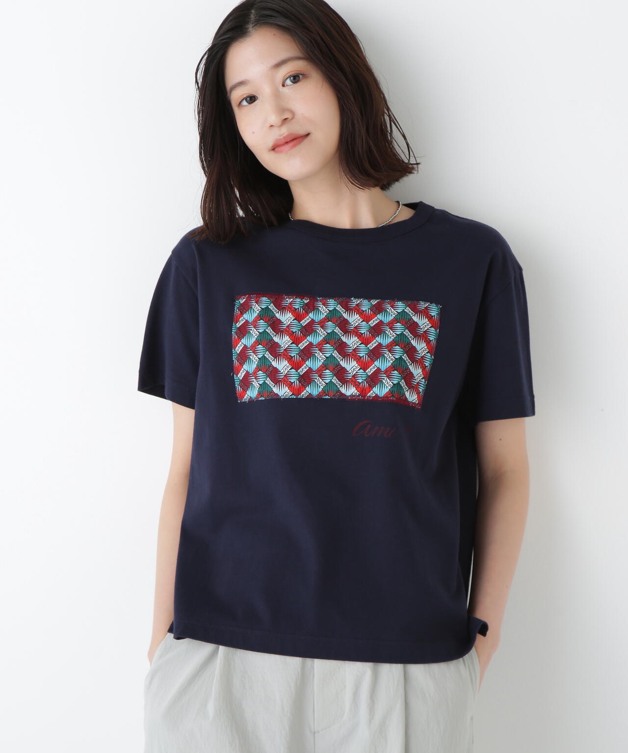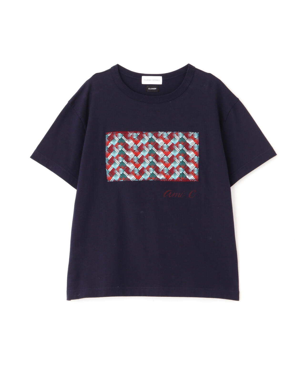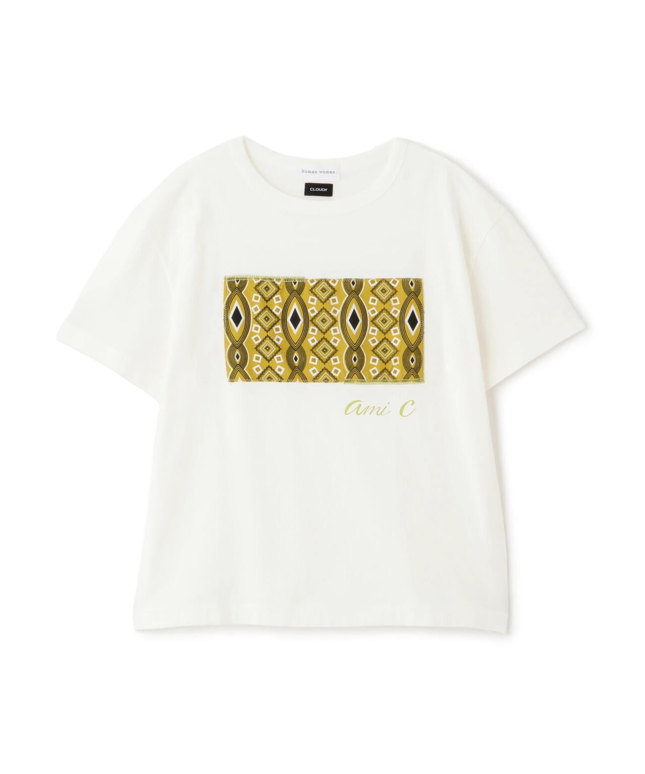 アフリカンプリントを胸元にパッチワークしたカジュアルなクルーネックTシャツです。ステッチの種類やカラー使いで楽しい感じを演出しました。昨年に引き続きami cのロゴプリントも入っています。