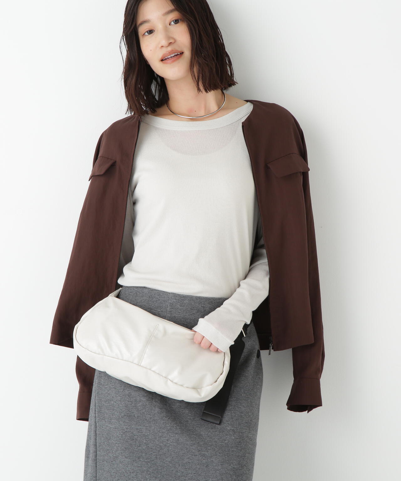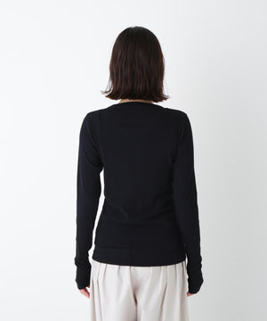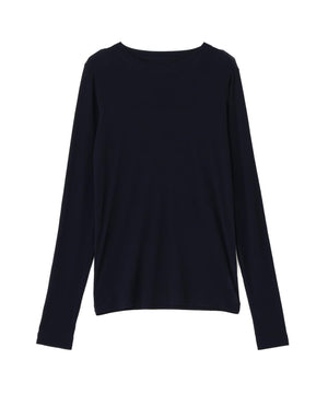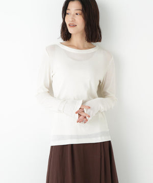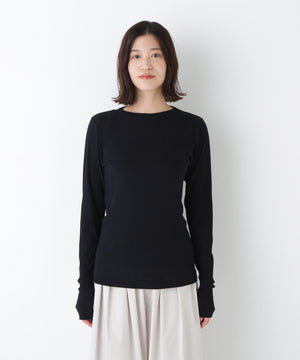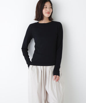 毎年人気のシアーテレコタートルと同素材でクルーネックの長袖をおつくりしました。衿はカジュアルに太めのバインダー仕様。袖はタートルより長めに設定しています。